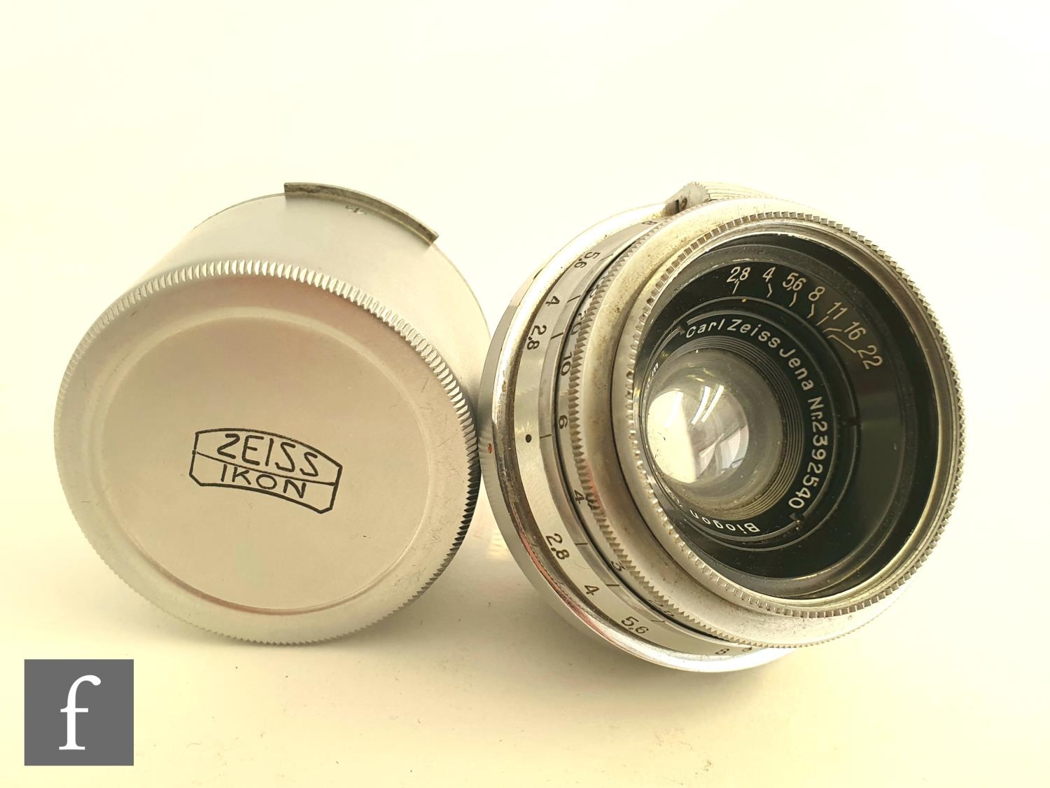 A Carl Zeiss Jena Biogon f:2.8, f=3.5cm Chrome wide angle lens Contax rangefinder lens, serial number 2392540, lacking cap.