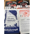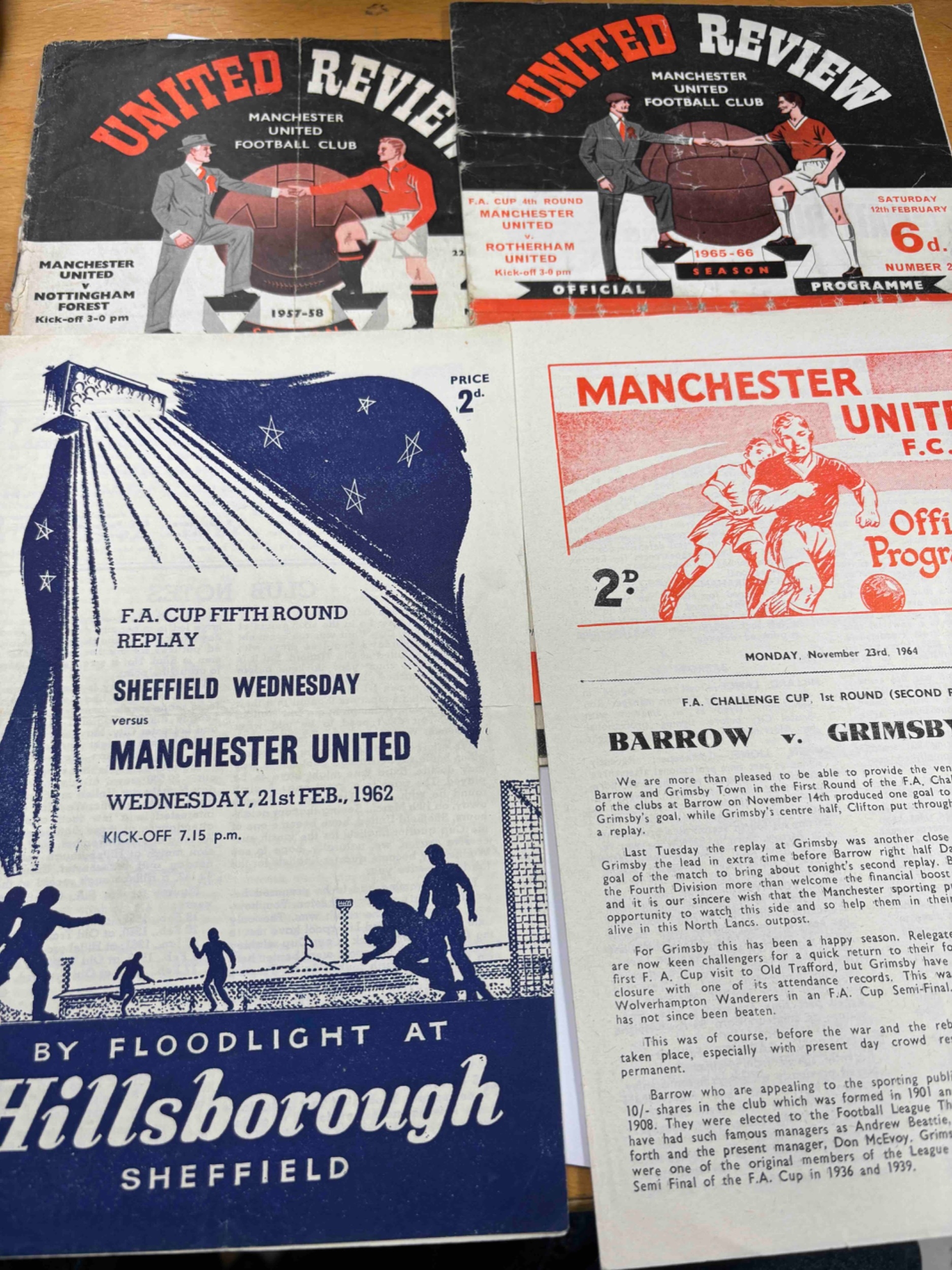 Manchester United FAC home 1957/8 N Forest worn with token 1965/6 Rotherham cr, folded, away 1961/2 Sheffield W replay 4 pages plus 1964/5 Barrow v Grimsby second replay at Old Trafford 4 pages