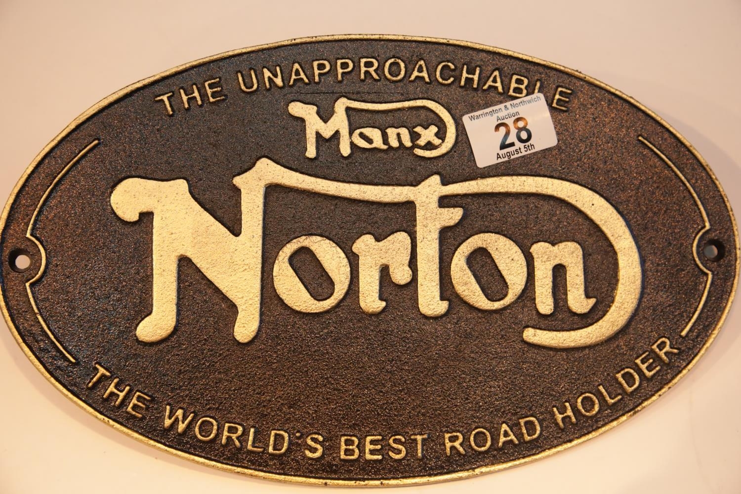 Cast iron Manx Norton sign, 38 x 20 cm. P&P Group 2 (£18+VAT for the first lot and £2+VAT for subsequent lots)