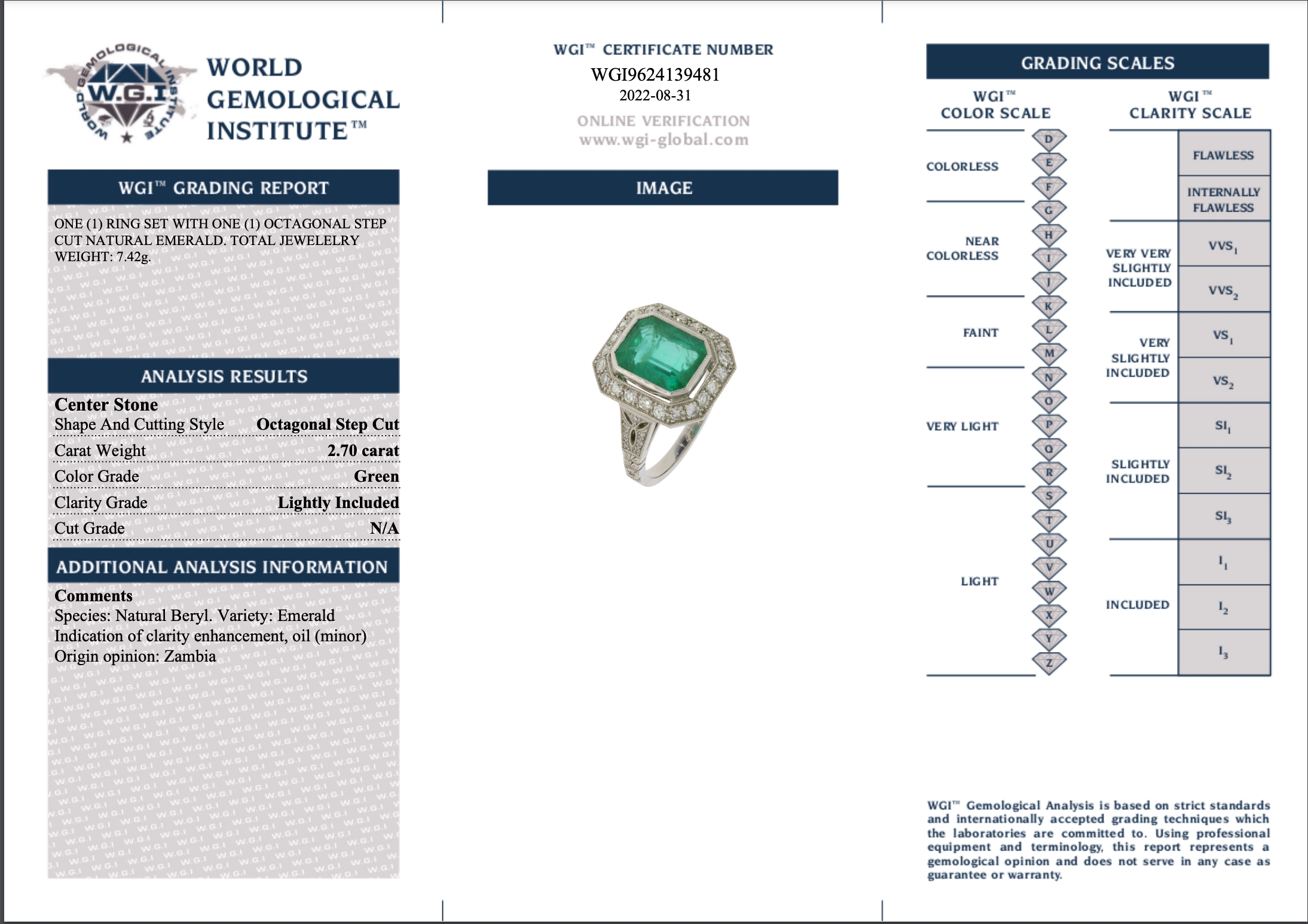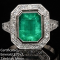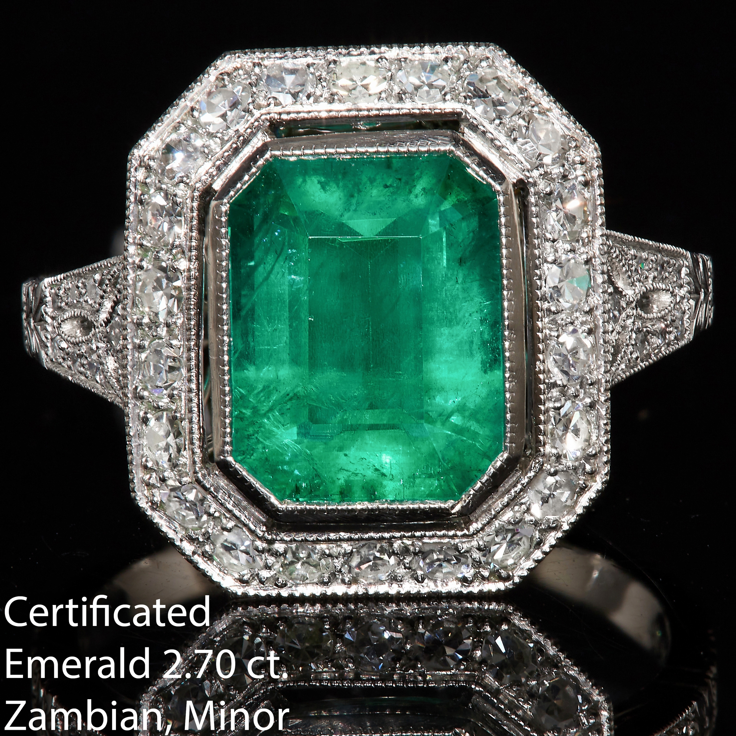 CERTIFICATED EMERALD AND DIAMOND CLUSTER RING, set with a central emerald of 2.70 ct. Surrounded with diamonds and diamonds on the shoulders totalling approx. 0.45 ct. Size N. 7.4 grams. Accompanied by World Gemological Institute report No. WGI9624139481 Stating that the 2.70 ct. emerald is Natural, Zambian origin, Indications of minor clarity enhancement.