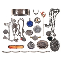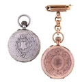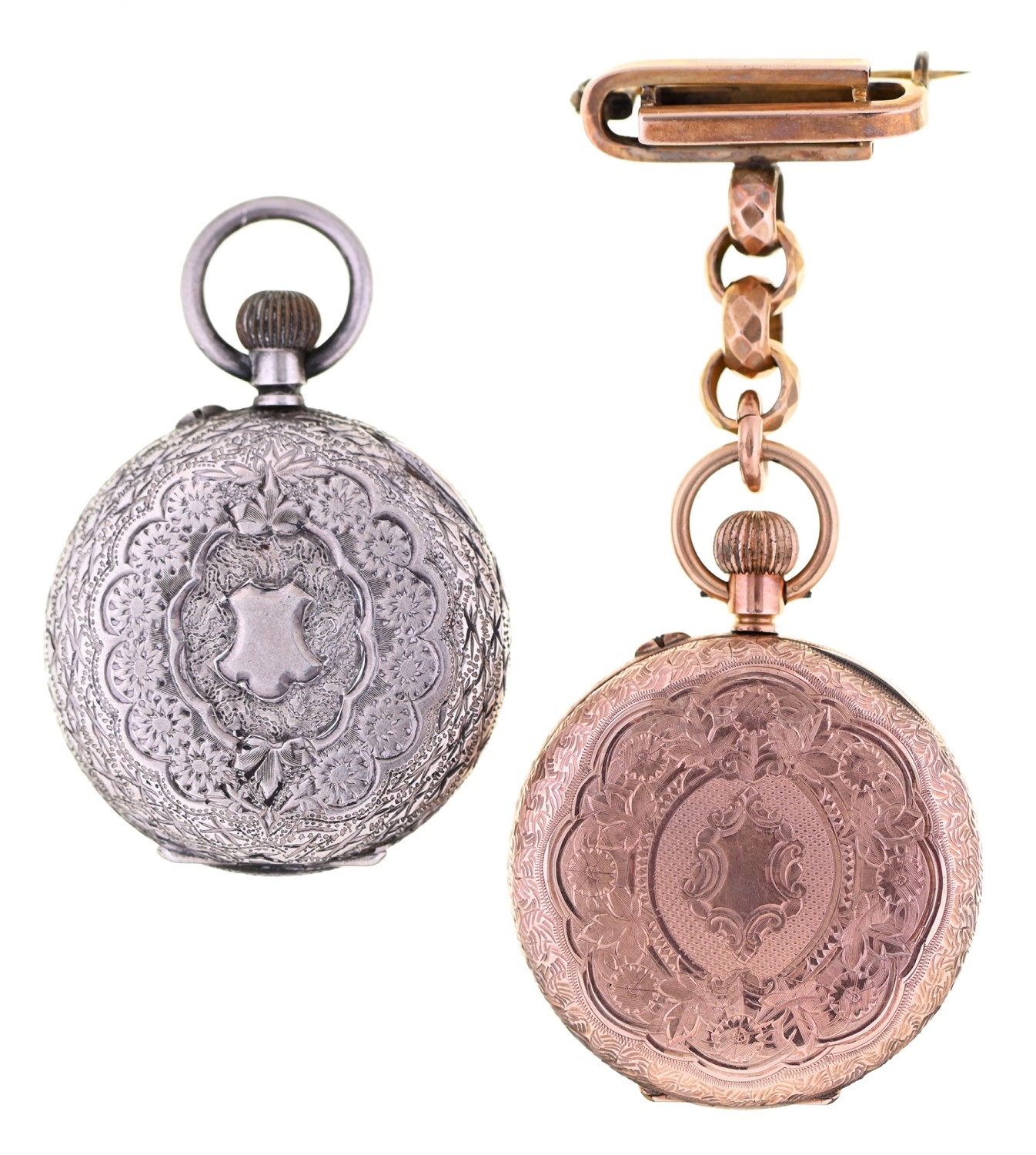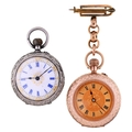 A Swiss gold keyless cylinder lady's watch, c1900, in engine turned and engraved case, 5.4cm diam, suspended from a gold brooch, 33g and a similar contemporary silver watch (2)