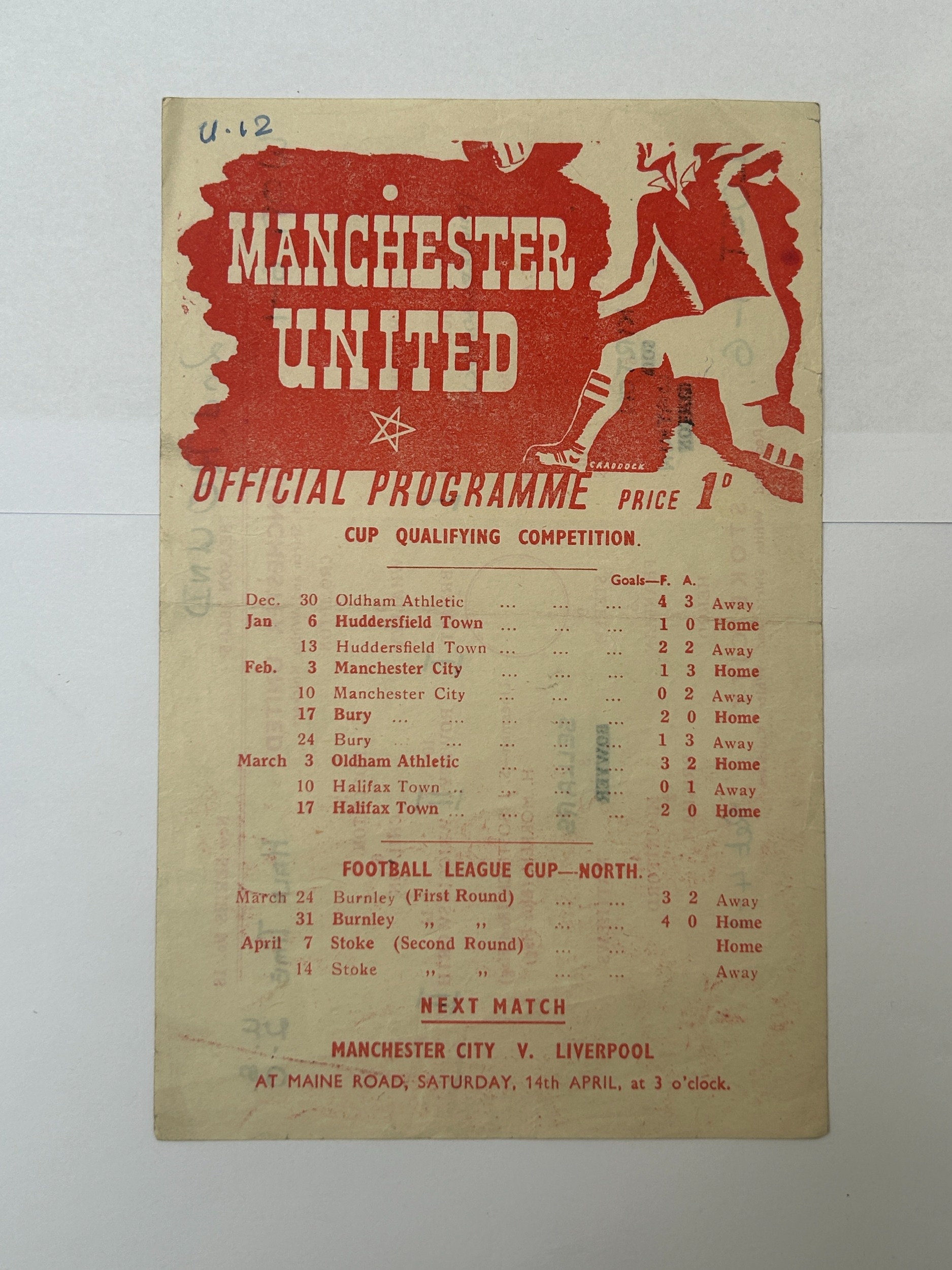 MANCHESTER UNITED VS STOKE CITY 1944/45 WAR CUP SECOND ROUND, 7/4/45, SINGLE SHEET ISSUE. SOME CREASING, SCORERS RESULT ETC NOTED DOWN.