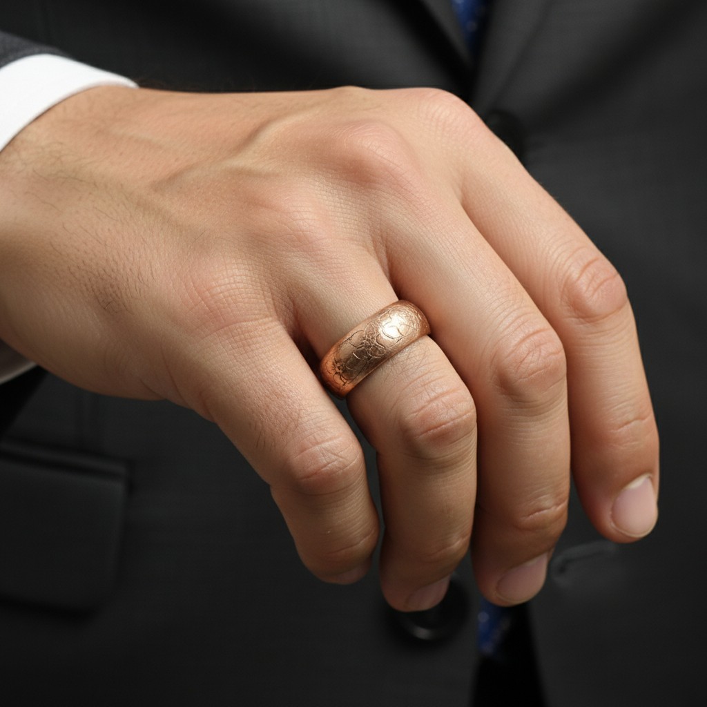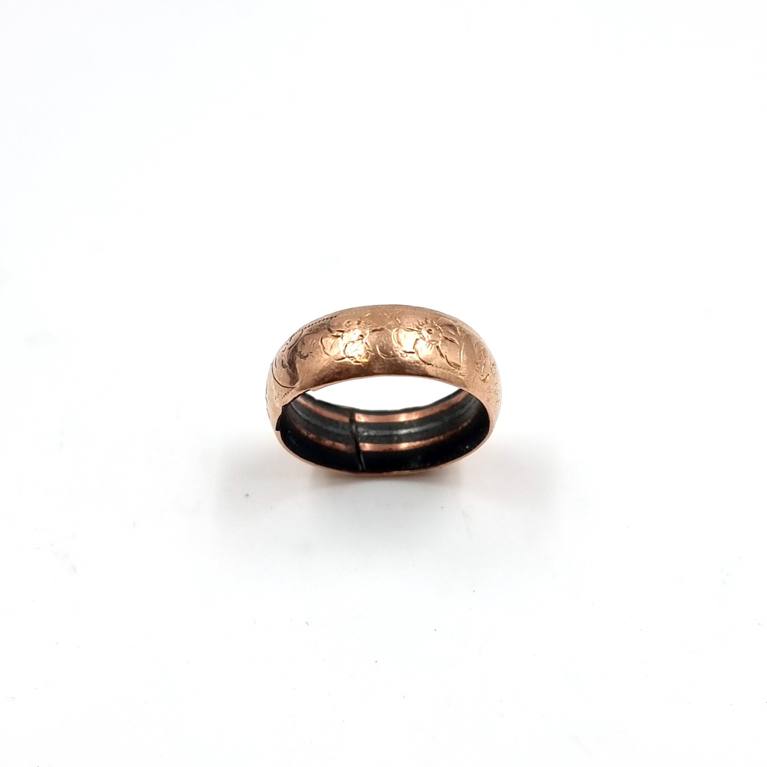 Star Lot: A fine antique nine carat gents gold ring with incised scroll and foliate detailing. Size O, Weight - 4.41 grams. Boxed.