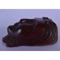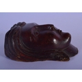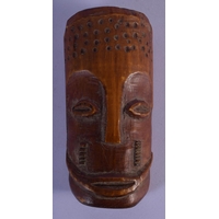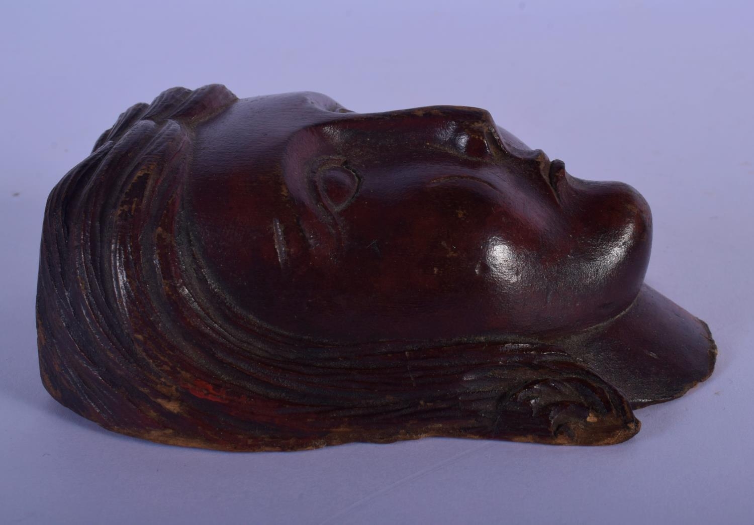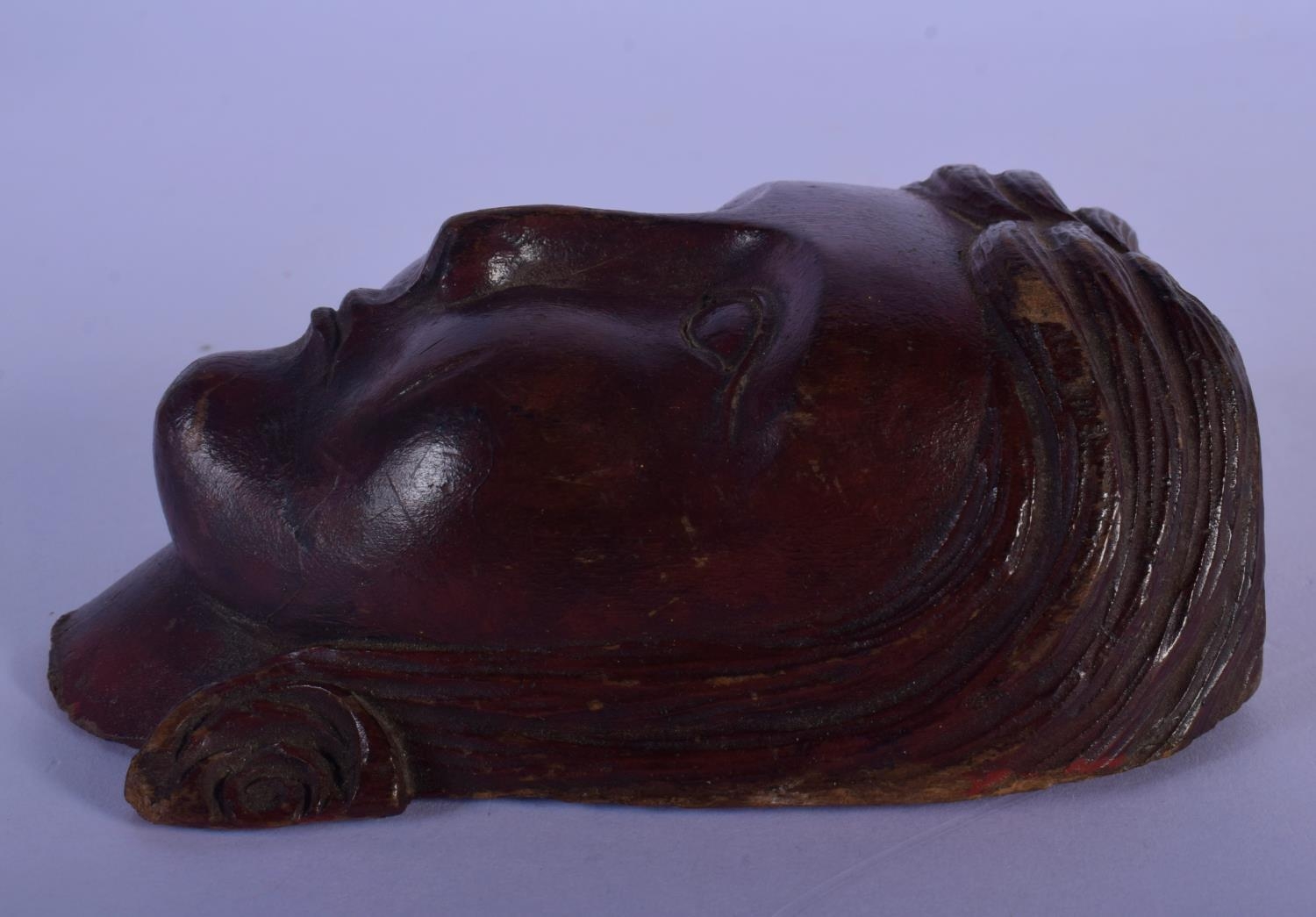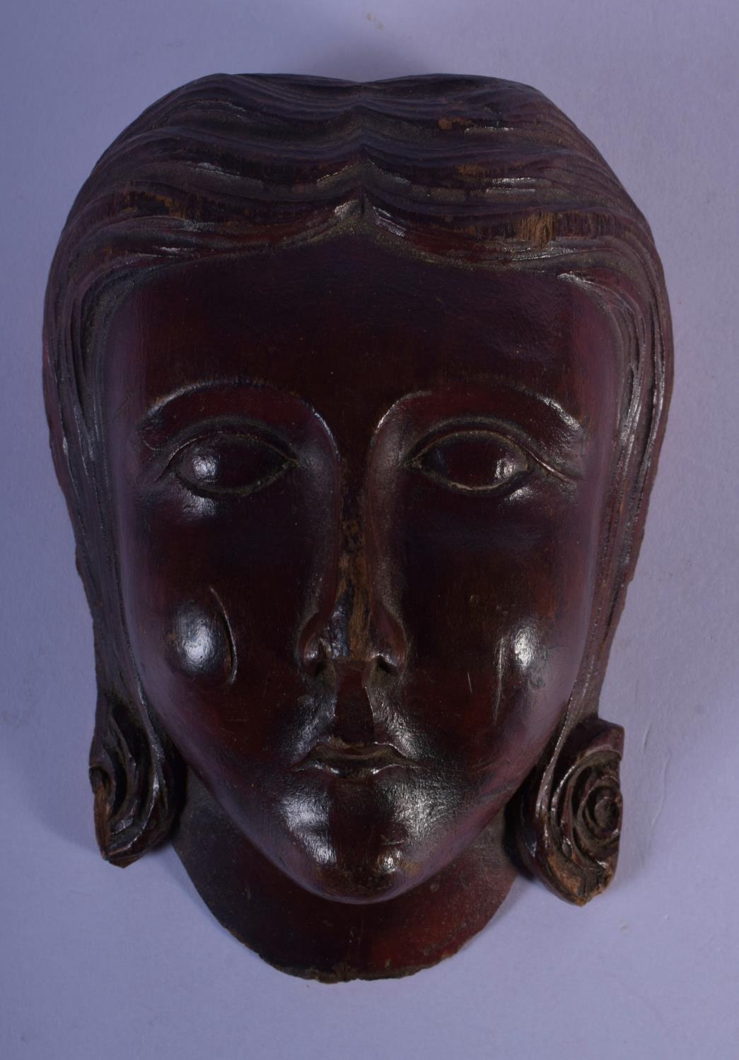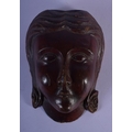 AN 18TH CENTURY EUROPEAN CARVED TREEN WOOD MASK modelled as a female. 12 cm x 7 cm.