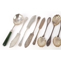 Victorian and later silver comprising cocktail forks with mother of pearl handles, butter knives and caddy spoons, the largest 13cm in length, total 167.2g.
