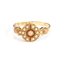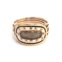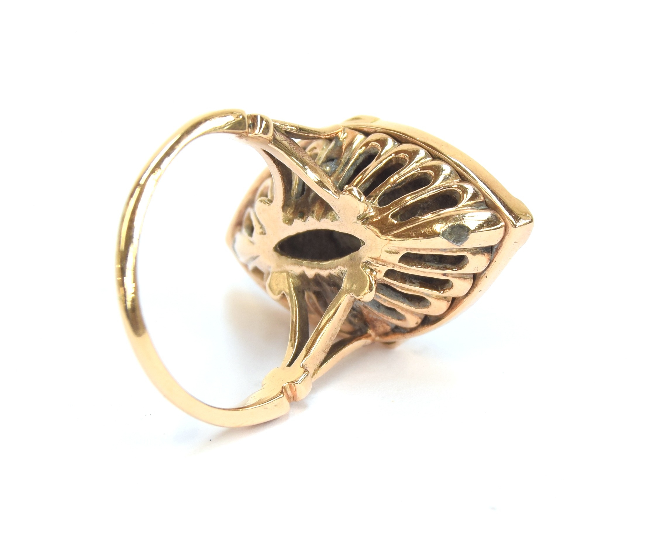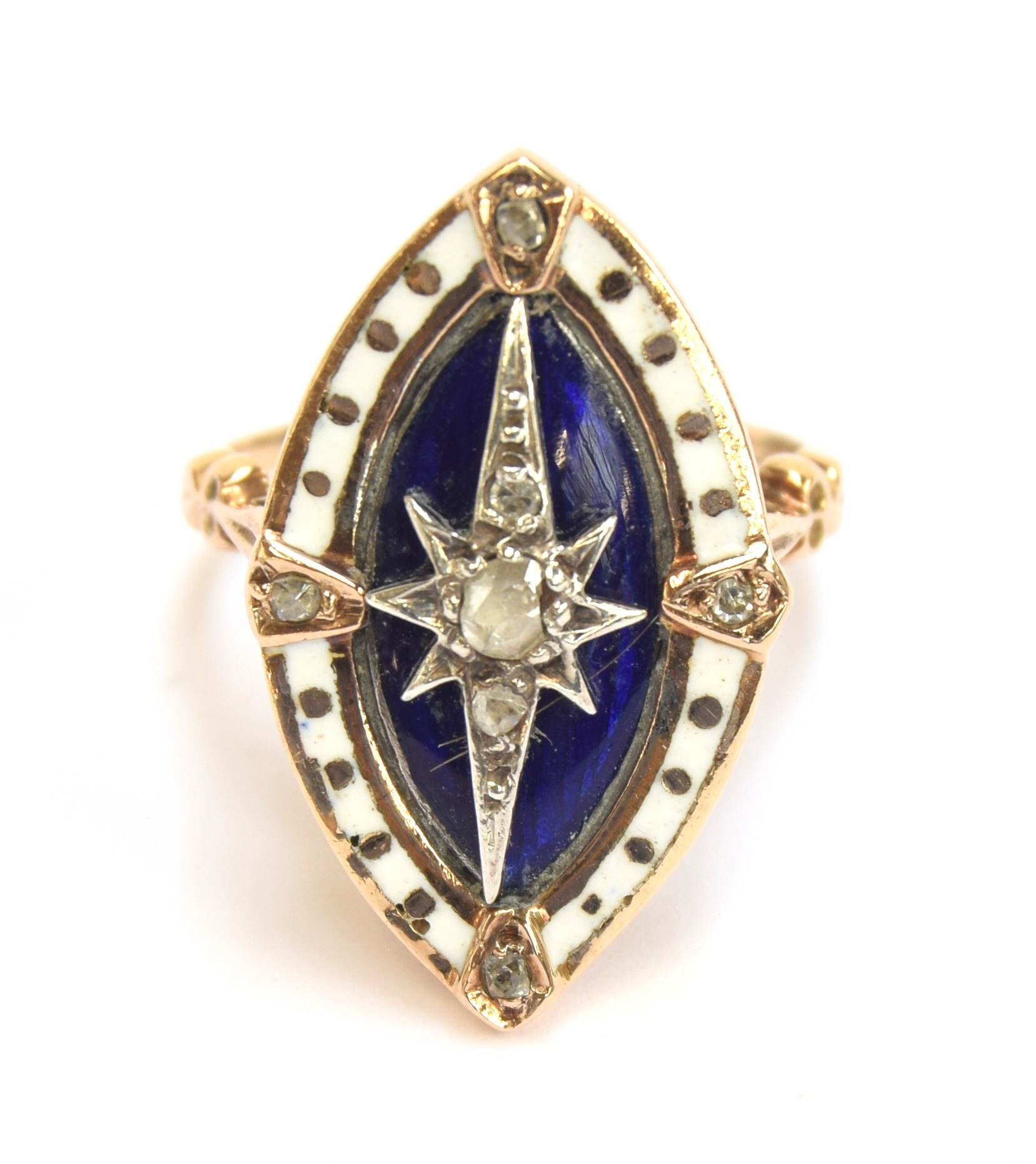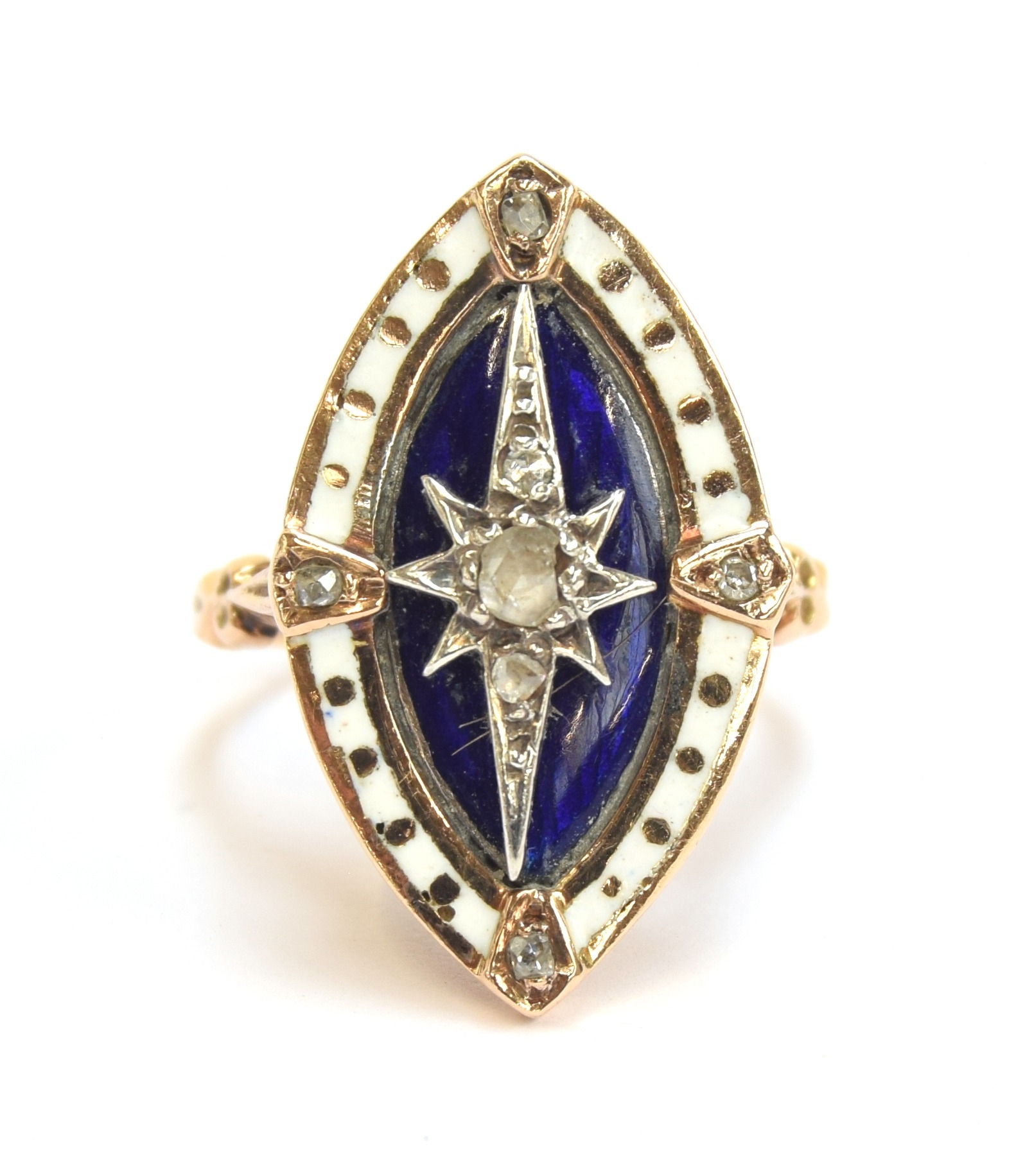 A Georgian Revival gold, enamel and diamond ring of navette form, a diamond set star burst on a cobalt blue enamel ground surrounded by a border of white enamel, having a pierced gallery, unmarked but tests as 14ct or higher, size L, 7g