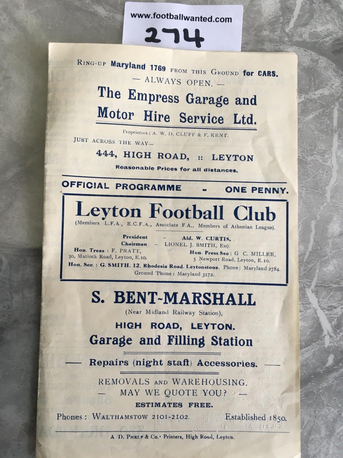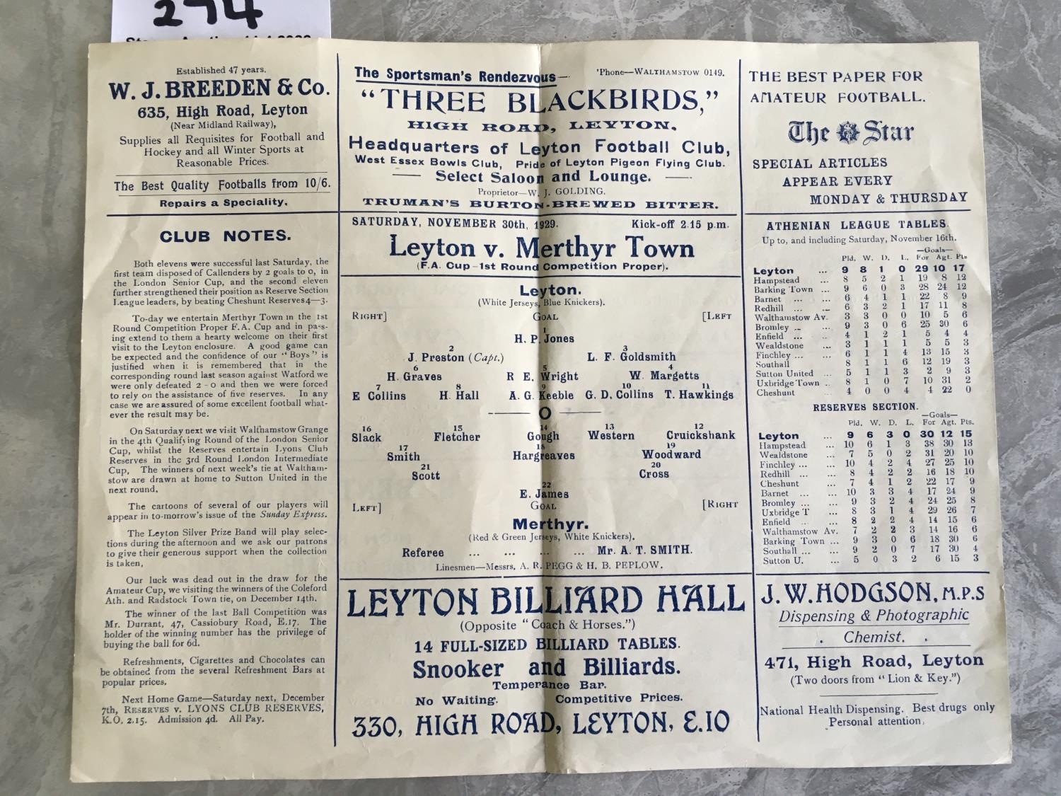 29/30 Leyton v Merthyr Town FA Cup Football Programme: Excellent condition 4 pager from the 1st round proper with no team changes.