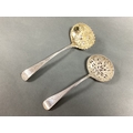 Two Highly Decorative Hallmarked Silver Sifter Ladles, bright cut and engraved decoration and textured pierced bowls, one initialled. (2)