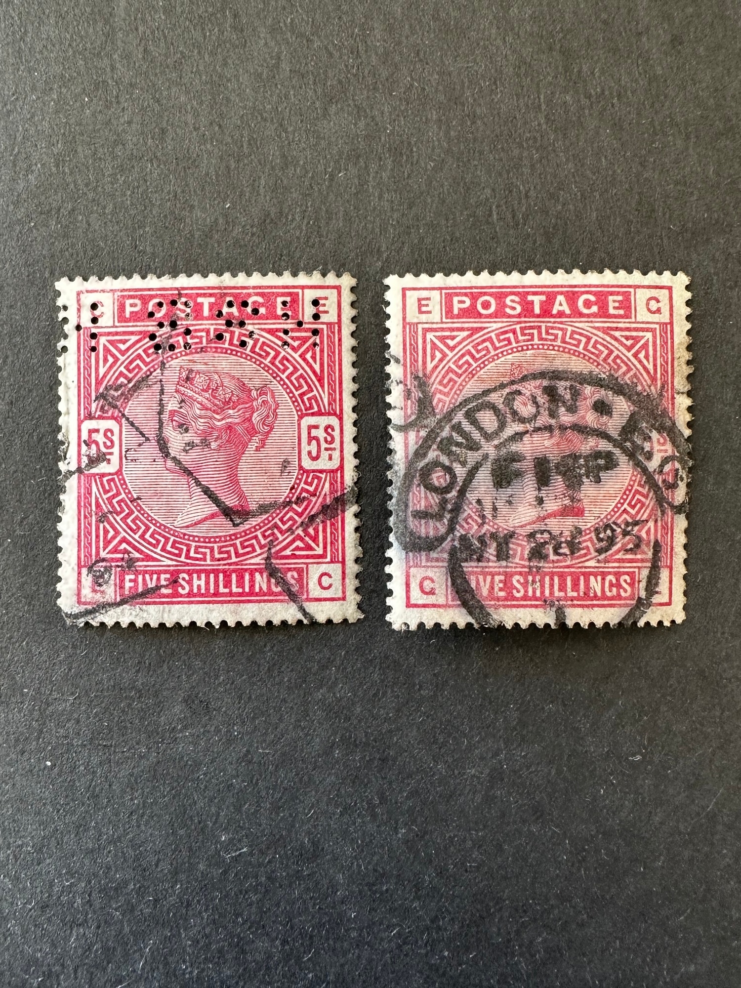 GB QV 2 x rose red Five shillings 5/- stamps consisting of perfin and other having a good London cancel ( 1895 ? ), cat value £250 each