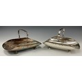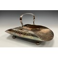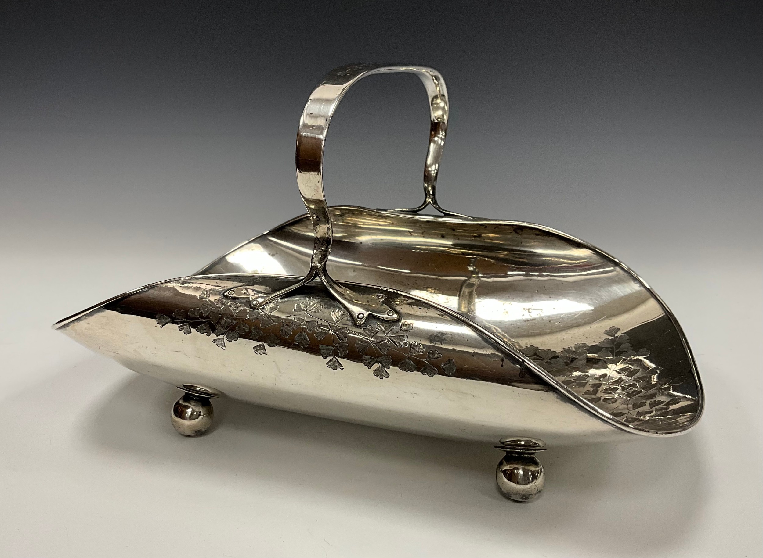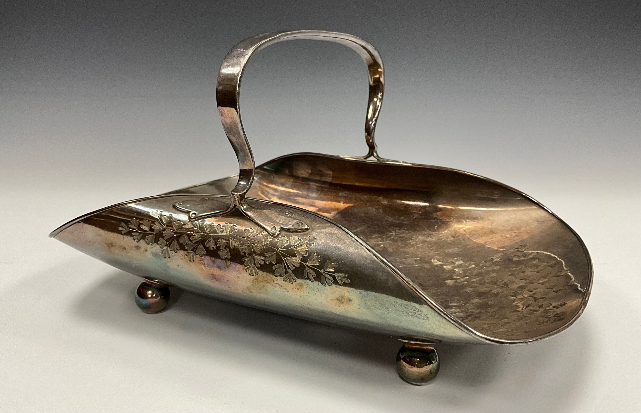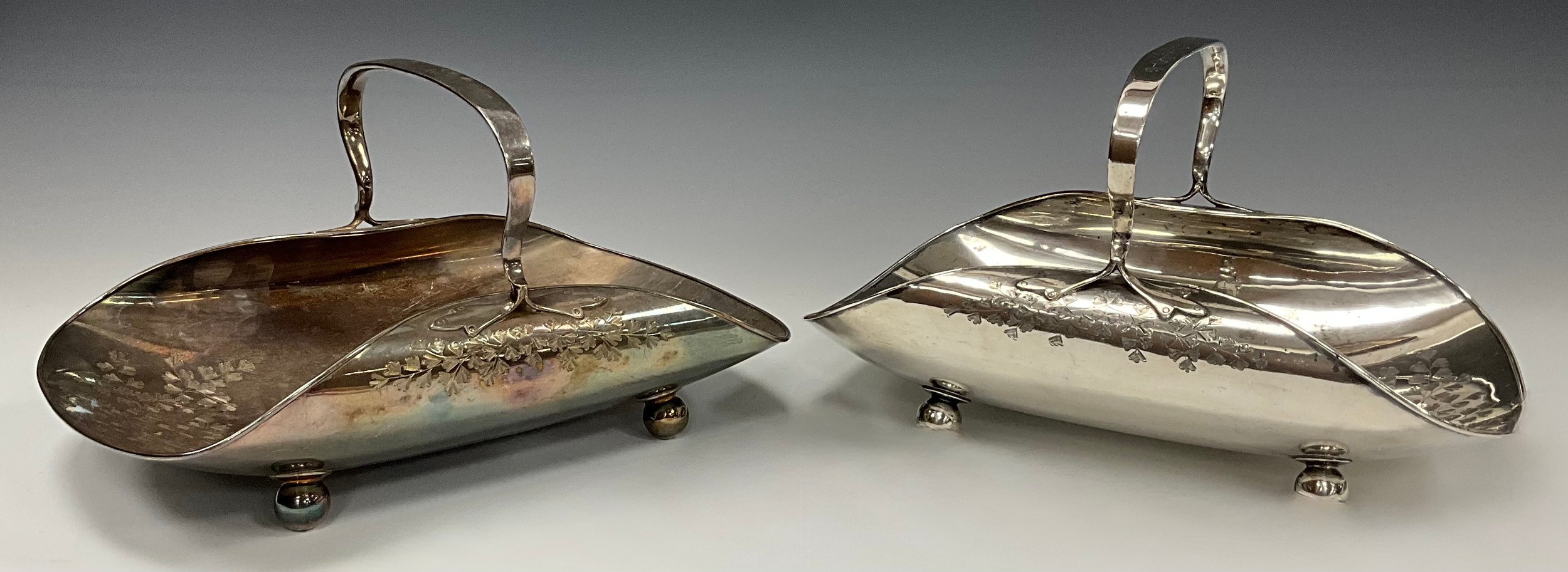 A pair of late Victorian E.P.N.S trug-form baskets, bright-cut engraved with stiff leaves, ball feet, 28.5cm wide, c.1890