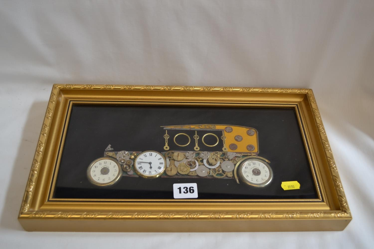 VINTAGE ROLLS ROYCE PICTURE MADE FROM WATCH PARTS IN GILT FRAME