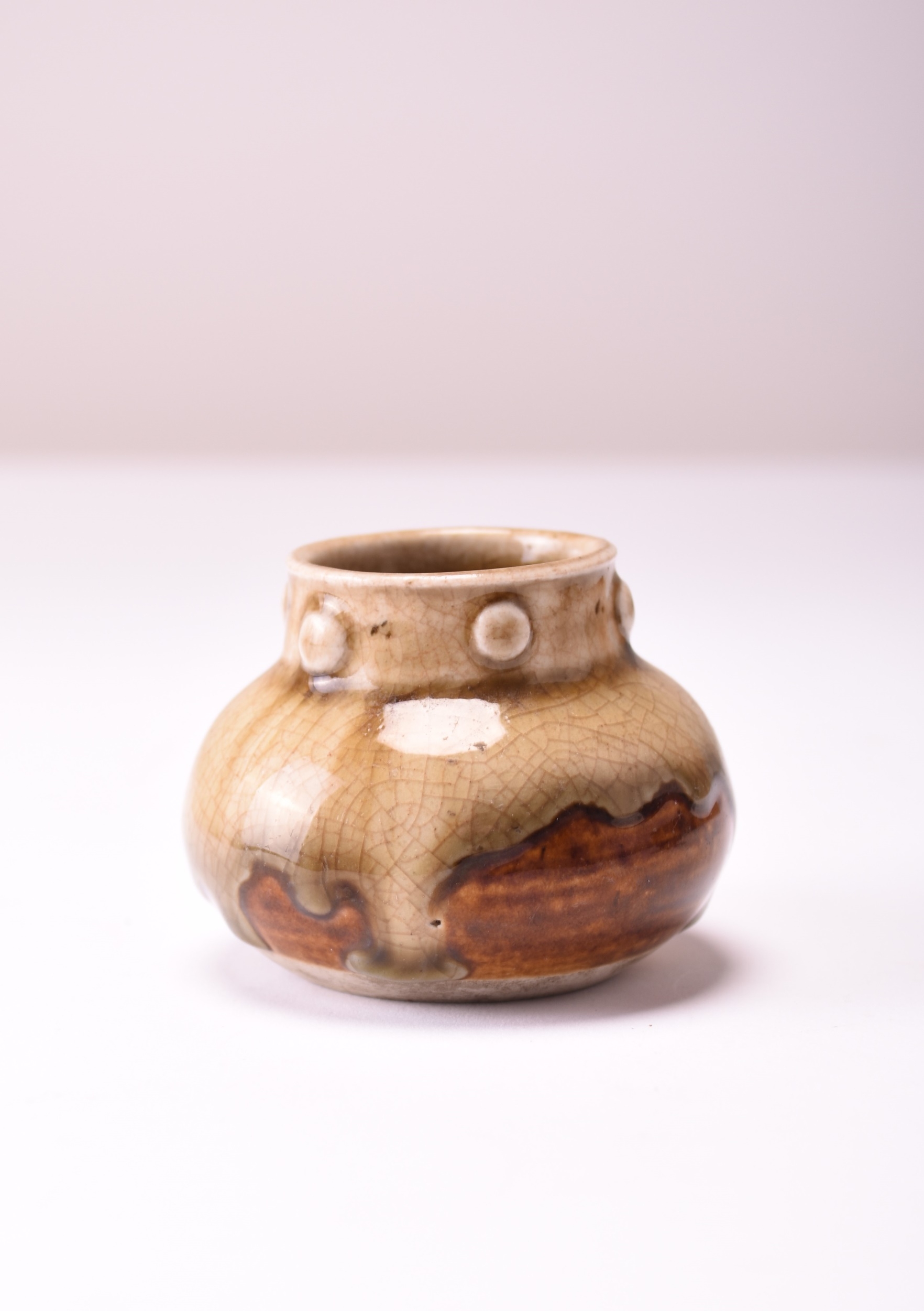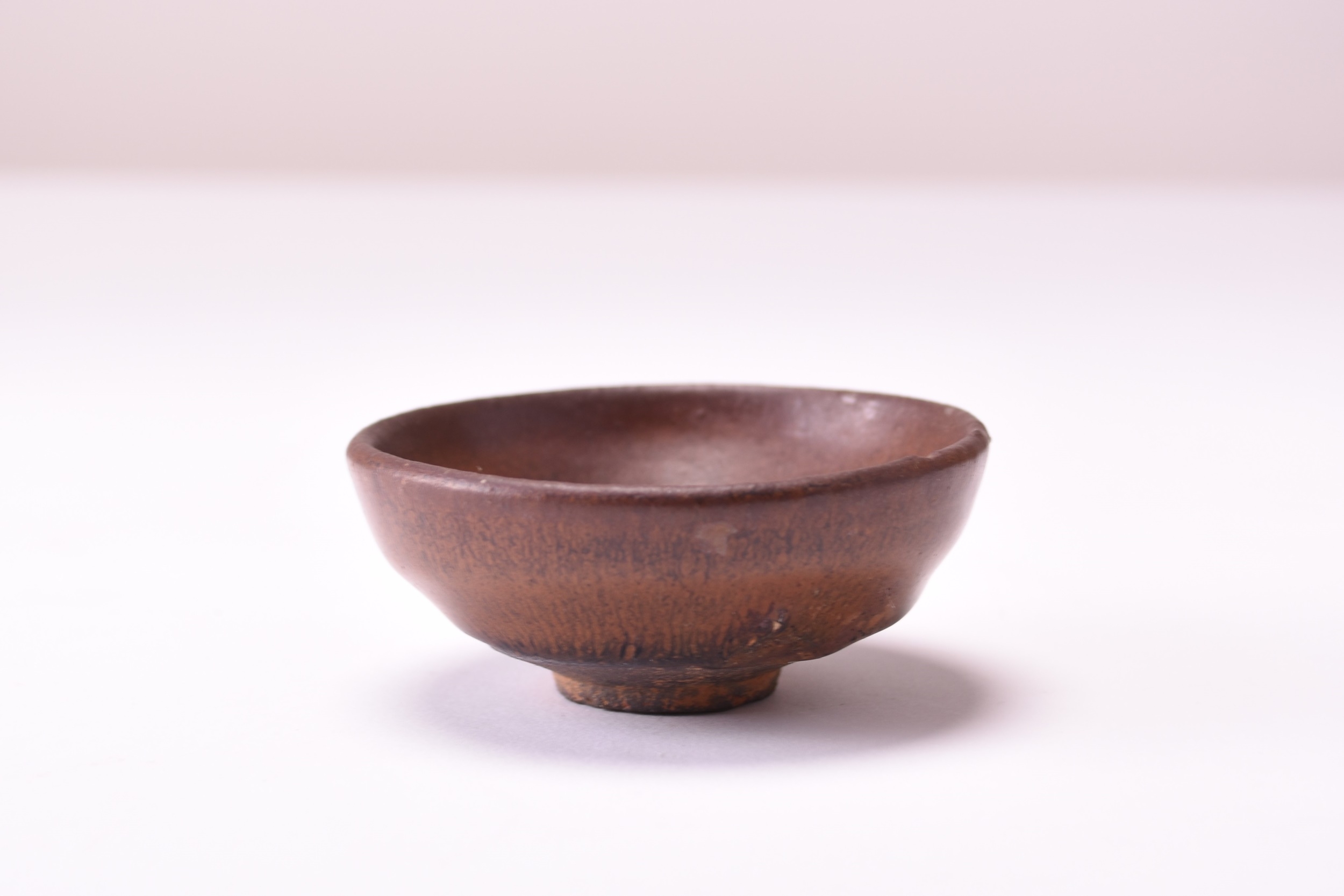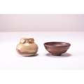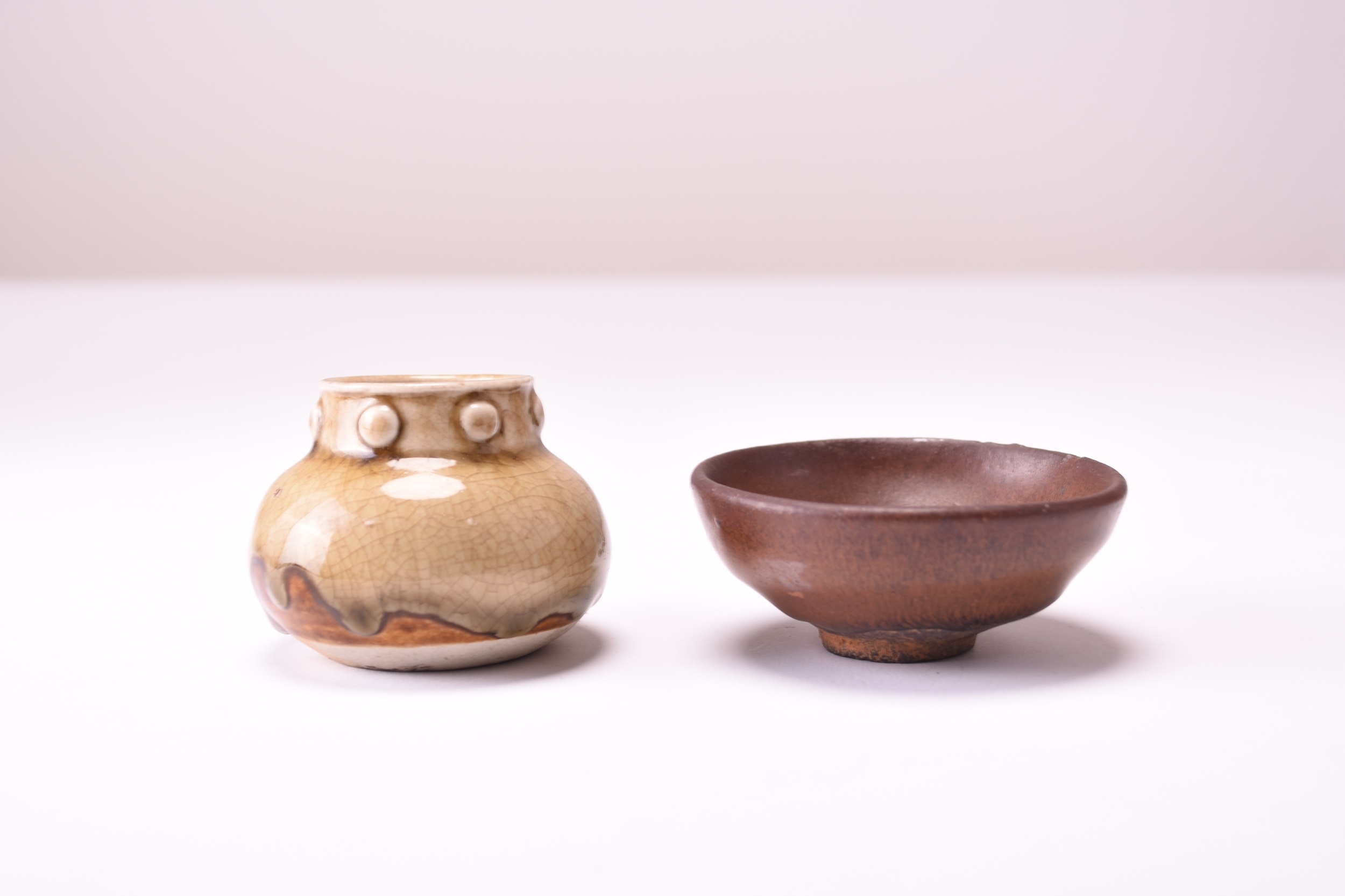 A Chinese 'Hares Fur' teabowl, Southern Song Dynasty The deep rounded sides are covered inside and out with a thick, lustrous black glaze finely streaked with silvery-brown 'hare's fur' markings and pooling above the foot to reveal the buff ware fired to a brown colour, 8.3cm dia., together with a small Yue Yao type ash-glazed water pot, 5cm high. (2) English private collection, the property of a gentleman.
