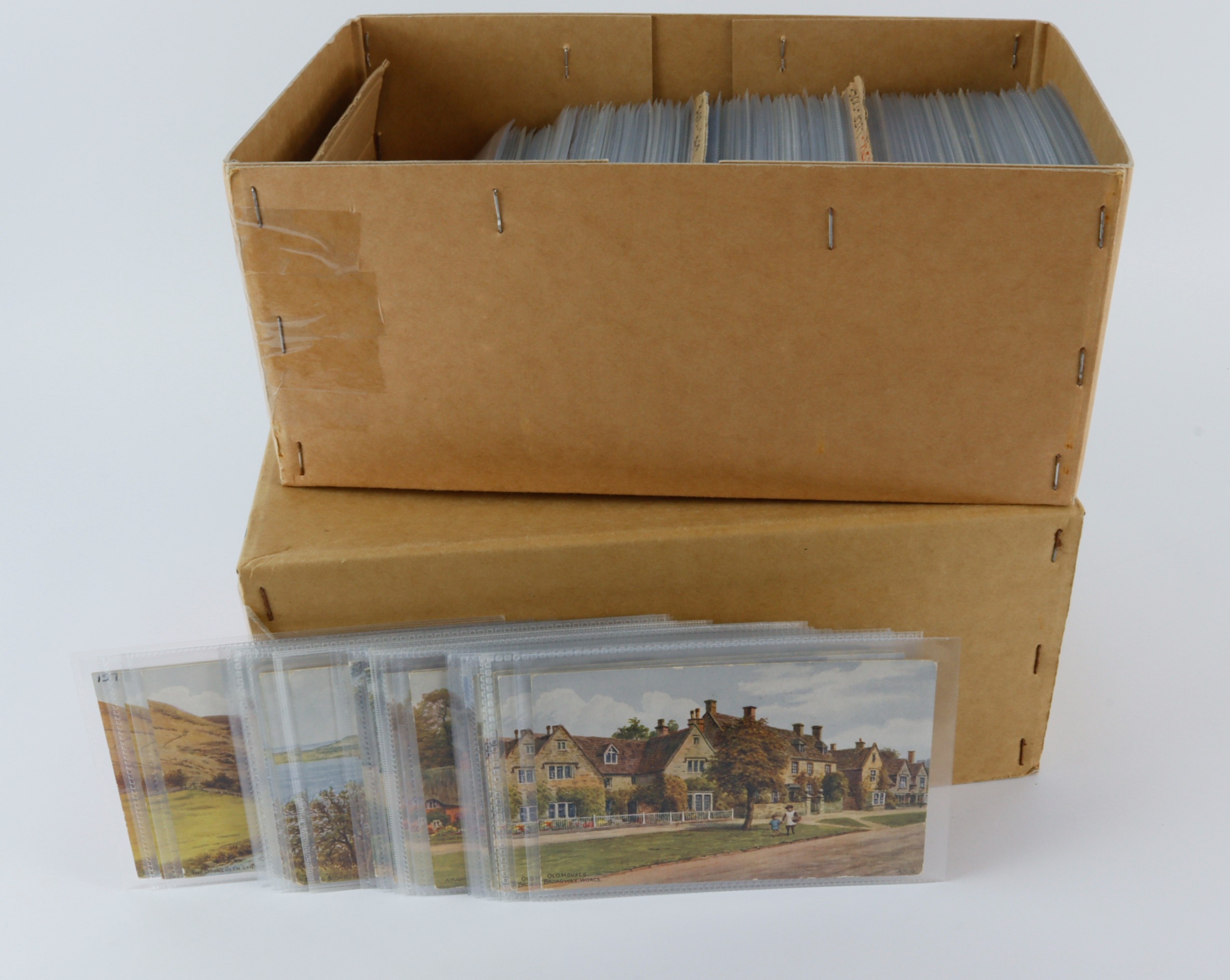 A.R. Quinton - large collection in 2 boxes, numbered 3300 - 3899, better numbers noted (approx 729 cards)