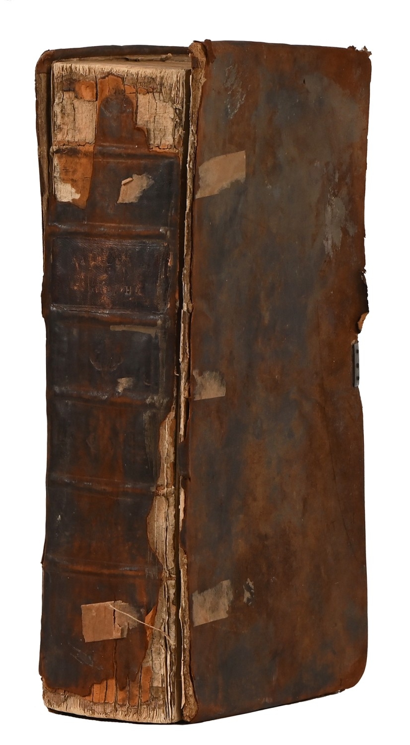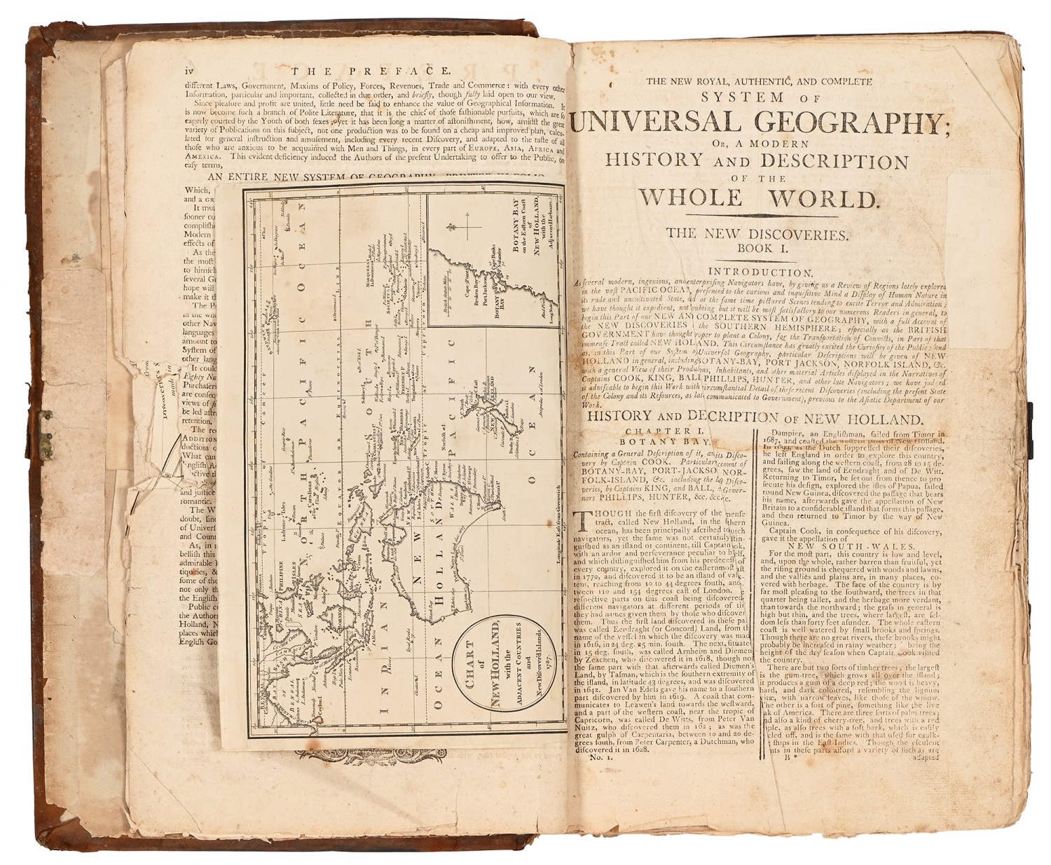 Baldwyn (George Augustus), et al, A New, Royal, Authentic, Complete, and Universal System of Geography; or, A Modern History and Description of the Whole World [...], first edition, London: Sold by Alex. Hogg, 1794, frontispiece dogeared, title tatty with some loss, double-column letterpress uncollated, but some evident fore-margin losses and repairs in places, apparently just touching letters, illustrated with approx. 55 plates and approx. 12 maps, of which 5 are folding - including the new United States and South America, the Australia plate: Chart of New Holland, with the Adjacent Countries and New Discovered Islands 1787 is retained, elsewhere 4 are defective and 1 is loose, contemporary reverse calf over boards, worn, perished spine and loose, folio (40 x 26cm)