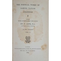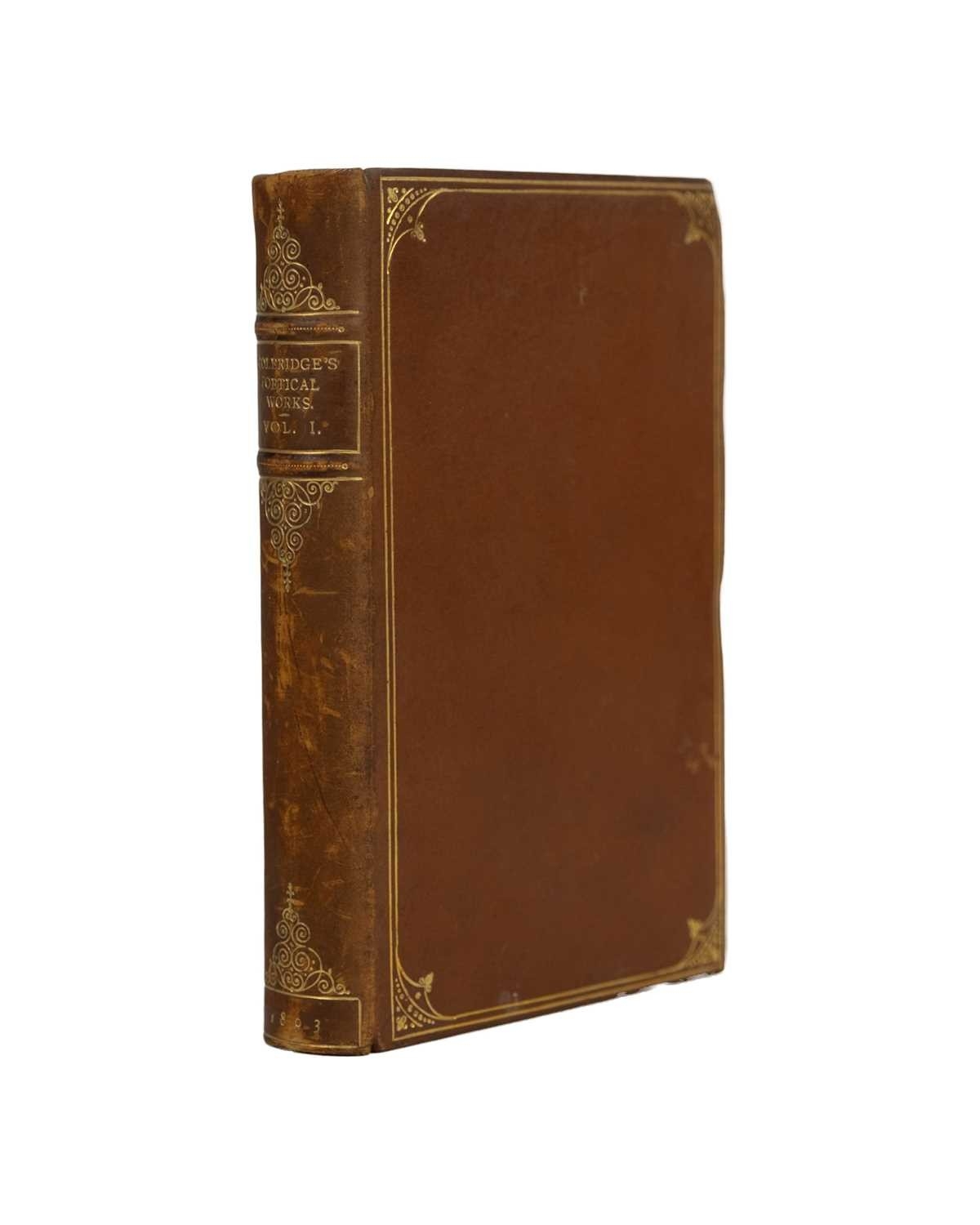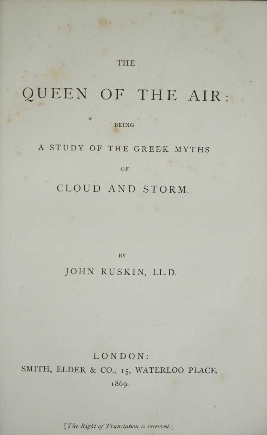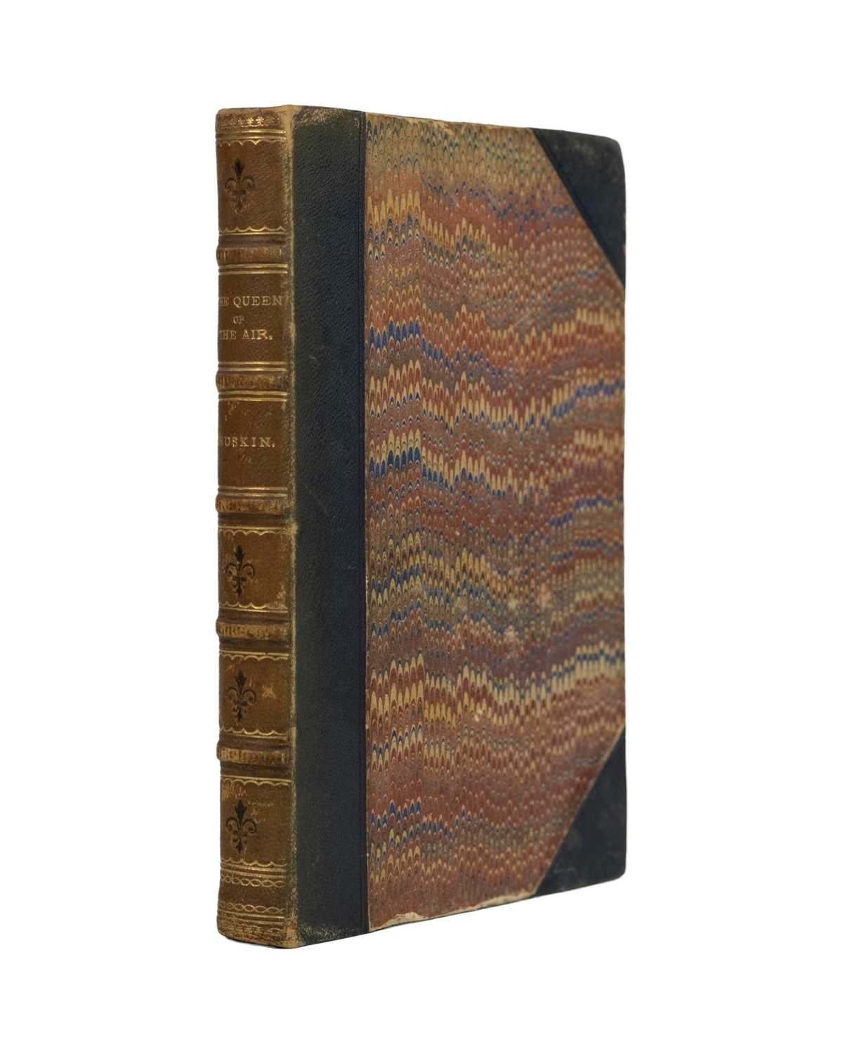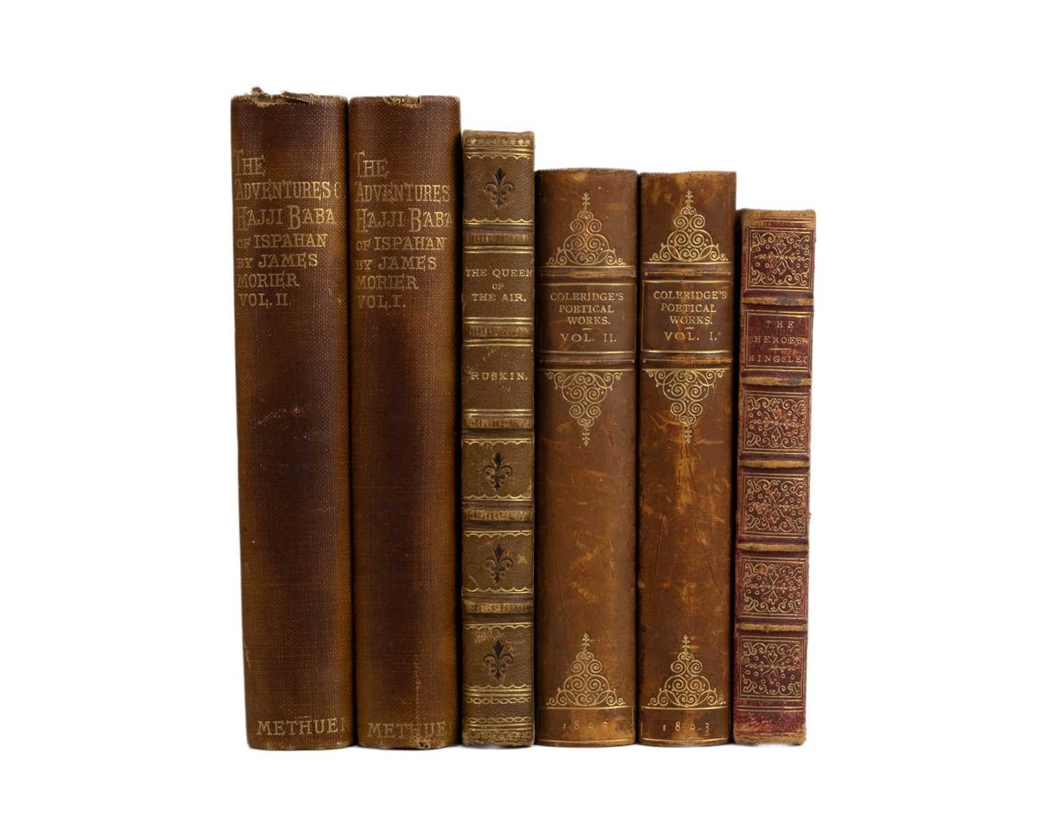 (Bindings) Six works John Ruskin. 'The Queen of the Air: Being A Study of the Greek Myths of Cloud and Storm,' half dark blue morocco with marbled boards, compartmentalised spine with gilt lettering and embossed devices, marbled edge and endpapers, spotting to title page, vg, Smith, Elder & Co, London, 1869; Charles Kingsley. 'The Heroes; Or, Greek Fairy Tales for my Children,' second edition, 12mo, full red morocco with gilt borders to boards, sectionalised spine with gilt decorations, rubbed to extremities and hinges, gilt edge, marbled endpapers, ms gift inscription, frontis and plates, some light sporadic spotting, vg, MacMillan and Co, Cambridge, 1859; With a very tidy 1893 two volume Samuel Taylor Coleridge, in a full polished calf and James Morier's 'The Adventures of Hajji Baba of Ispahan. (6)