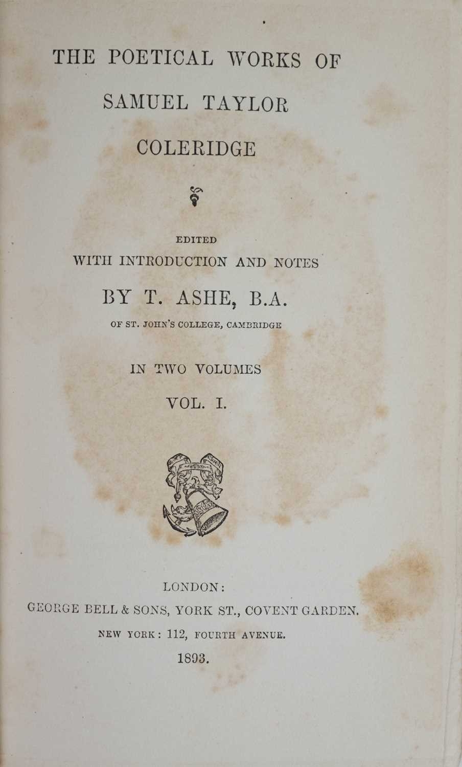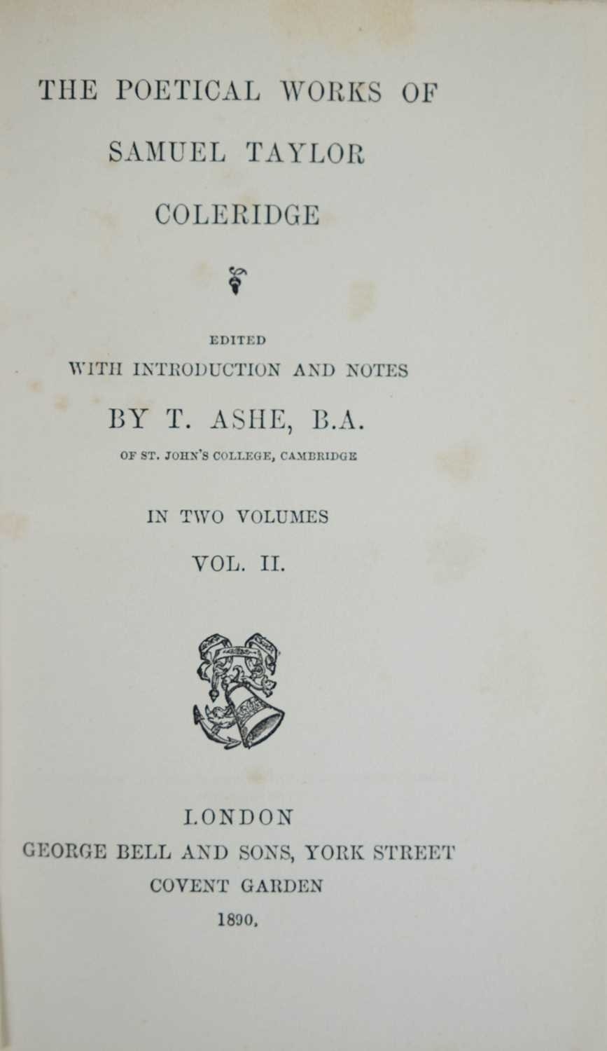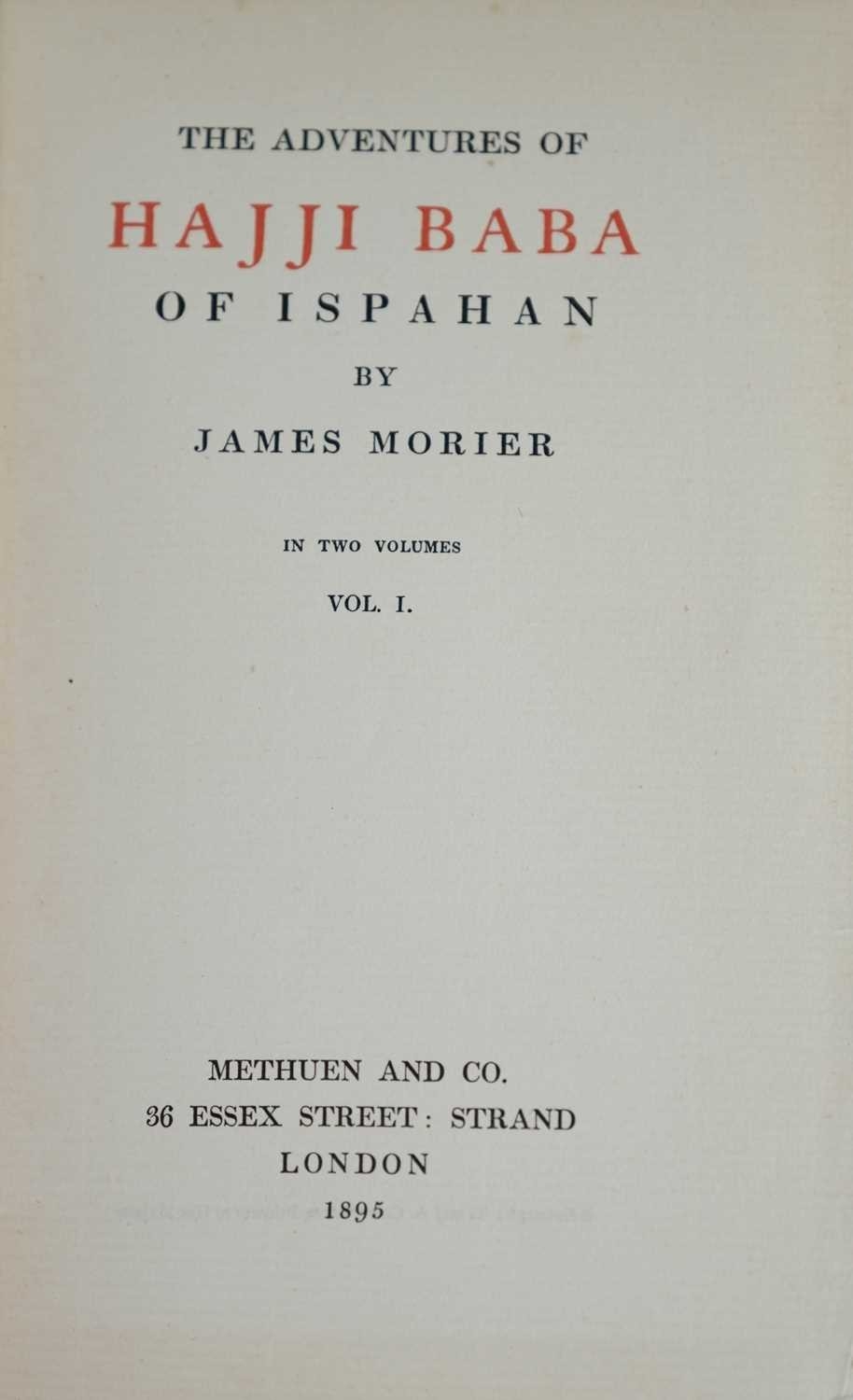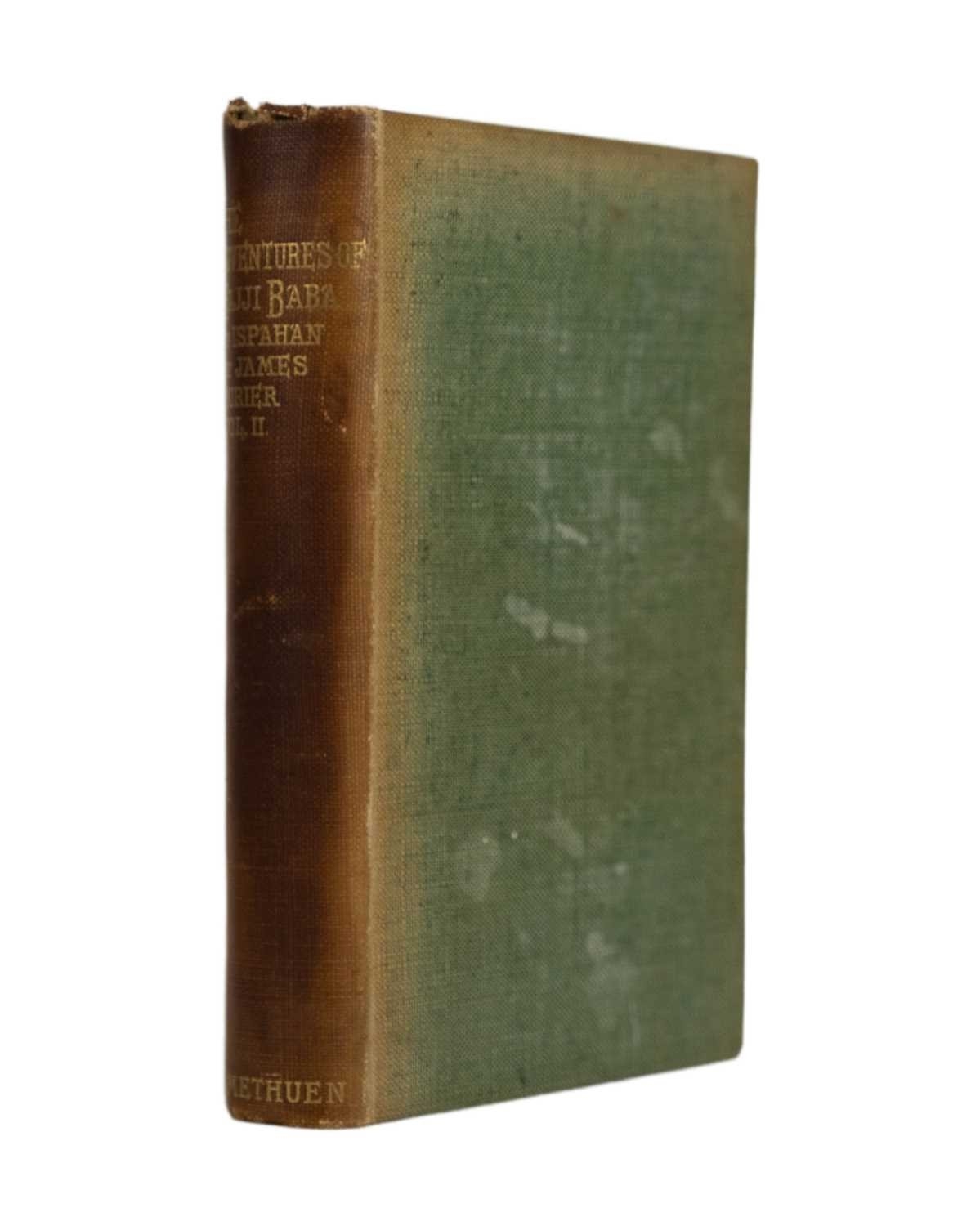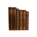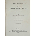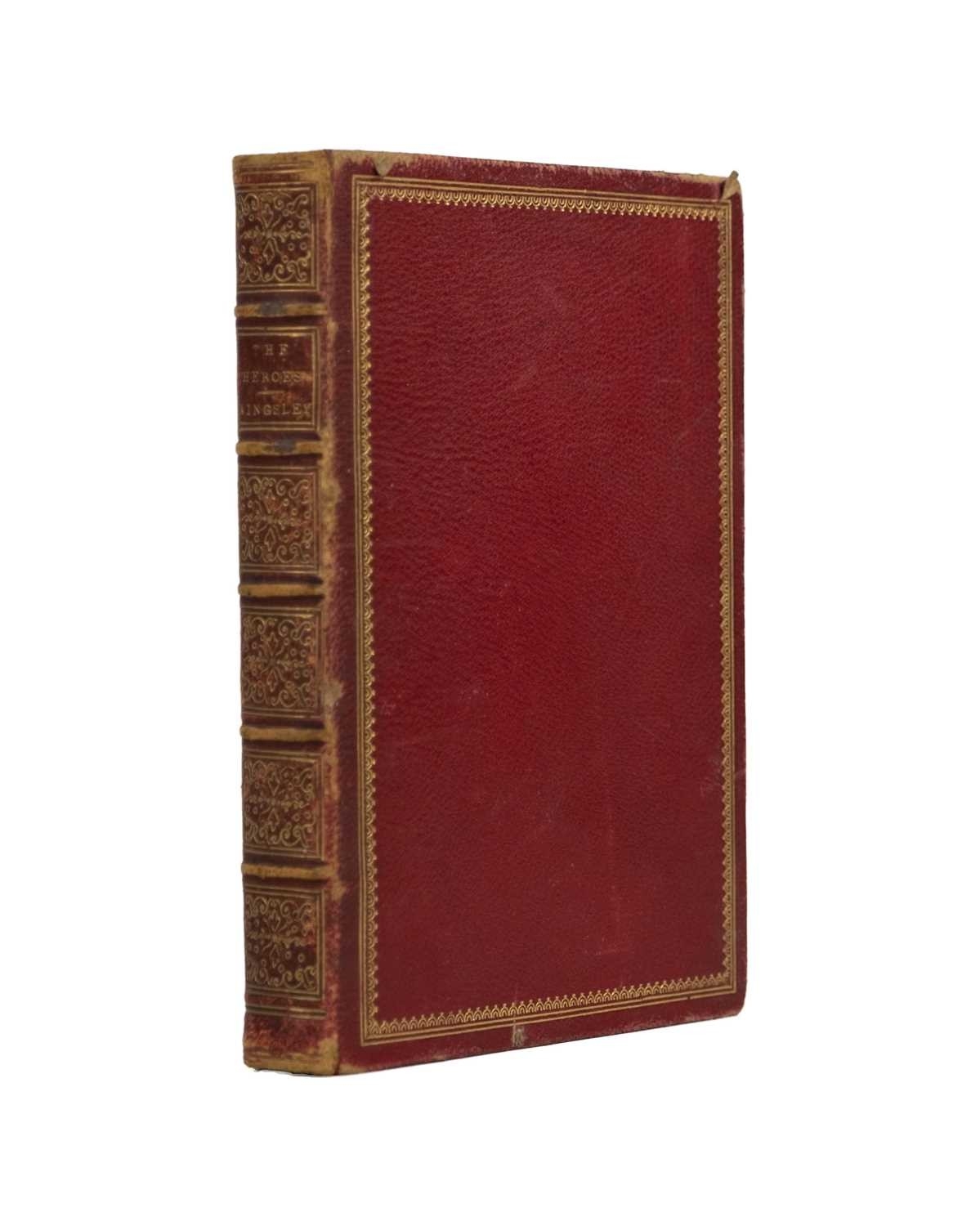 (Bindings) Six works John Ruskin. 'The Queen of the Air: Being A Study of the Greek Myths of Cloud and Storm,' half dark blue morocco with marbled boards, compartmentalised spine with gilt lettering and embossed devices, marbled edge and endpapers, spotting to title page, vg, Smith, Elder & Co, London, 1869; Charles Kingsley. 'The Heroes; Or, Greek Fairy Tales for my Children,' second edition, 12mo, full red morocco with gilt borders to boards, sectionalised spine with gilt decorations, rubbed to extremities and hinges, gilt edge, marbled endpapers, ms gift inscription, frontis and plates, some light sporadic spotting, vg, MacMillan and Co, Cambridge, 1859; With a very tidy 1893 two volume Samuel Taylor Coleridge, in a full polished calf and James Morier's 'The Adventures of Hajji Baba of Ispahan. (6)