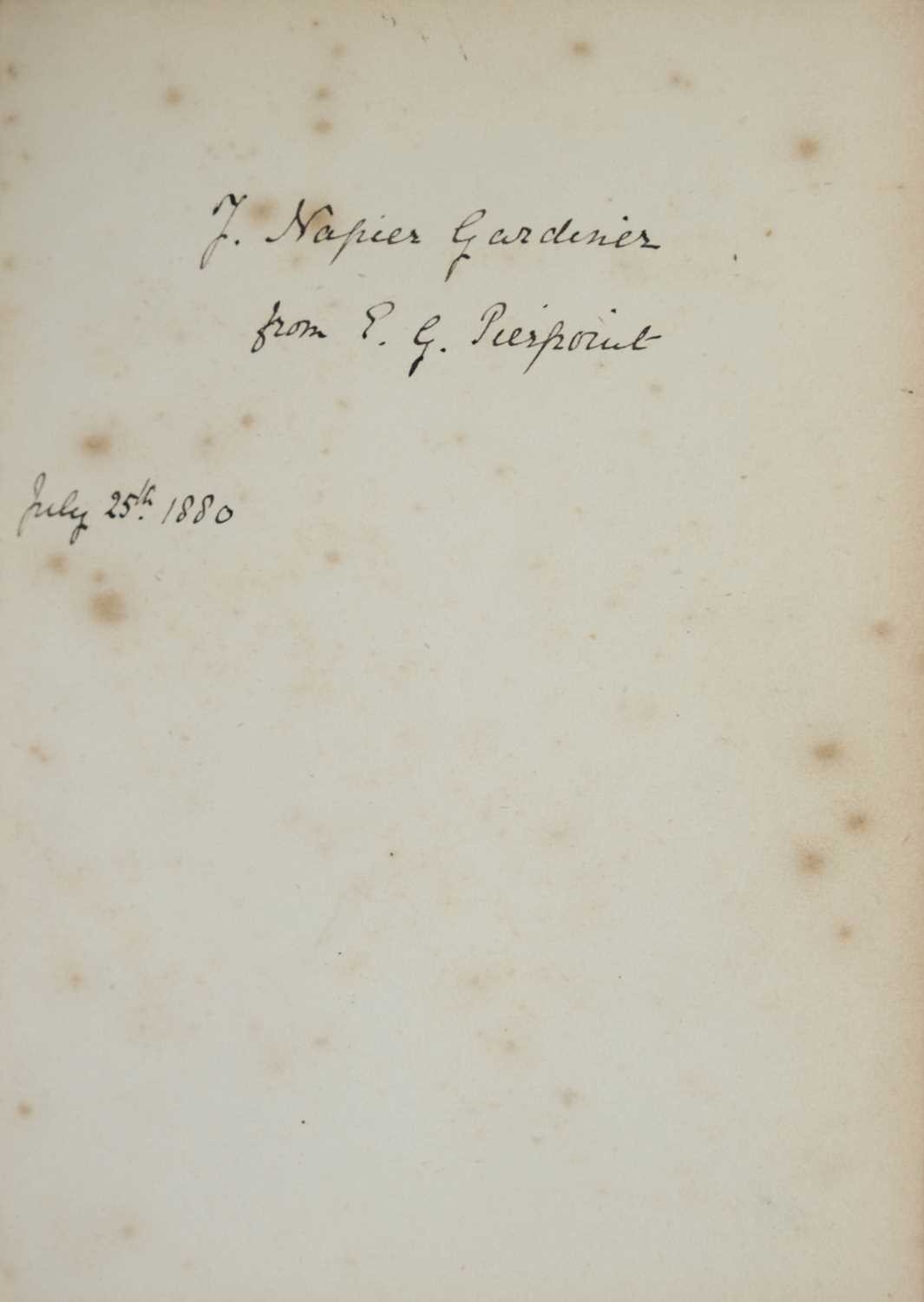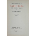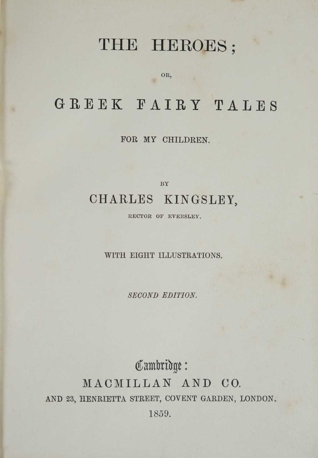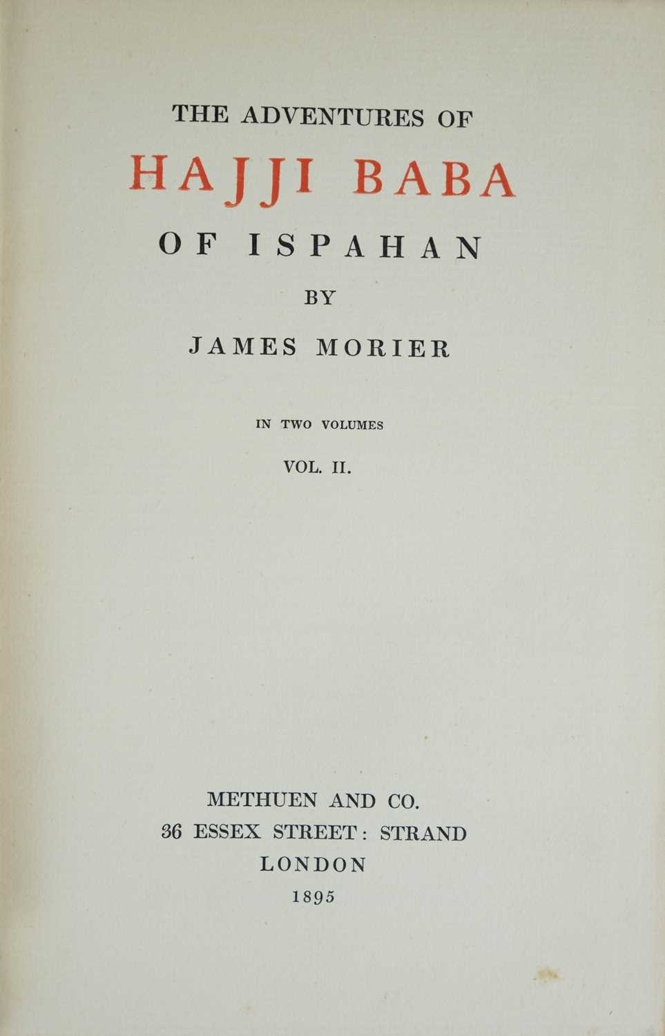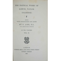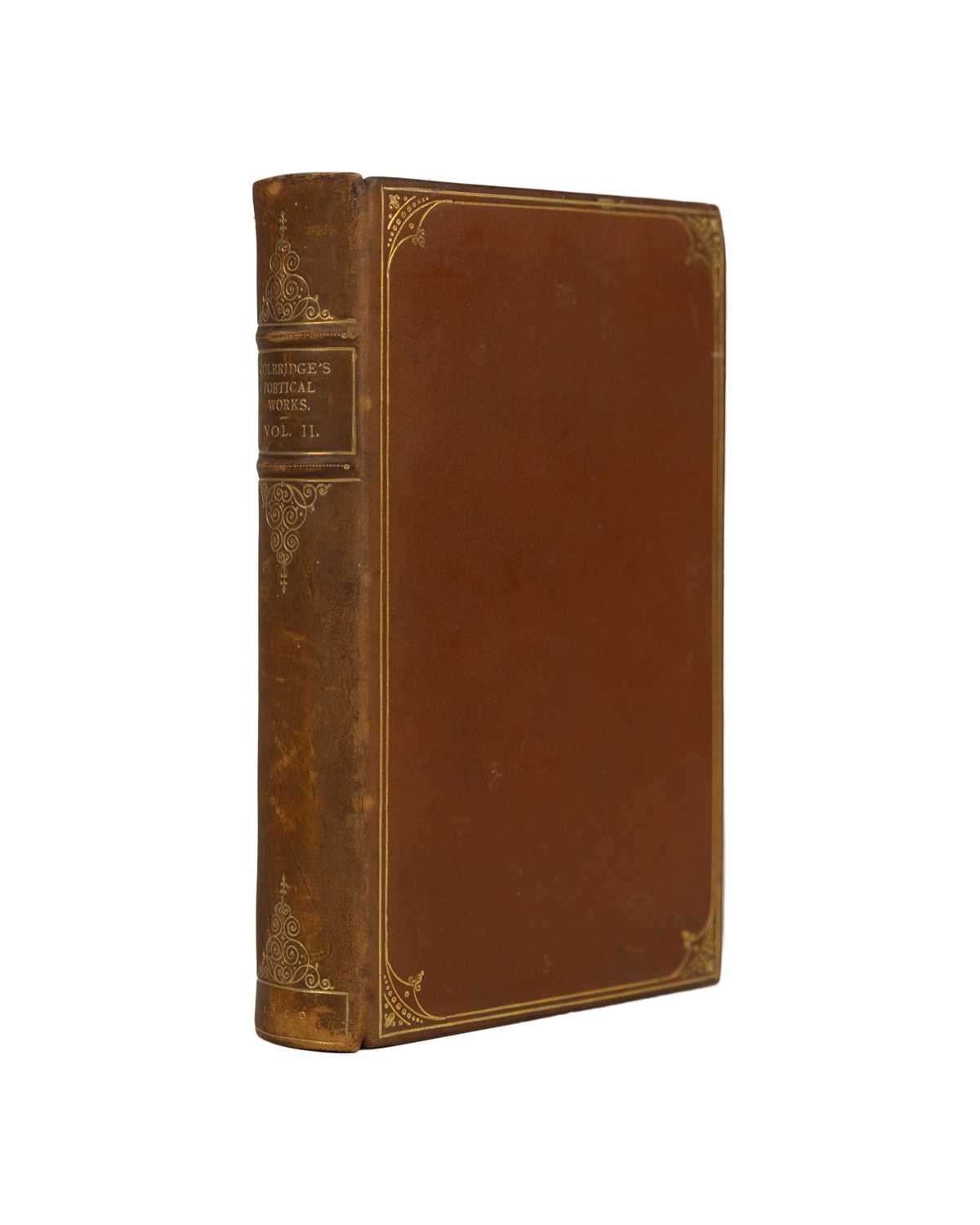 (Bindings) Six works John Ruskin. 'The Queen of the Air: Being A Study of the Greek Myths of Cloud and Storm,' half dark blue morocco with marbled boards, compartmentalised spine with gilt lettering and embossed devices, marbled edge and endpapers, spotting to title page, vg, Smith, Elder & Co, London, 1869; Charles Kingsley. 'The Heroes; Or, Greek Fairy Tales for my Children,' second edition, 12mo, full red morocco with gilt borders to boards, sectionalised spine with gilt decorations, rubbed to extremities and hinges, gilt edge, marbled endpapers, ms gift inscription, frontis and plates, some light sporadic spotting, vg, MacMillan and Co, Cambridge, 1859; With a very tidy 1893 two volume Samuel Taylor Coleridge, in a full polished calf and James Morier's 'The Adventures of Hajji Baba of Ispahan. (6)