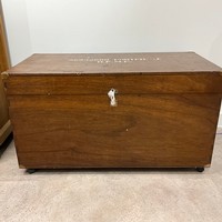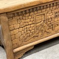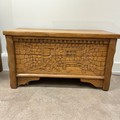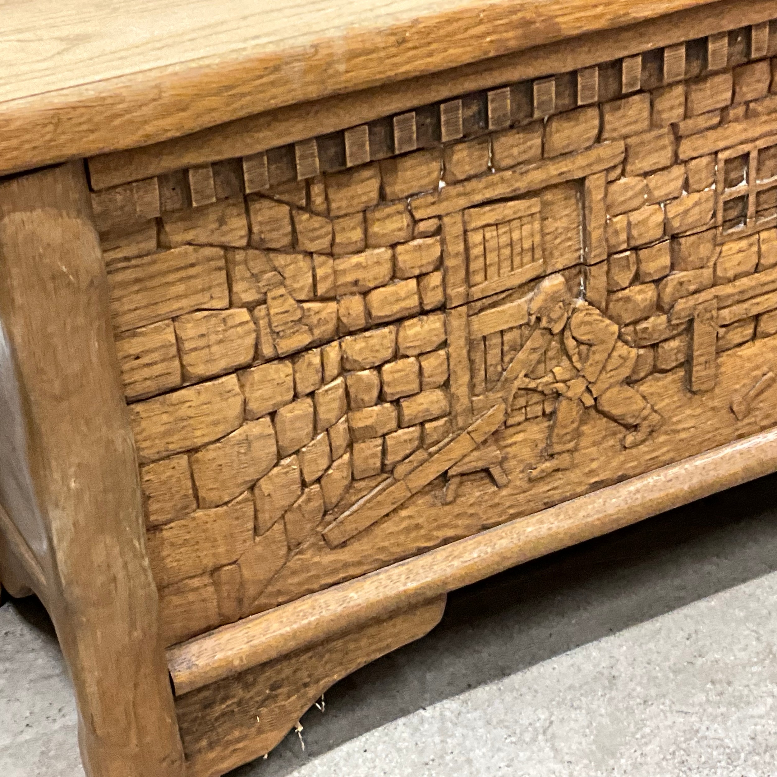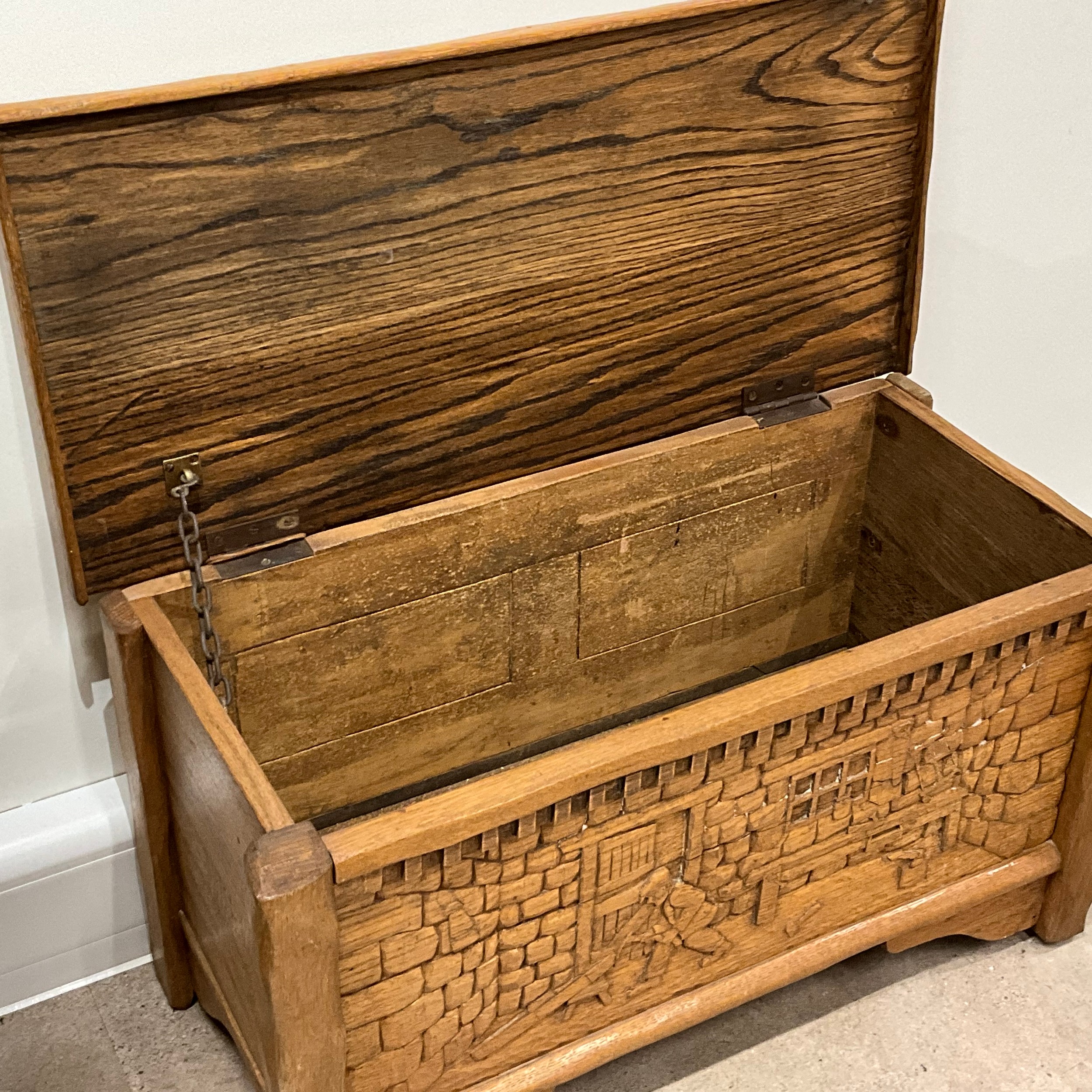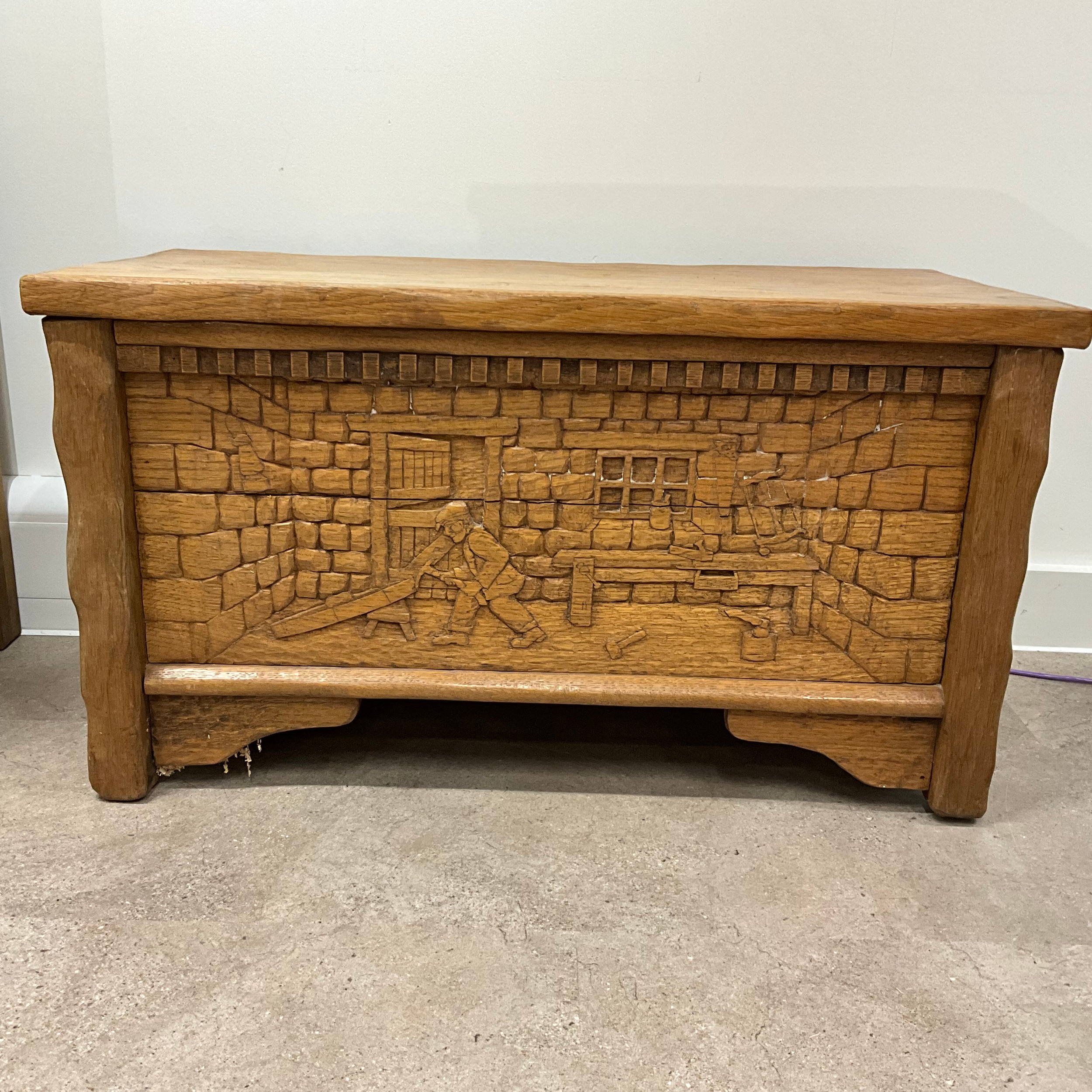 Small oak folk art carved coffer, the front panel depicting a man sawing wood, W 78cm x D 36cm x H 43cm.