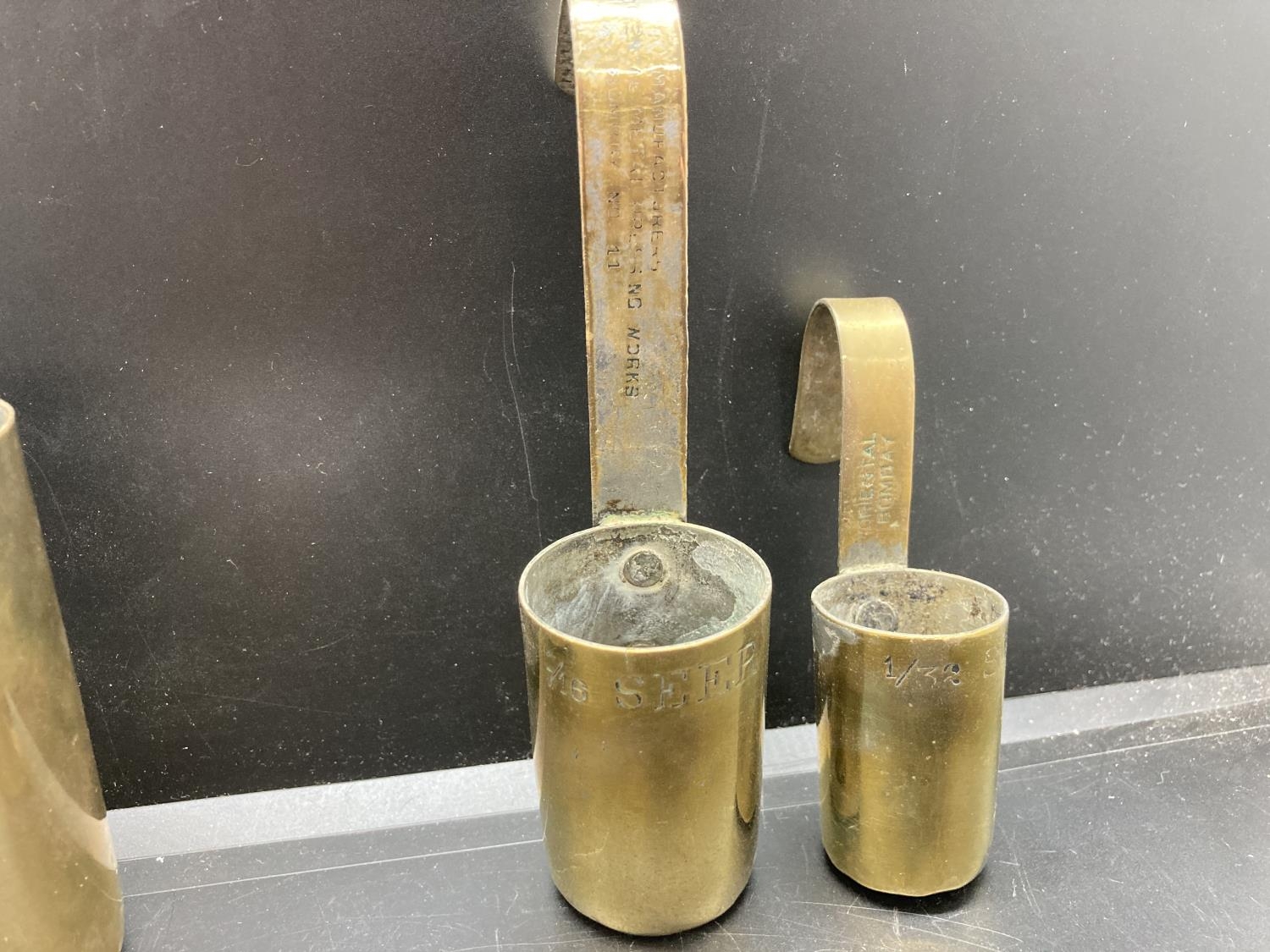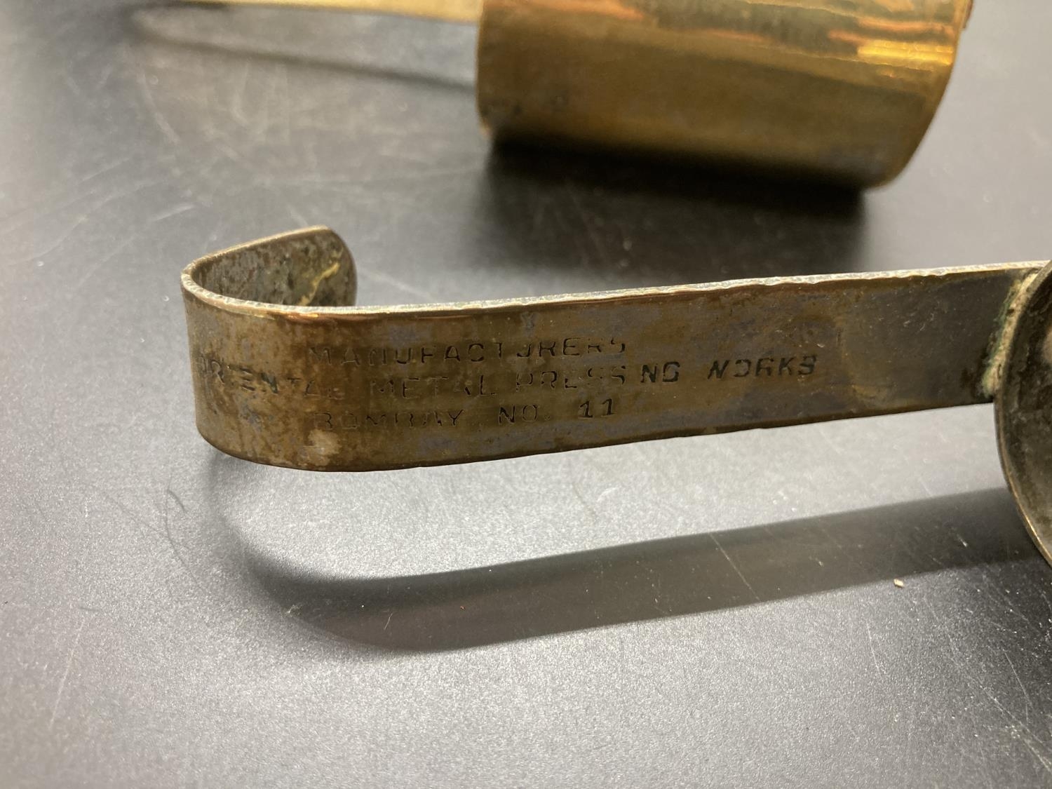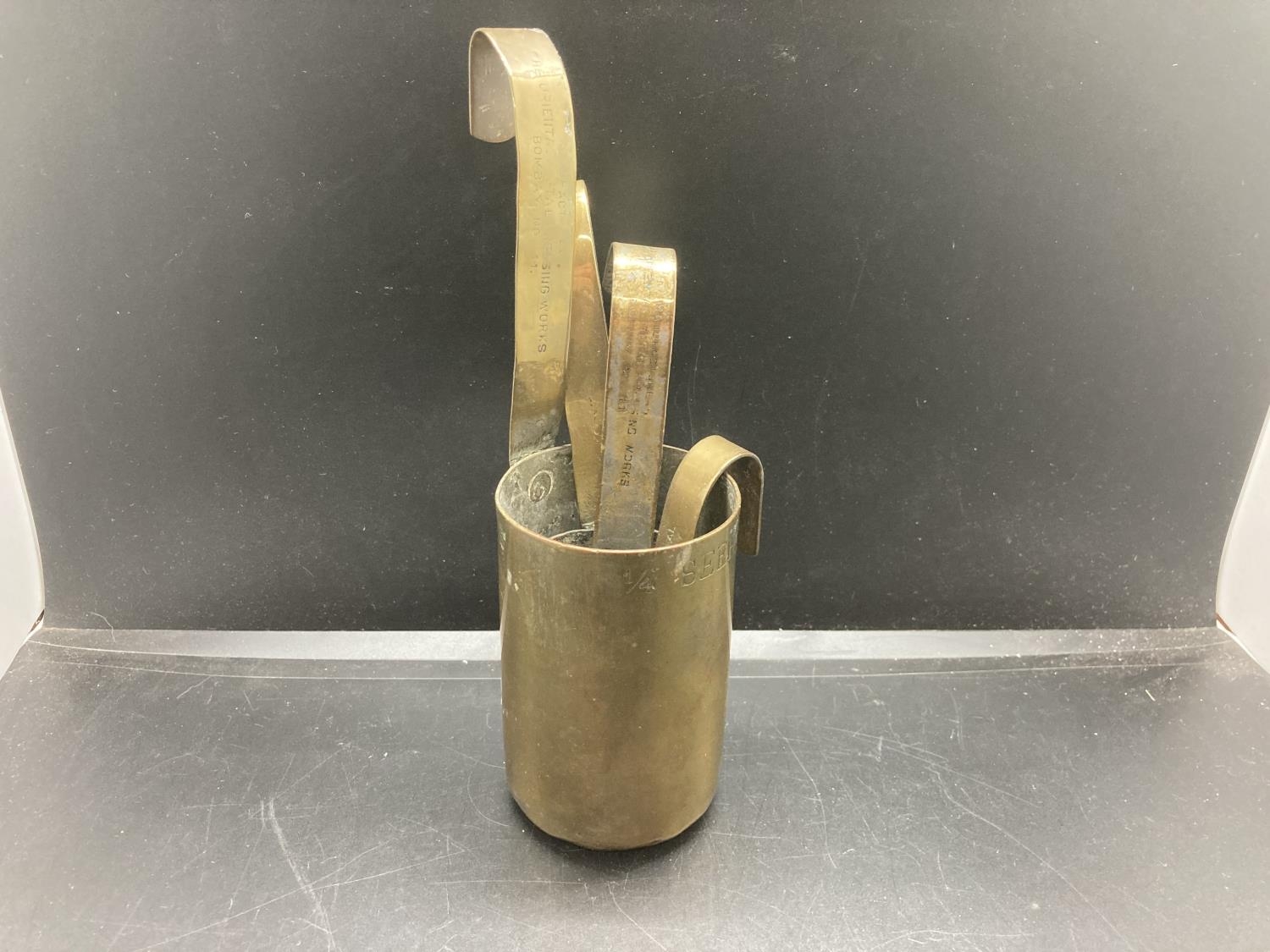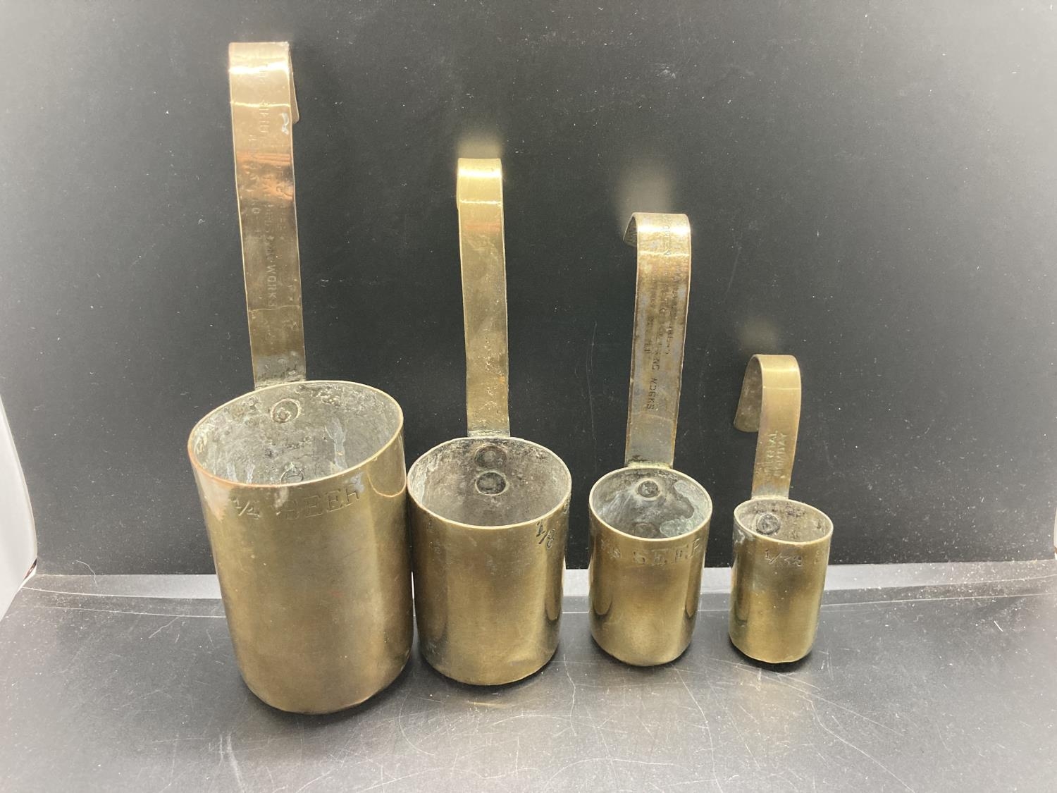 A set of four vintage brass graduating measuring cups, two stamped 'The Oriental Metal Dressing Works', one stamped 'Oriental Bombay' and one other
