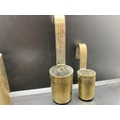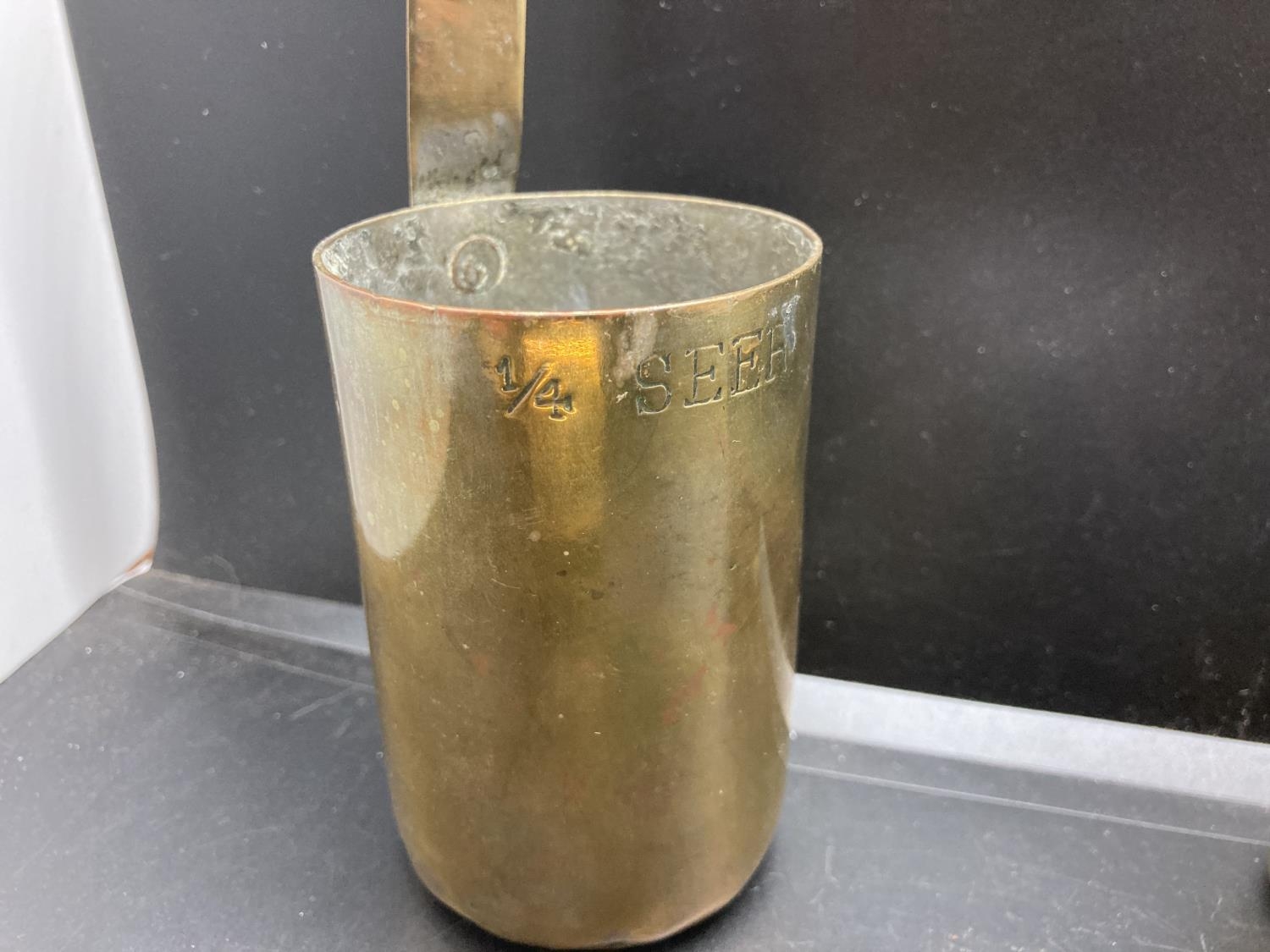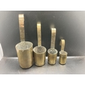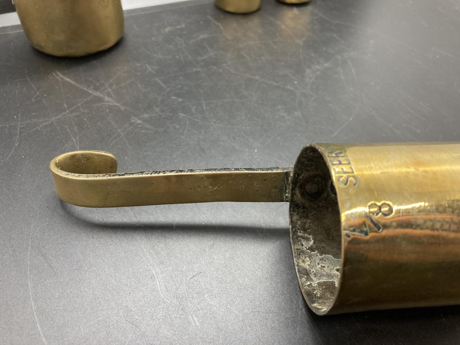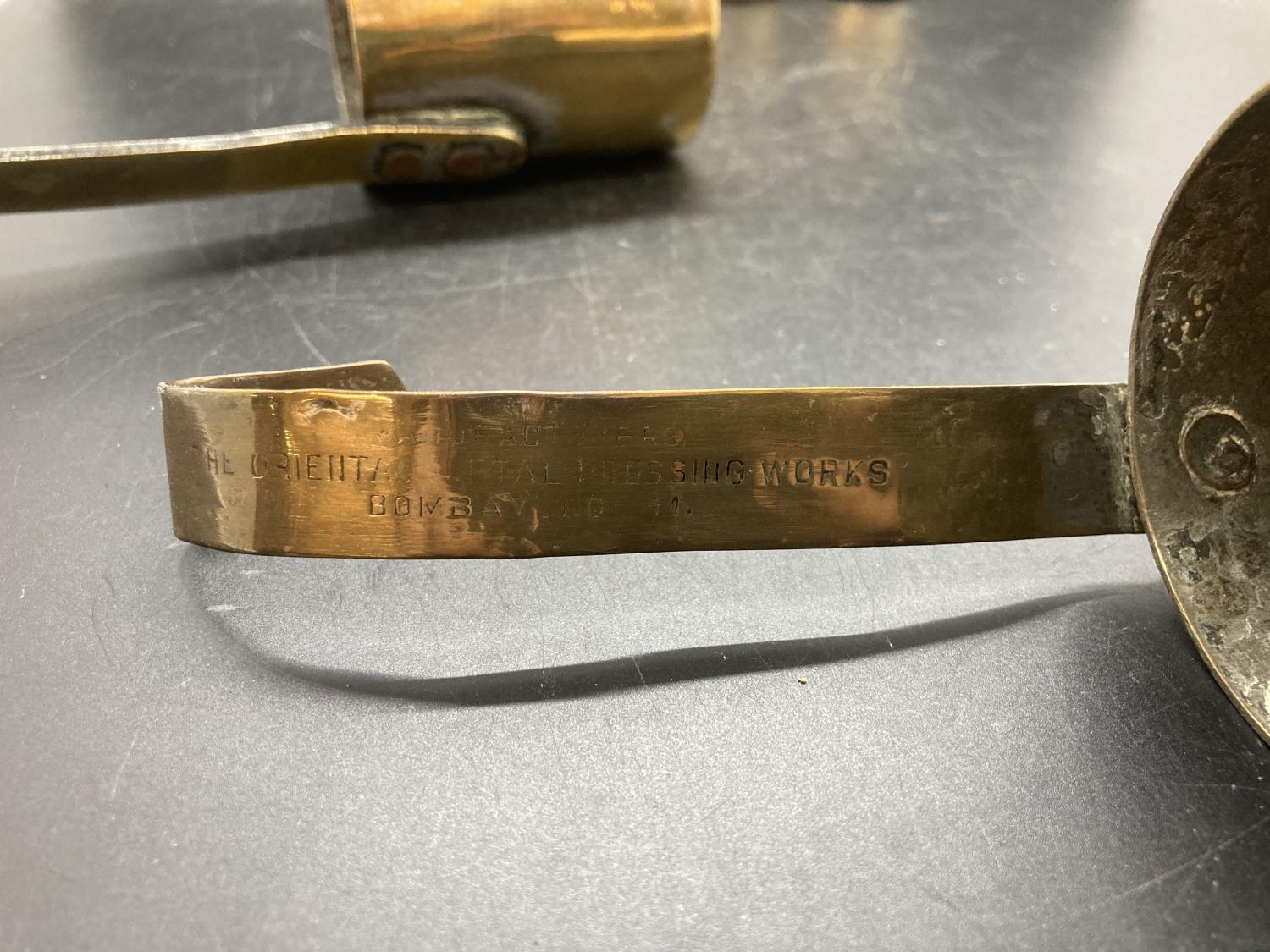 A set of four vintage brass graduating measuring cups, two stamped 'The Oriental Metal Dressing Works', one stamped 'Oriental Bombay' and one other