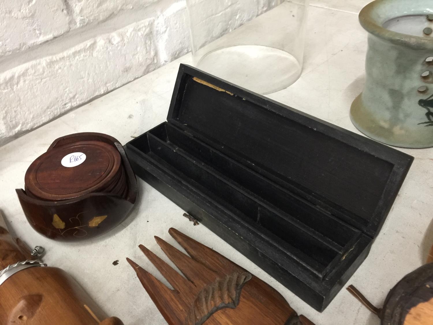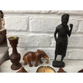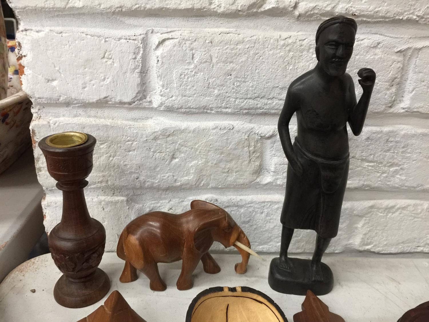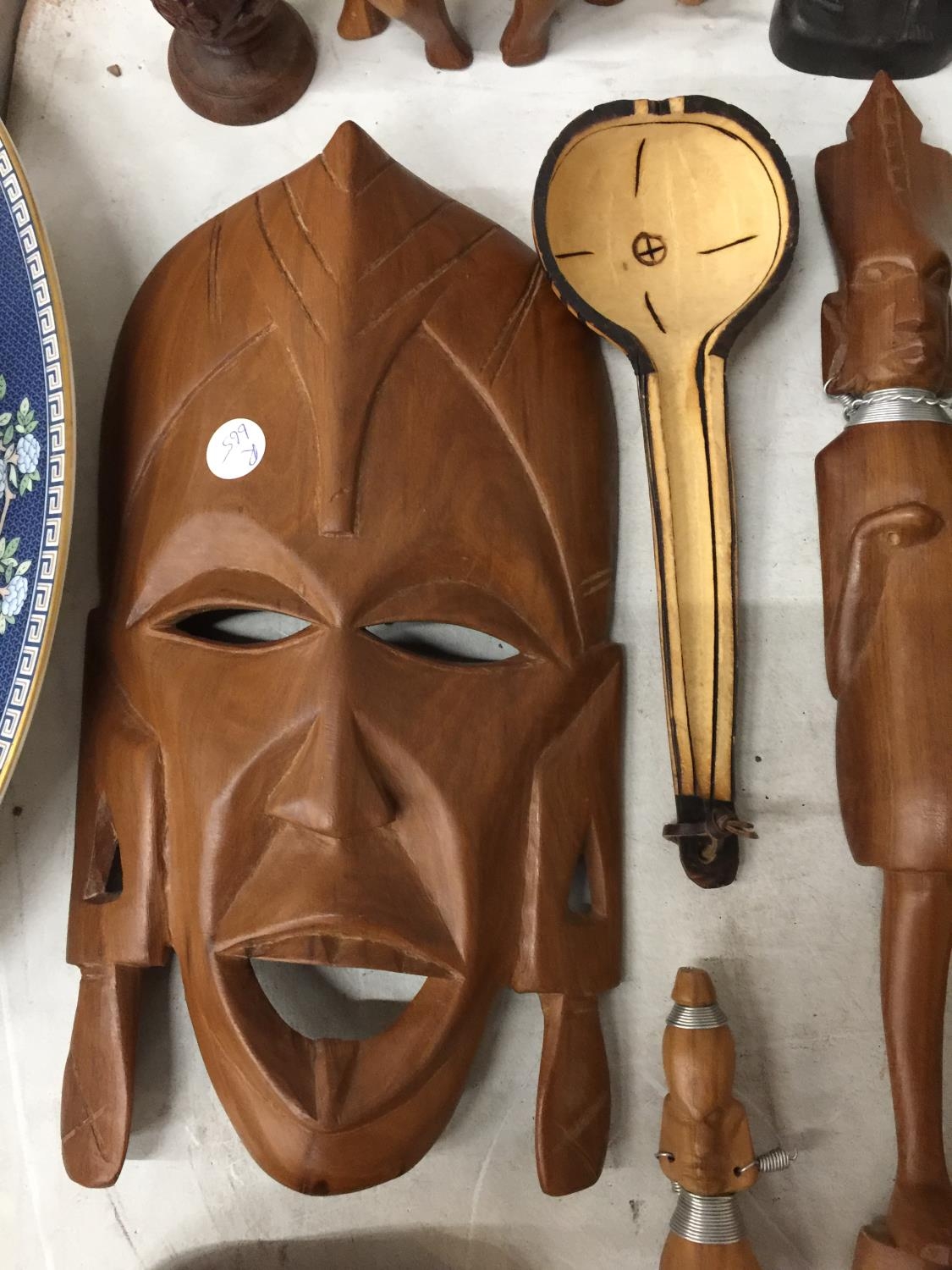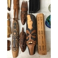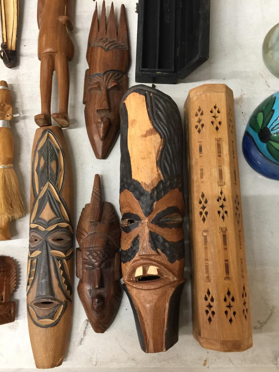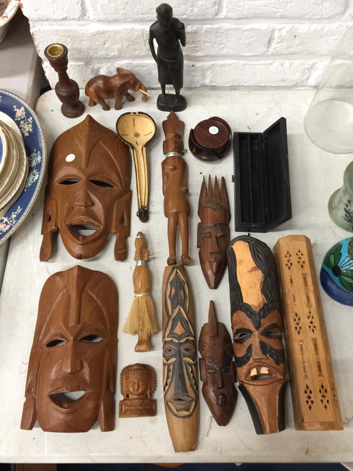 A QUANTITY OF TREEN ITEMS TO INCLUDE AFRICAN MASKS, FIGURES, BOX, COASTERS, ETC