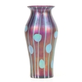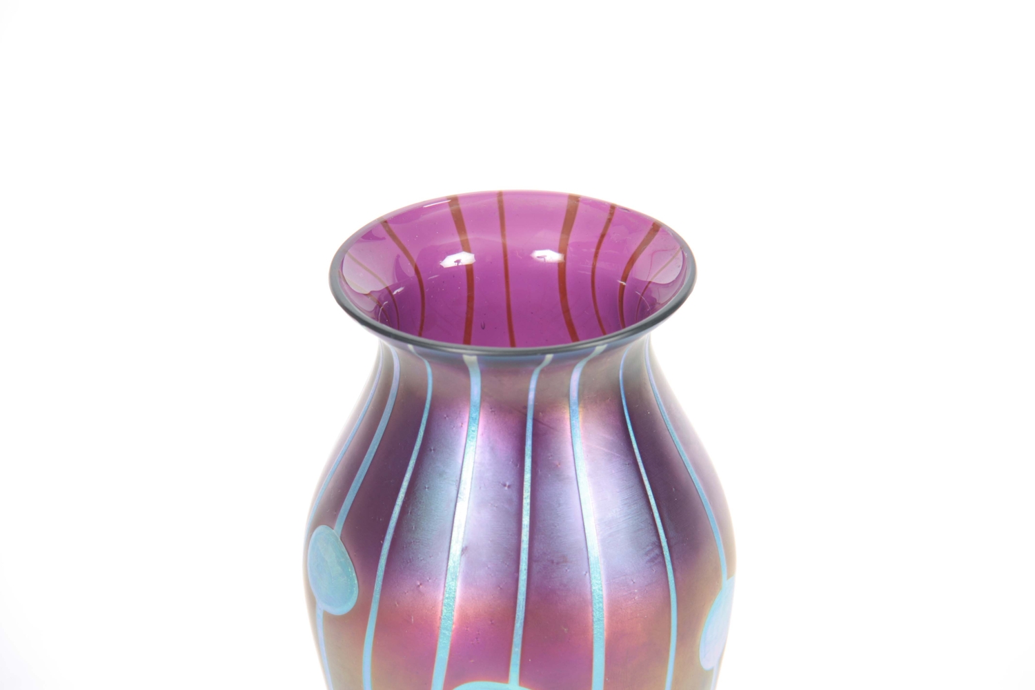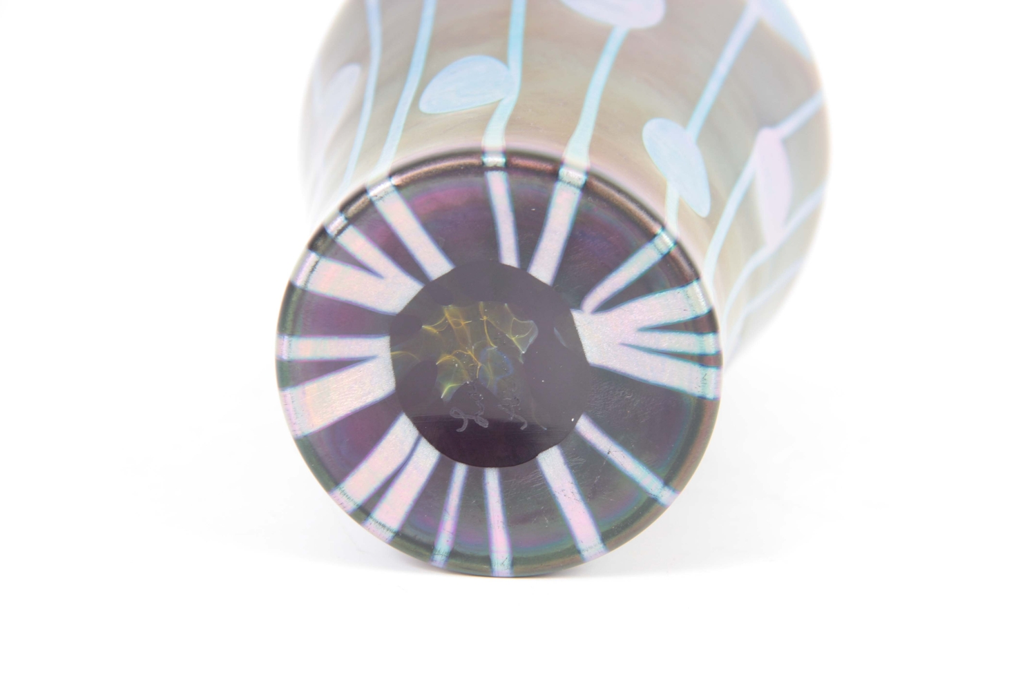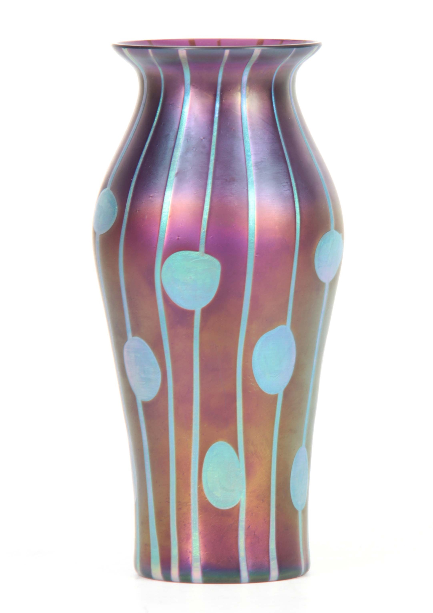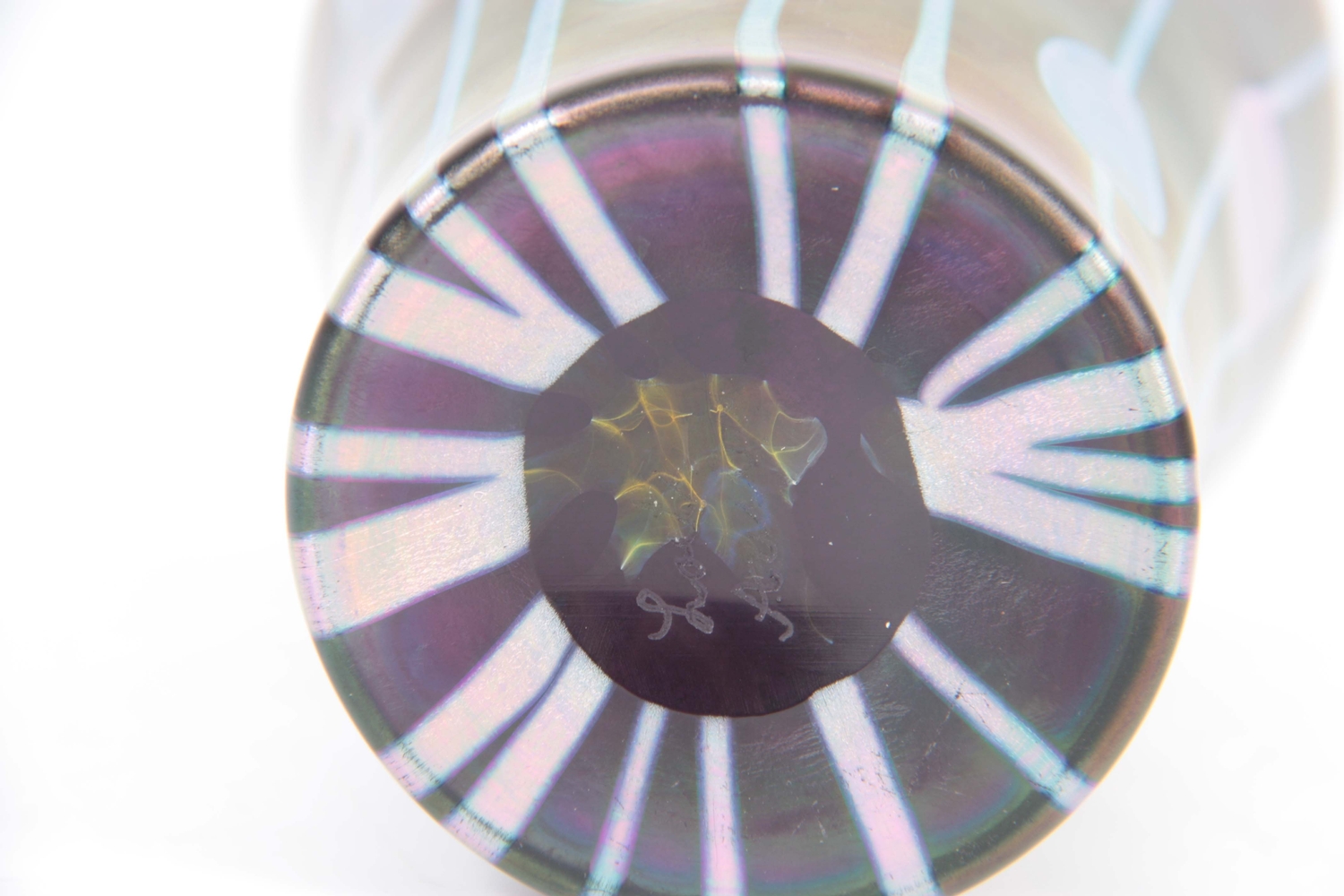 AN EARLY 20th CENTURY AUSTRIAN LOETZ IRIDESCENT GLASS VASE with stripes and spots decoration, signature to underside 20cm high