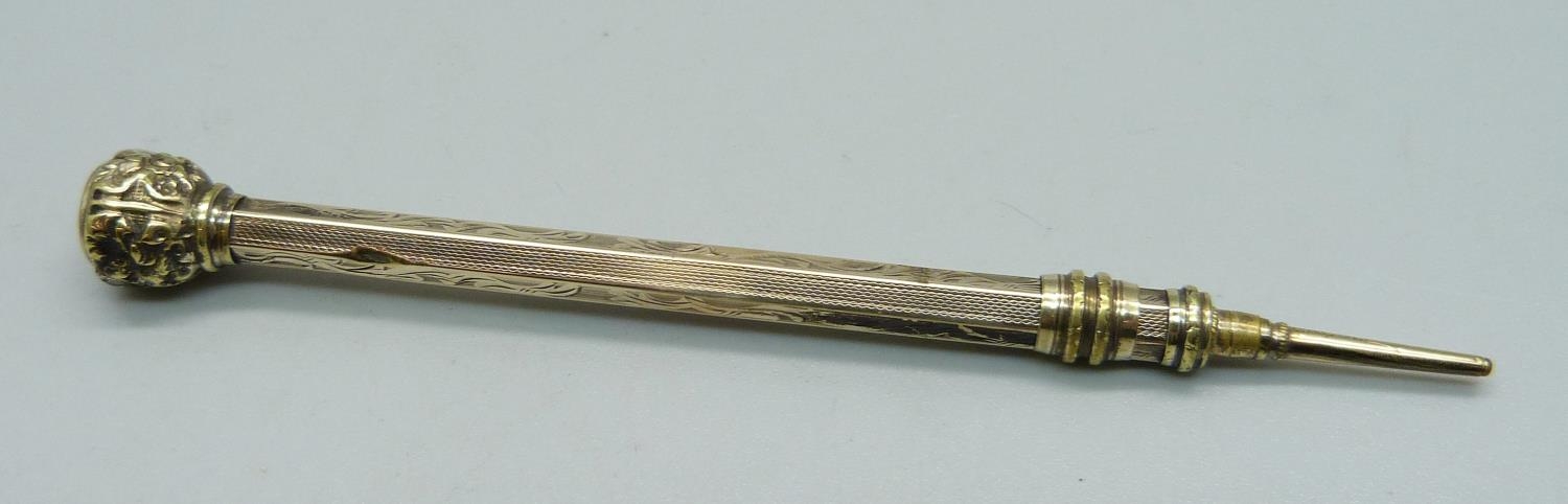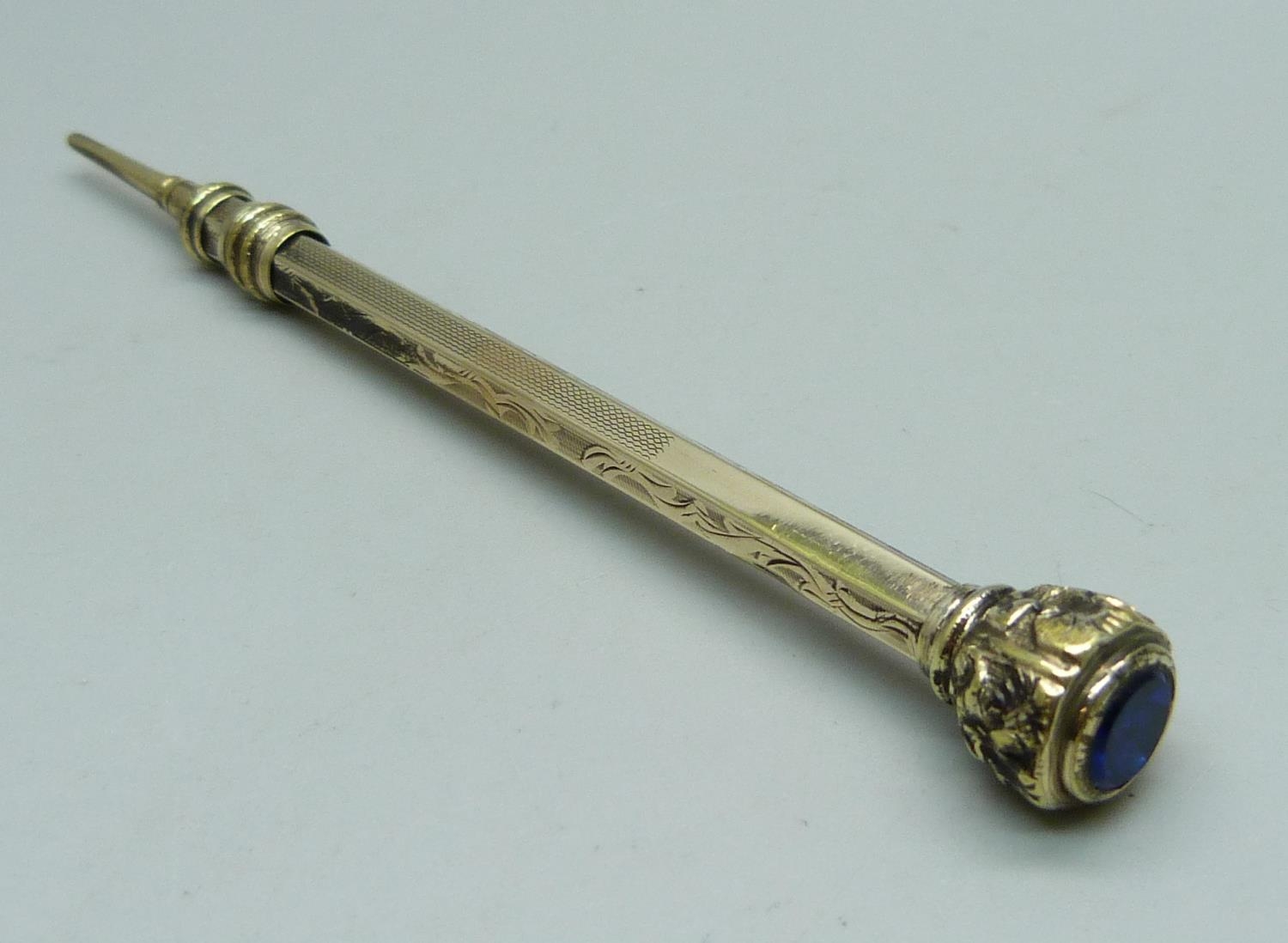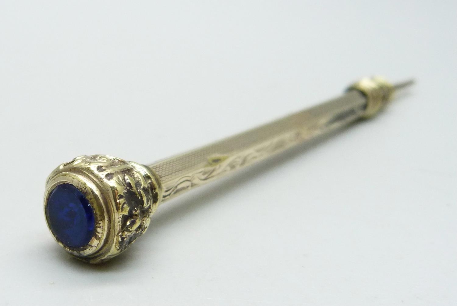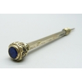 A propelling pencil, the top set with a blue 'stone'
