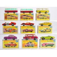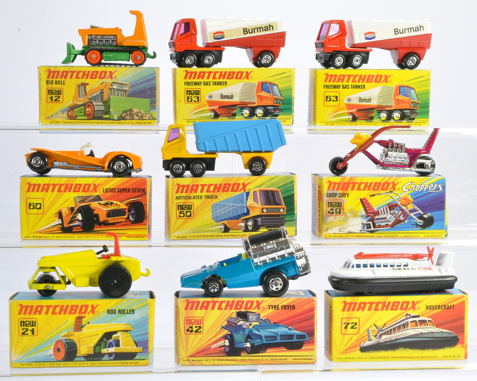 Matchbox Superfast comprising nine boxed issues as shown. Tyre Fryer, Burmah Tanker x 2, Big Bull etc. Mostly very good or excellent in some good but mostly very good/excellent boxes. Generally Ex-Shop Stock.
