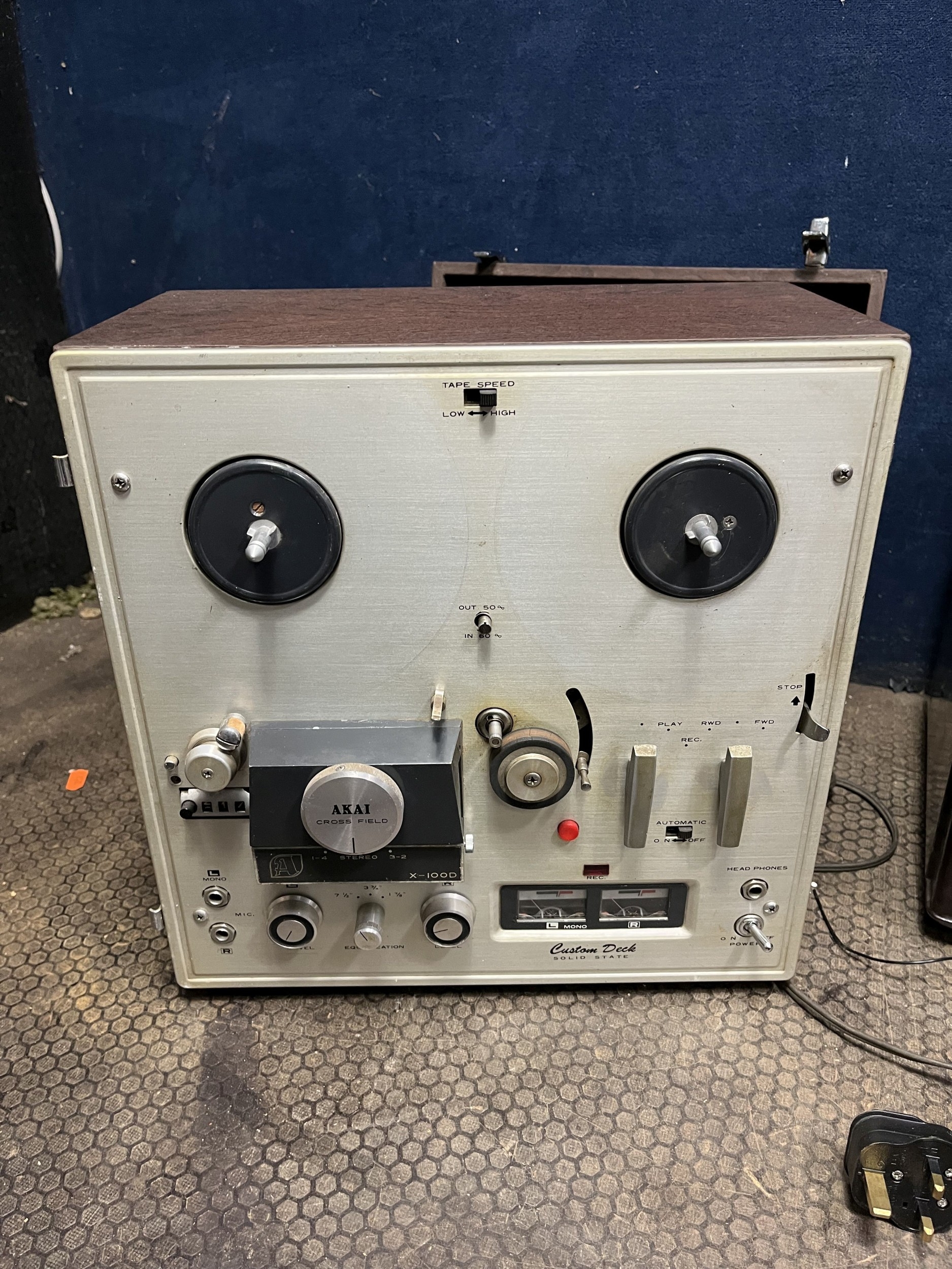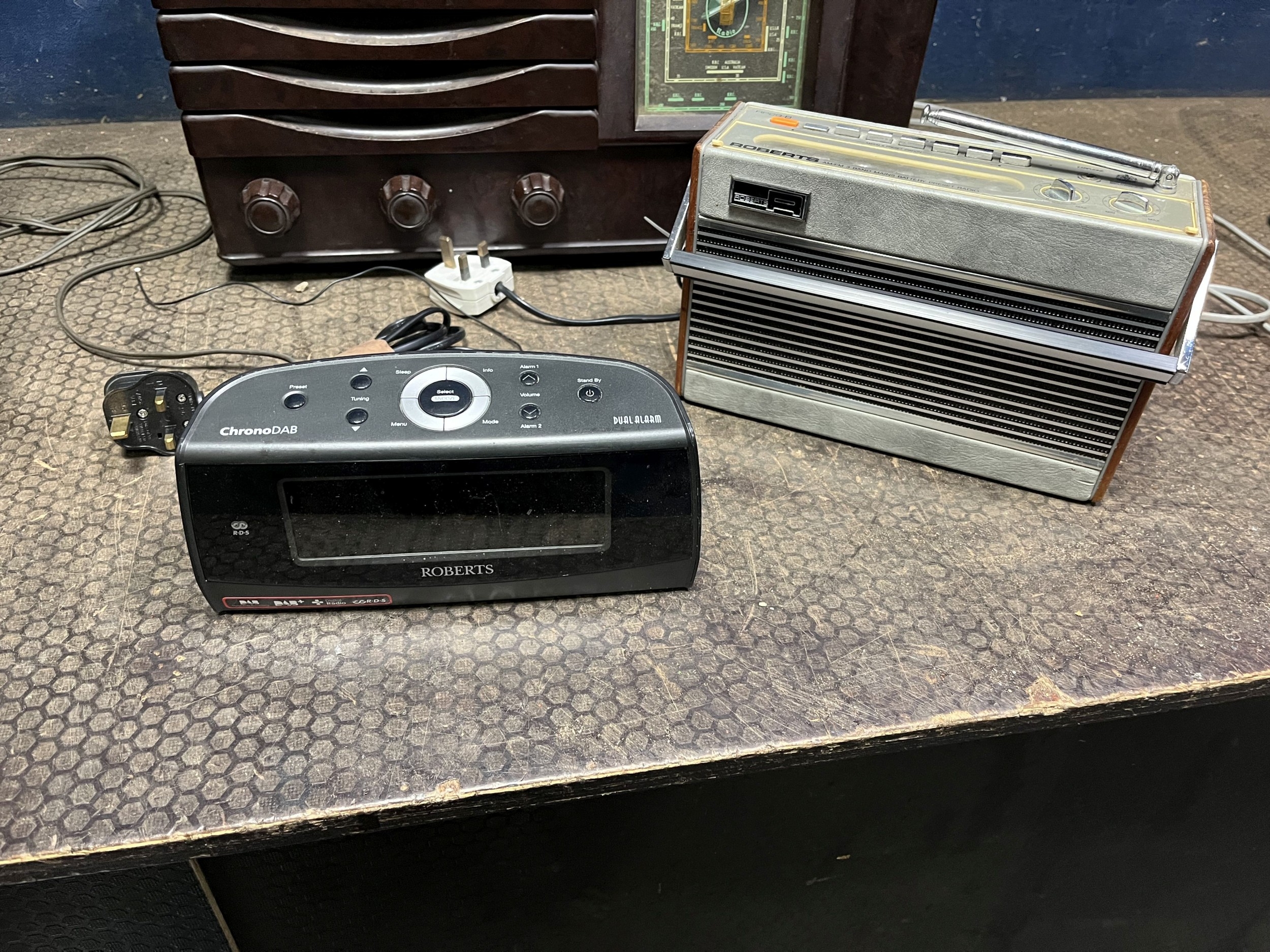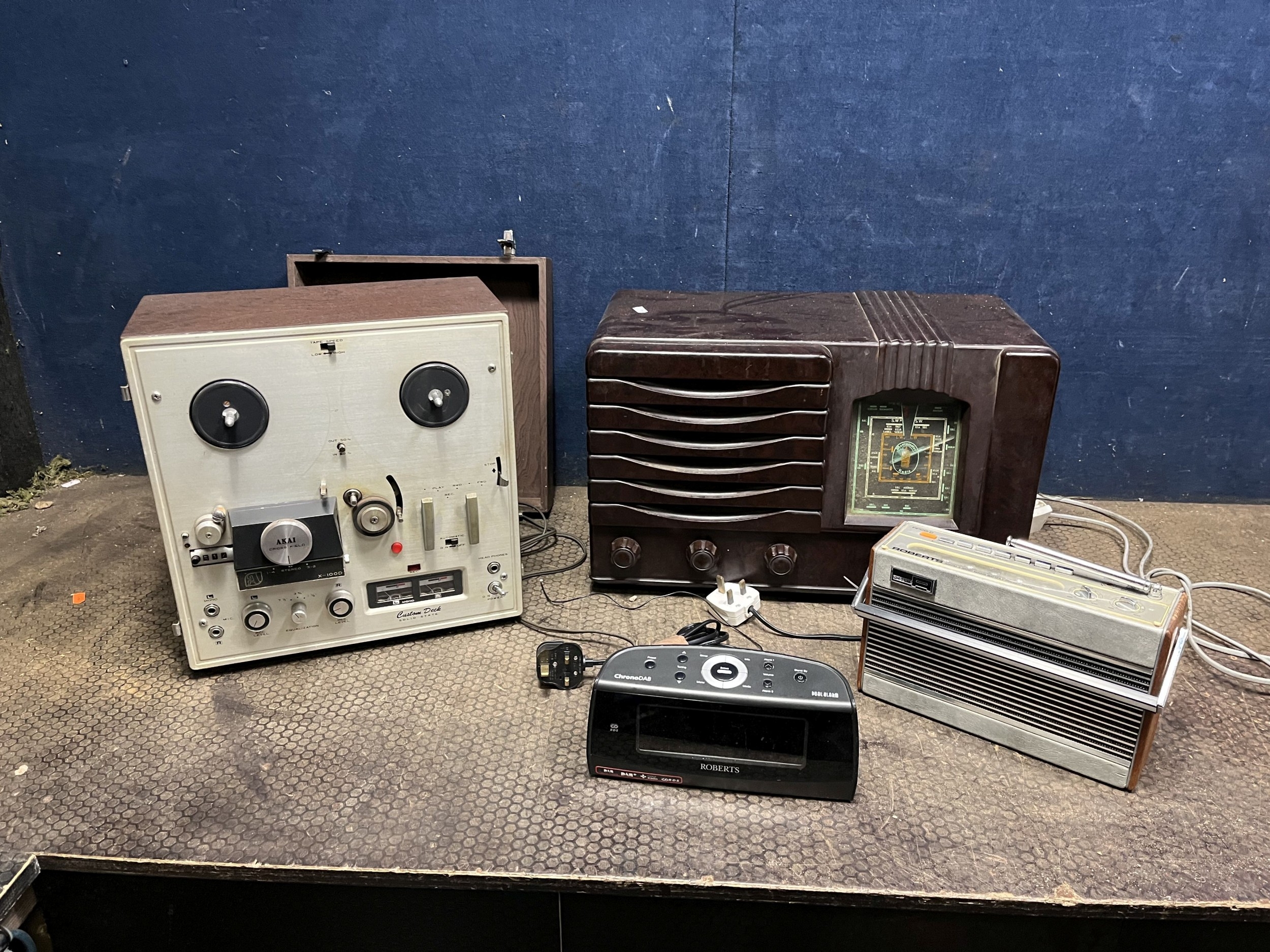 A COLLECTION OF VINTAGE AUDIO EQUIPMENT, including an Akai X-100D reel-to-reel recorder, a Westminster valve radio with a Bakelite case, a Roberts RP26Bradio and a Roberts Chrono DAB radio (all UNTESTED) (4)