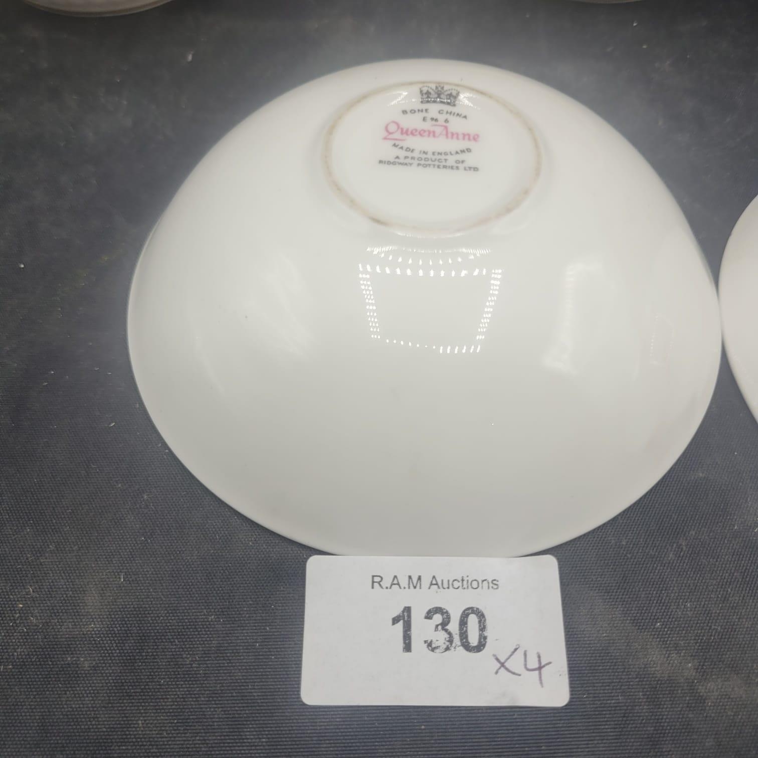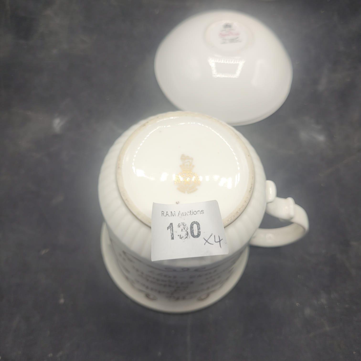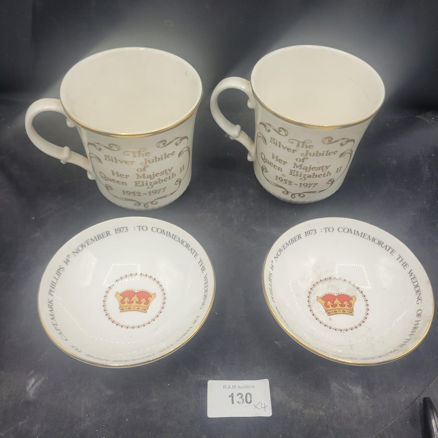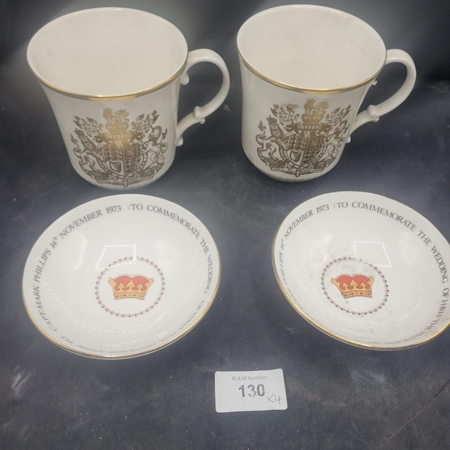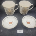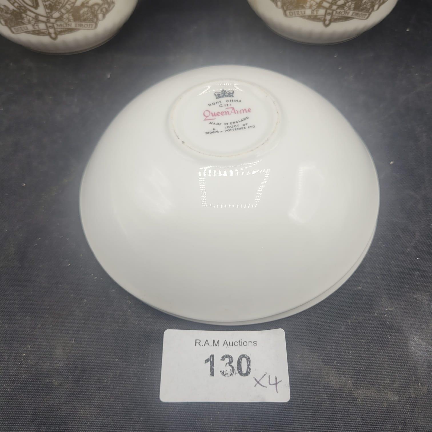 A Group of Four Queen Anne Bone China Royal Commemorative Mugs and Saucers
