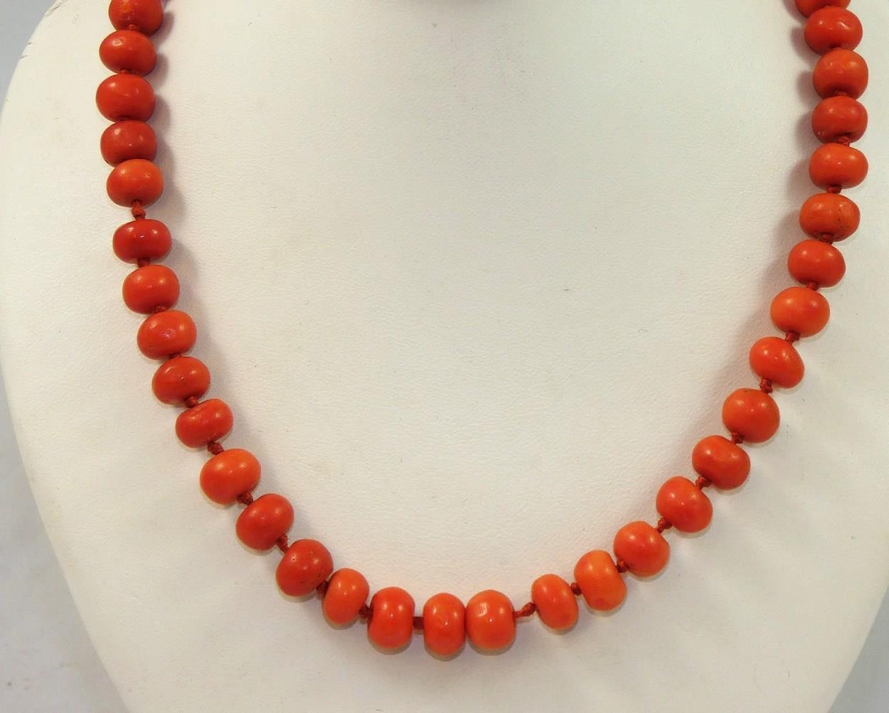 A Victorian coral bead uniform single row necklace, composed of 53 beads, 8 mm diameter, length 41cm, weight 38 gms.
