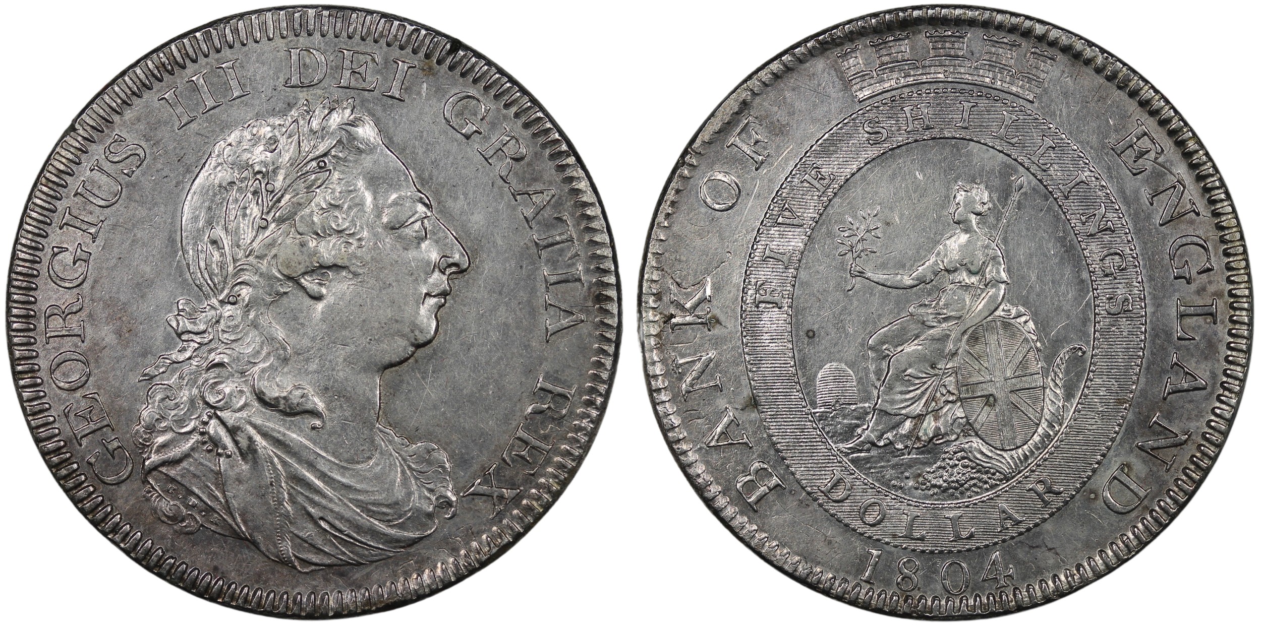 1804 Bank of England Dollar of 5 Shillings, George III. Type C/2 with 1st leaf of laurel to centre of E in DEI. Some trace of host coin through REX and below bust, and with much remaining through reverse legends. Cleaned and edge nick above U in GEORGIUS otherwise gVF. [ESC 149, Bull 1931, S.3768]