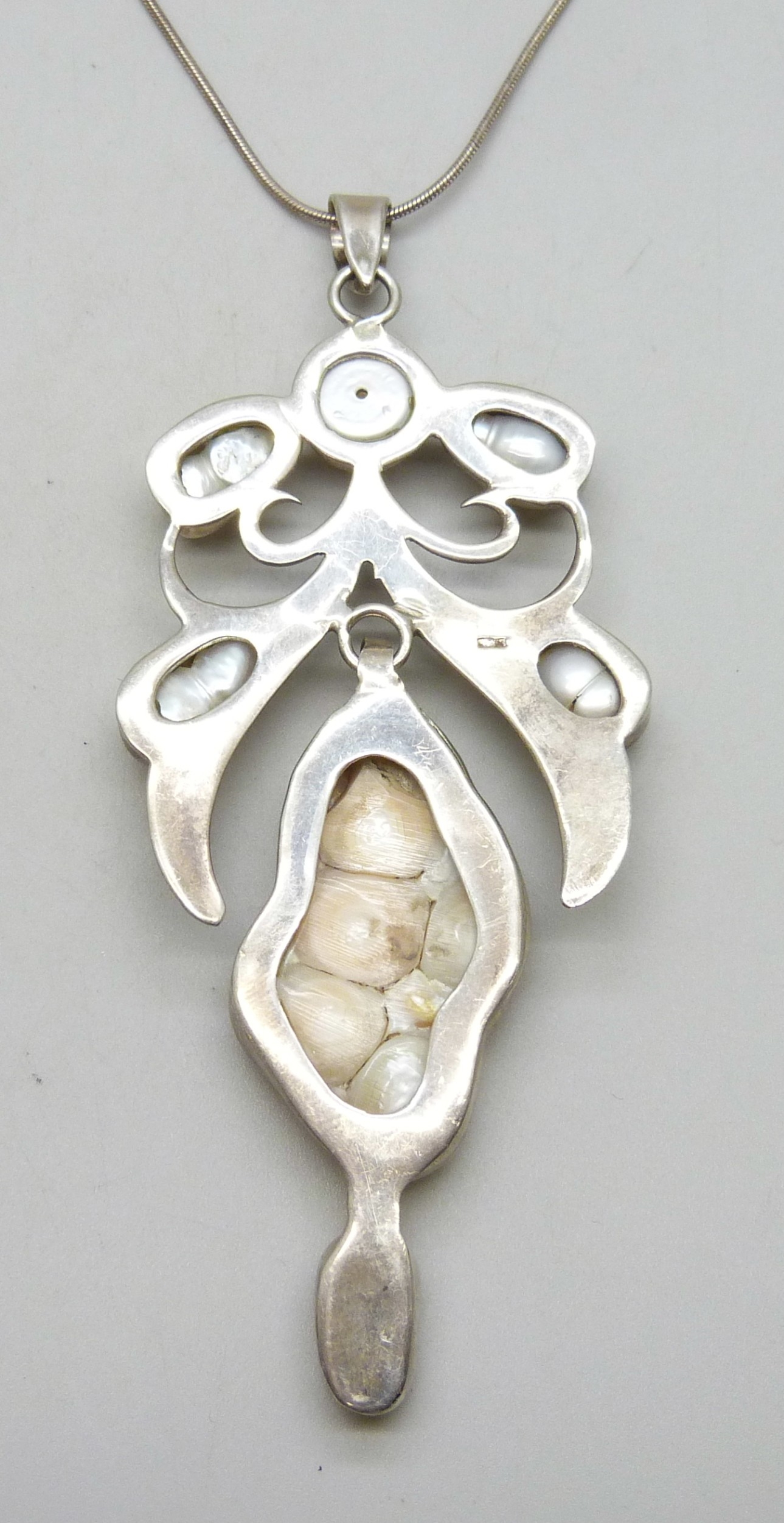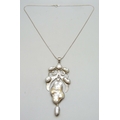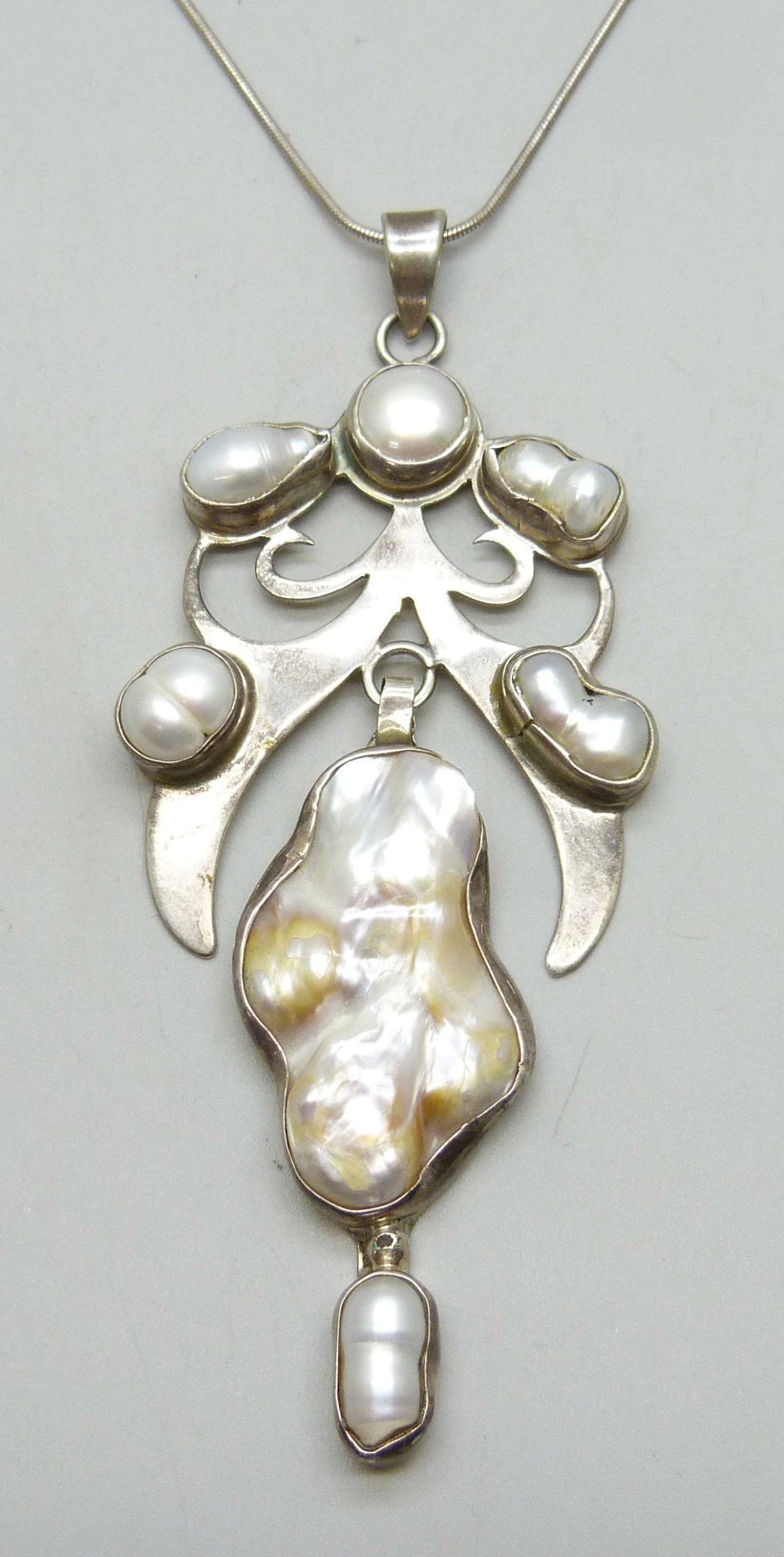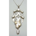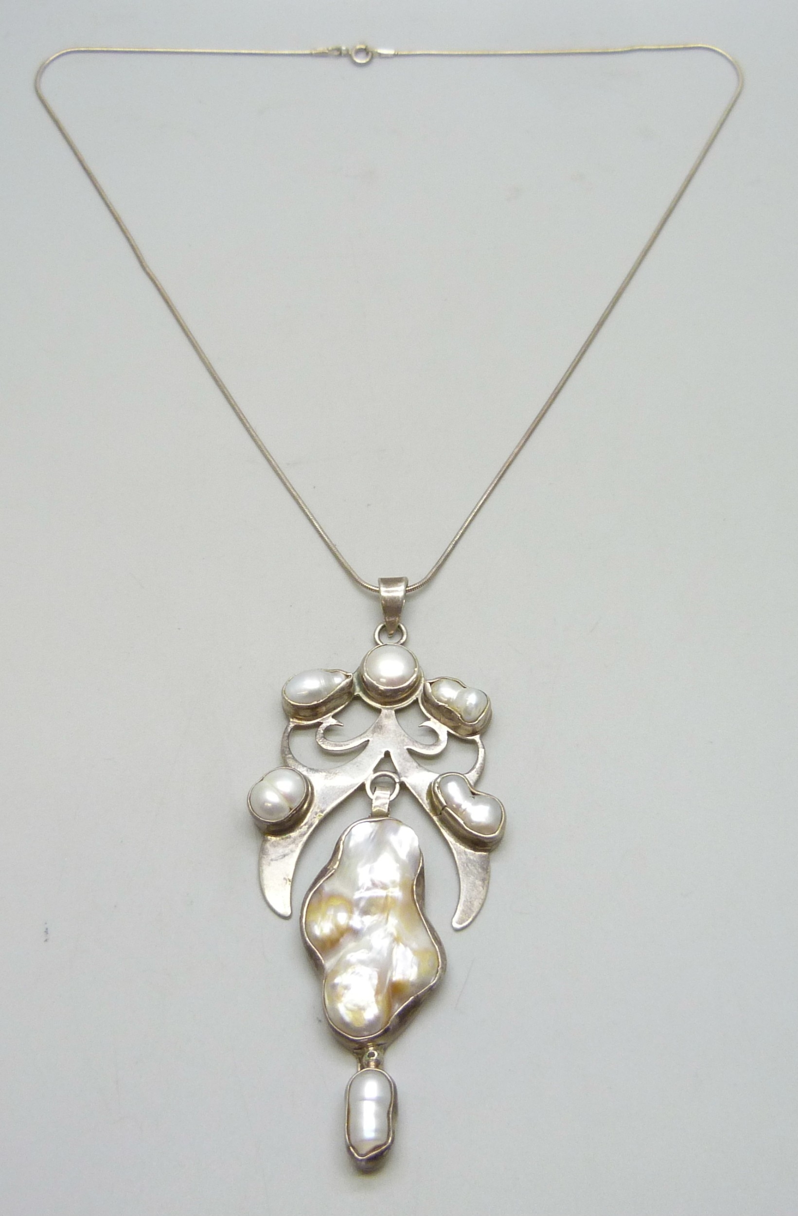 An Arts and Crafts style silver and baroque pearl statement pendant, 10.5cm including bail, on a silver chain, 34g total