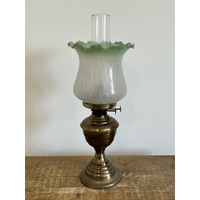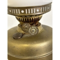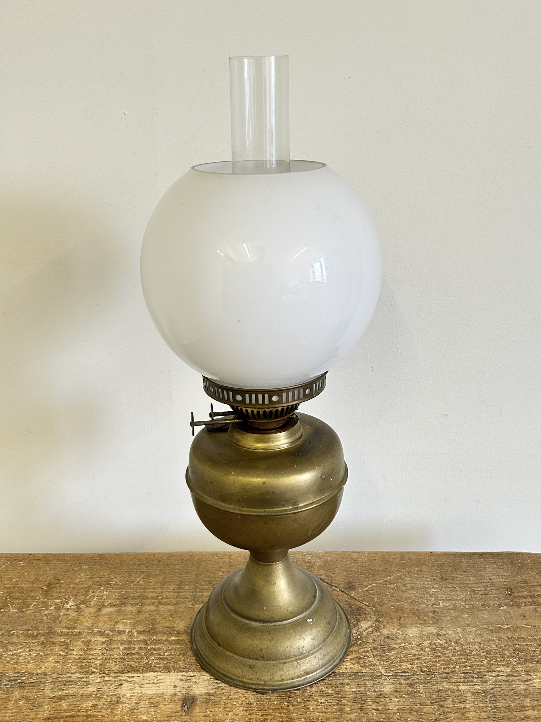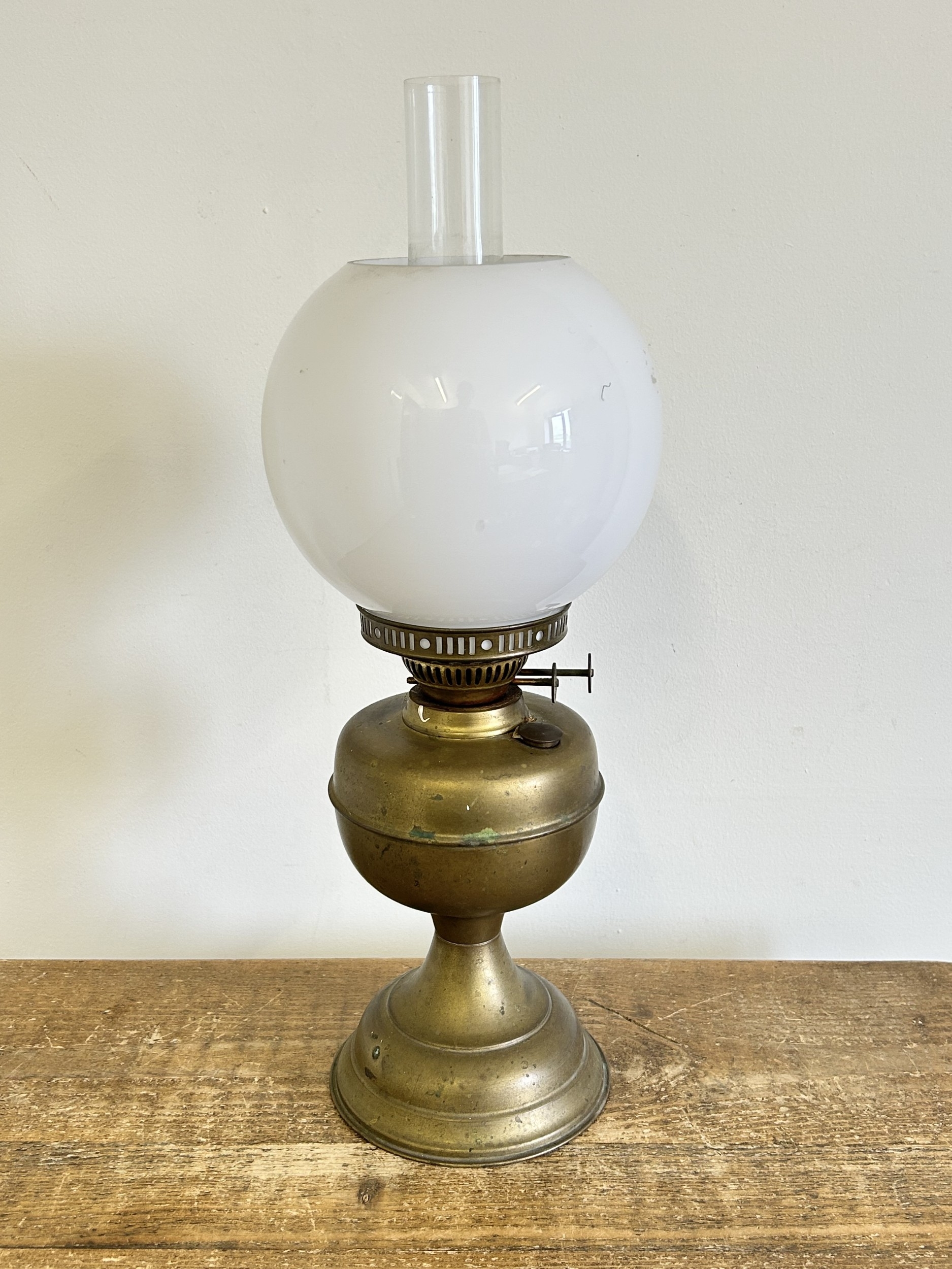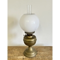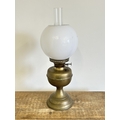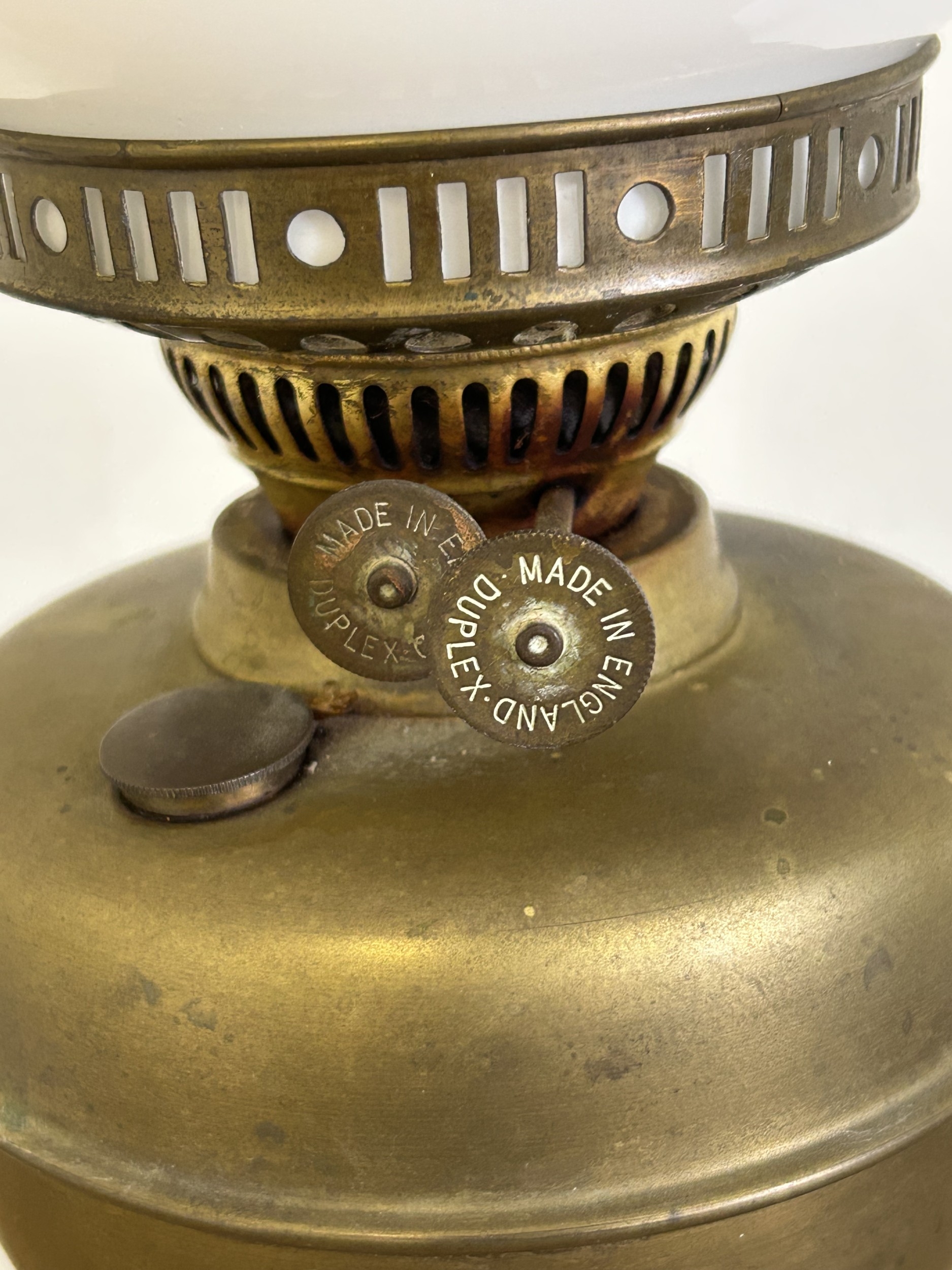 A vintage duplex brass base oil lamp with white glass shade and chimney, approx. 20" high
