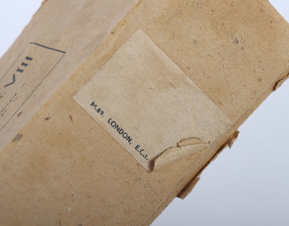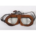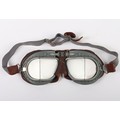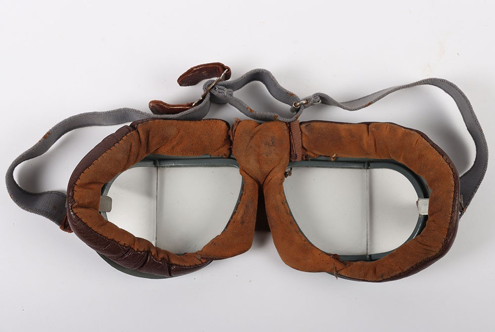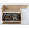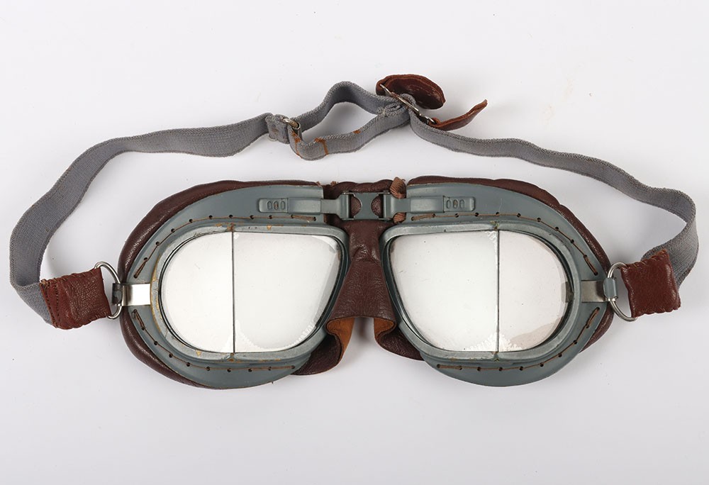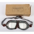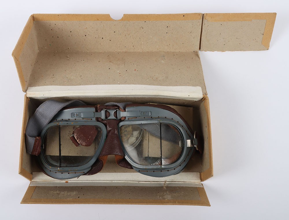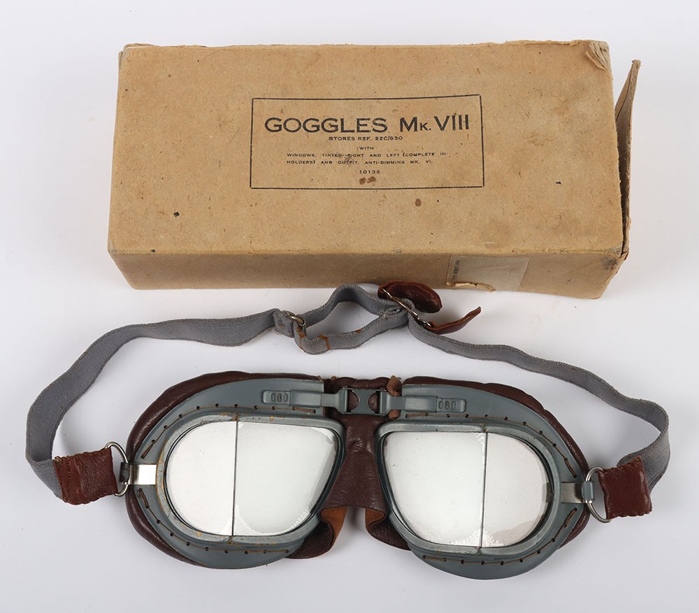 WW2 RAF Mk.VIII Flying Goggles, Unissued in Box. A very nice pair of original Mk.VIII flying goggles within their original box of isssue. The goggles themselves are in fantastic condition with the original blue grey paint upon the brass frames. The lenses are good and clear with neat leather surrounds and chamois leather face cushion. The elasticated strap remains in situ with the adjustment buckle and leather tabs. The box also houses a spare pair of lenses and a plastic pot with the '22C/1875 Outfit Anti-Mist' upon the lid. The box is marked to the lid with 'Goggles Mk.VIII' and the 'AM with crown to the end. A split is in the card on the lid section. Otherwise a great pait of goggles.