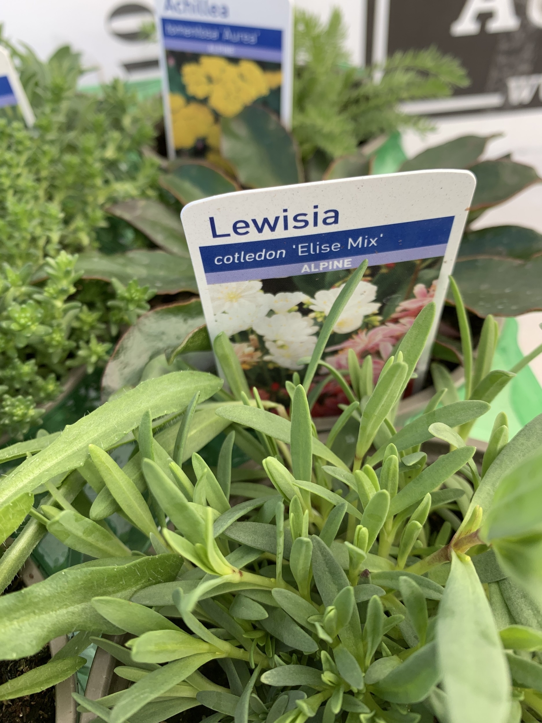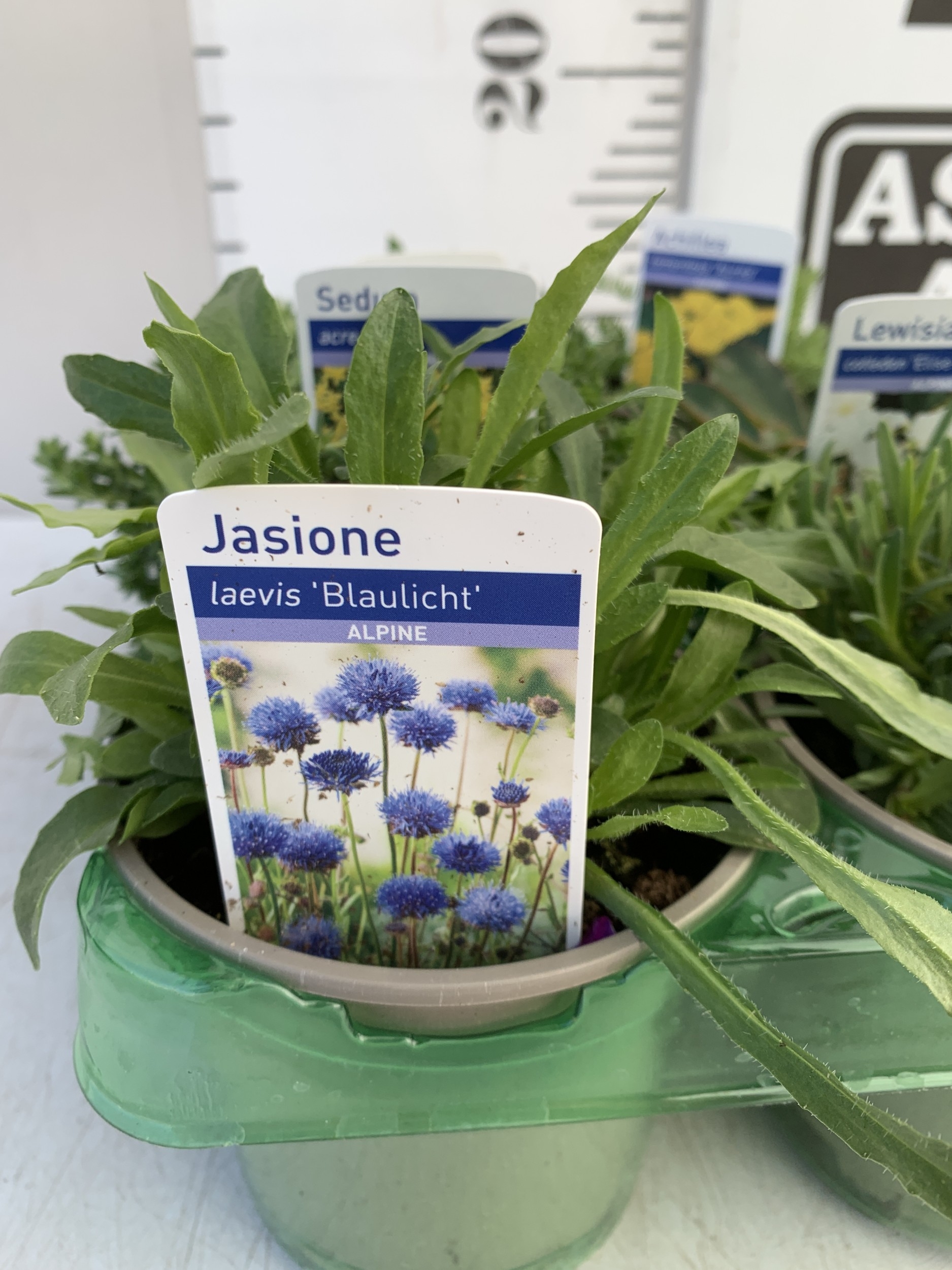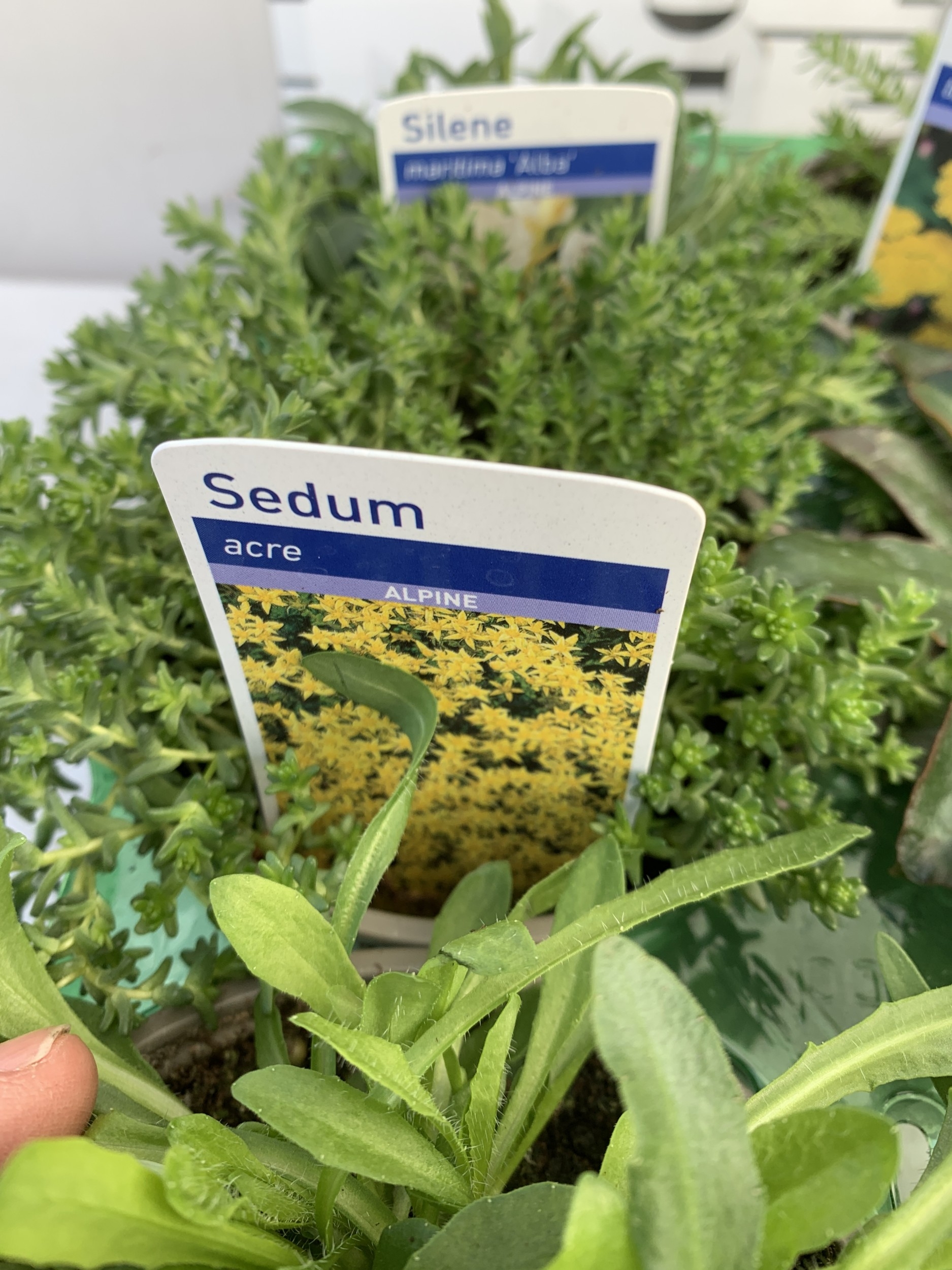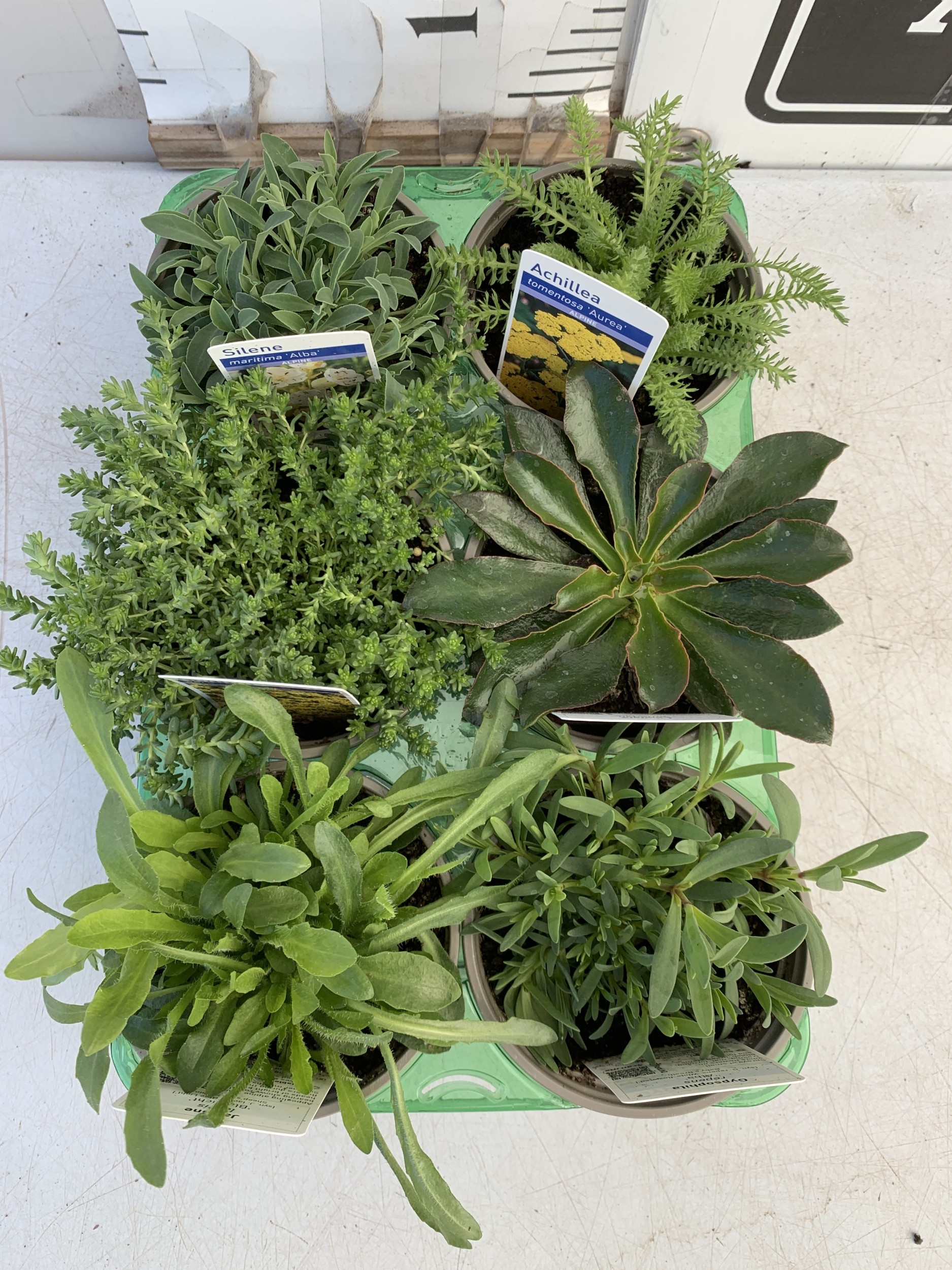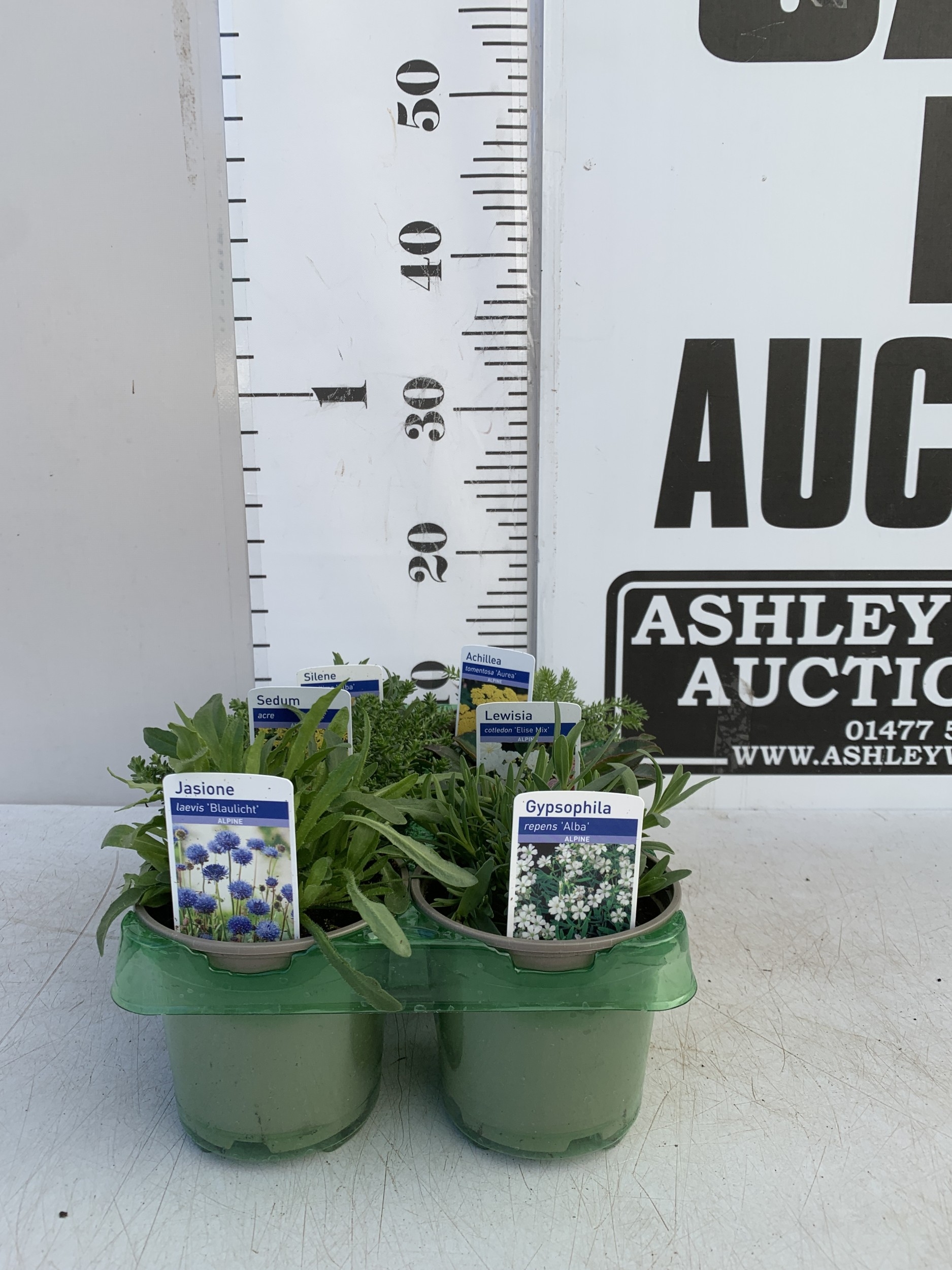 SIX MIXED ALPINE PLANTS- ONE GYPSOPHILA REPENS 'ALPINE', ONE LEWISIA COTLEDON 'ELISE MIX', ONE ACHILLEA TOMENTOSA 'AUREA', ONE JASIONE LAEVIS 'BLAULICHT', ONE SEDUM 'ACRE' AND ONE SILENE MARITIMA 'ALBA' IN P9CM POTS. TO BE SOLD FOR THE SIX