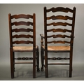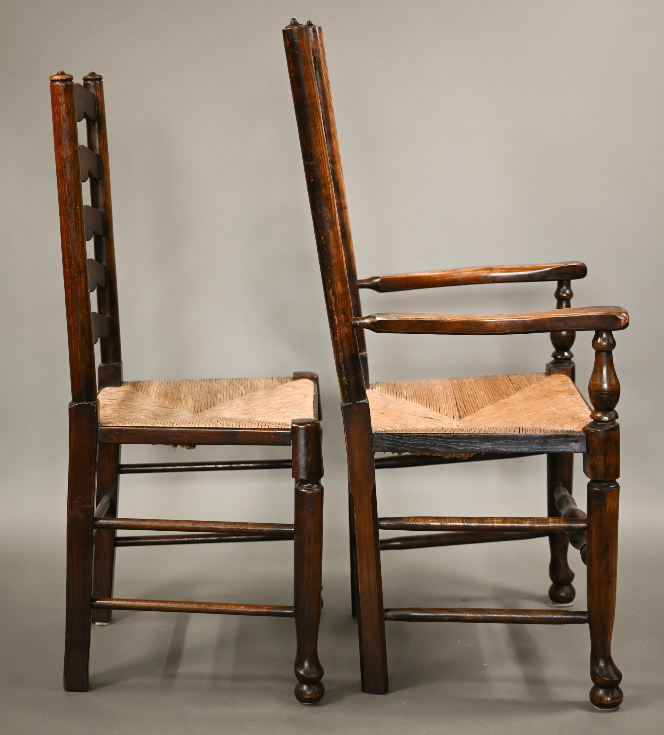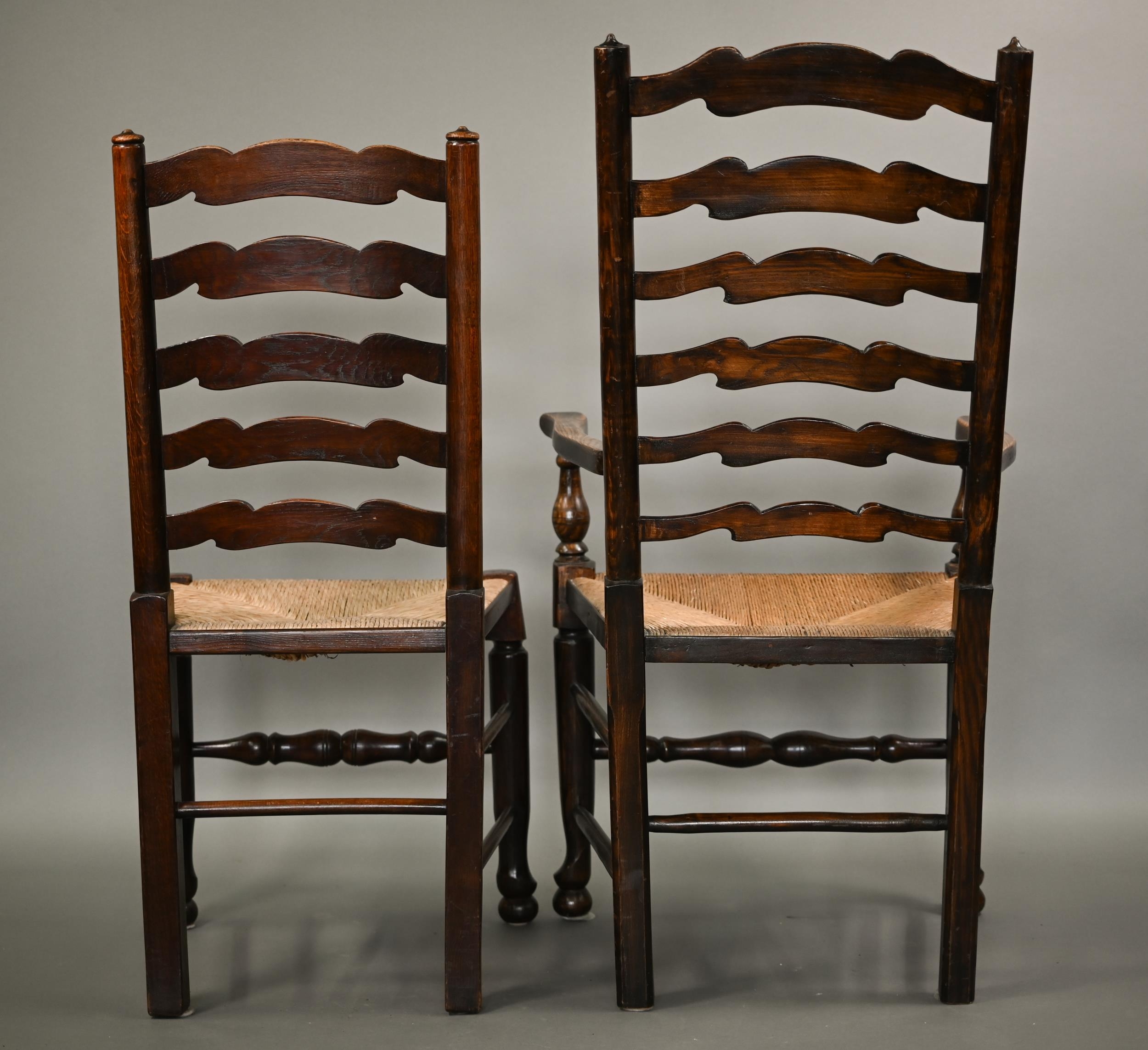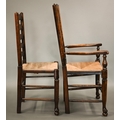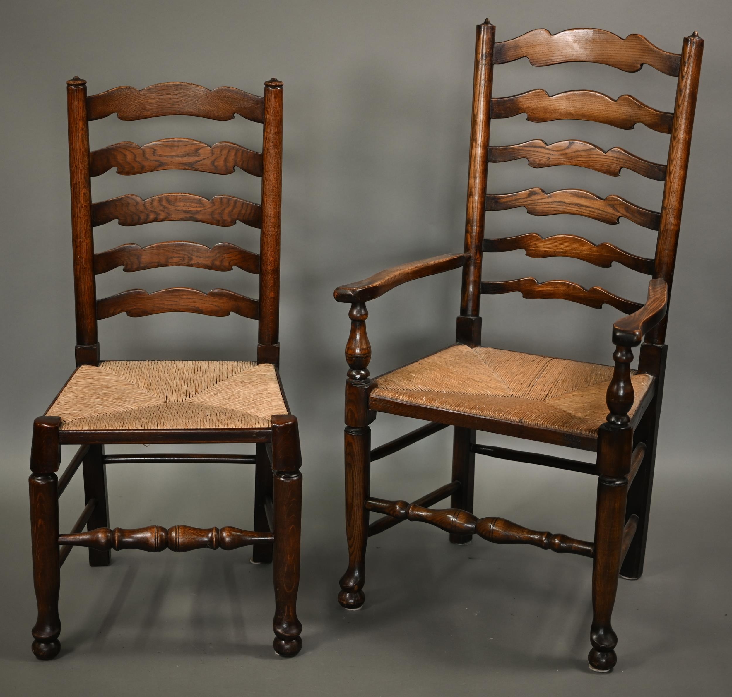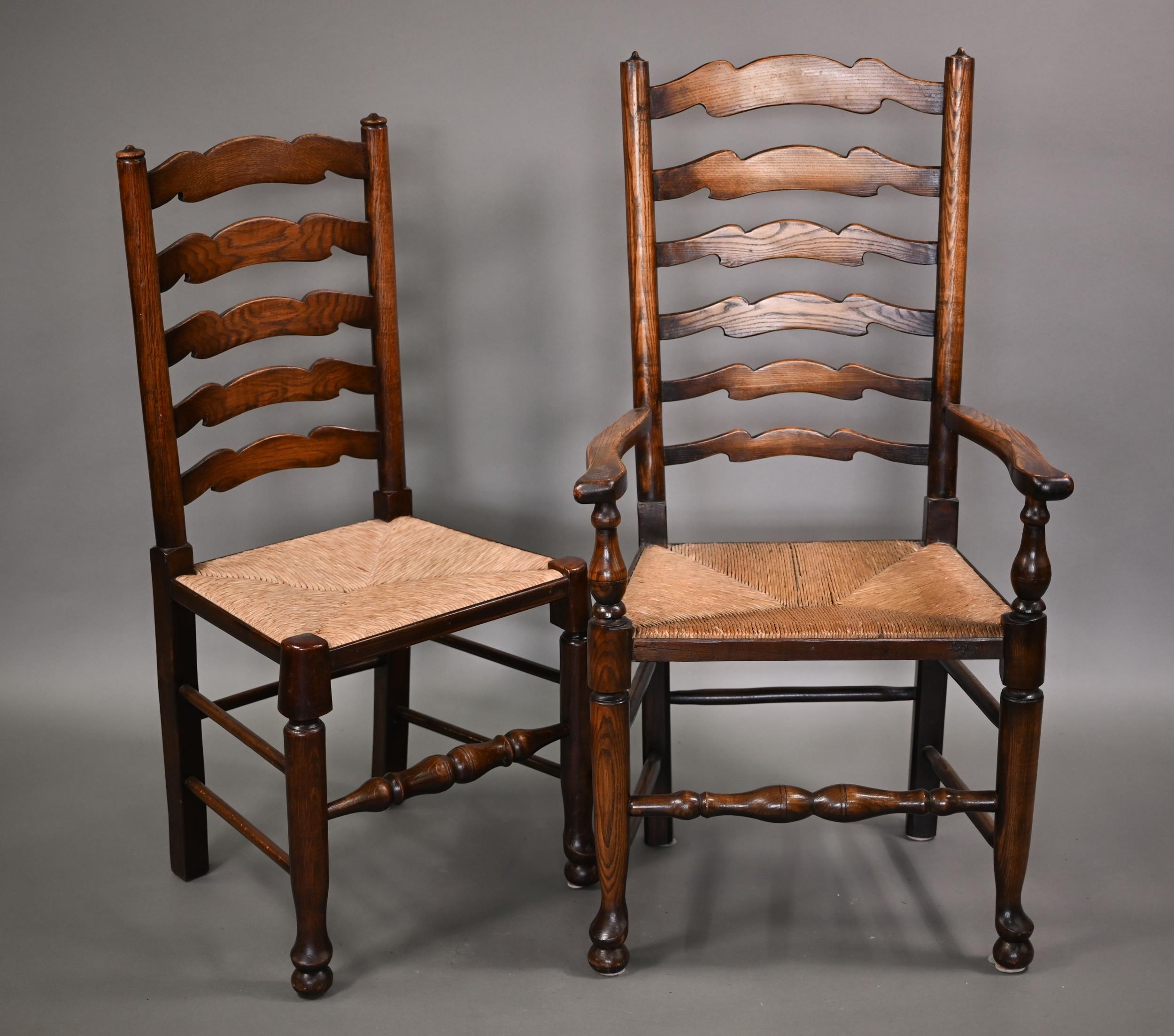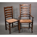 A close set of eight traditional Lancashire ash framed rope seat wavy ladderback dining chairs, comprising six side chairs and a pair of carvers (8)