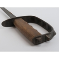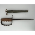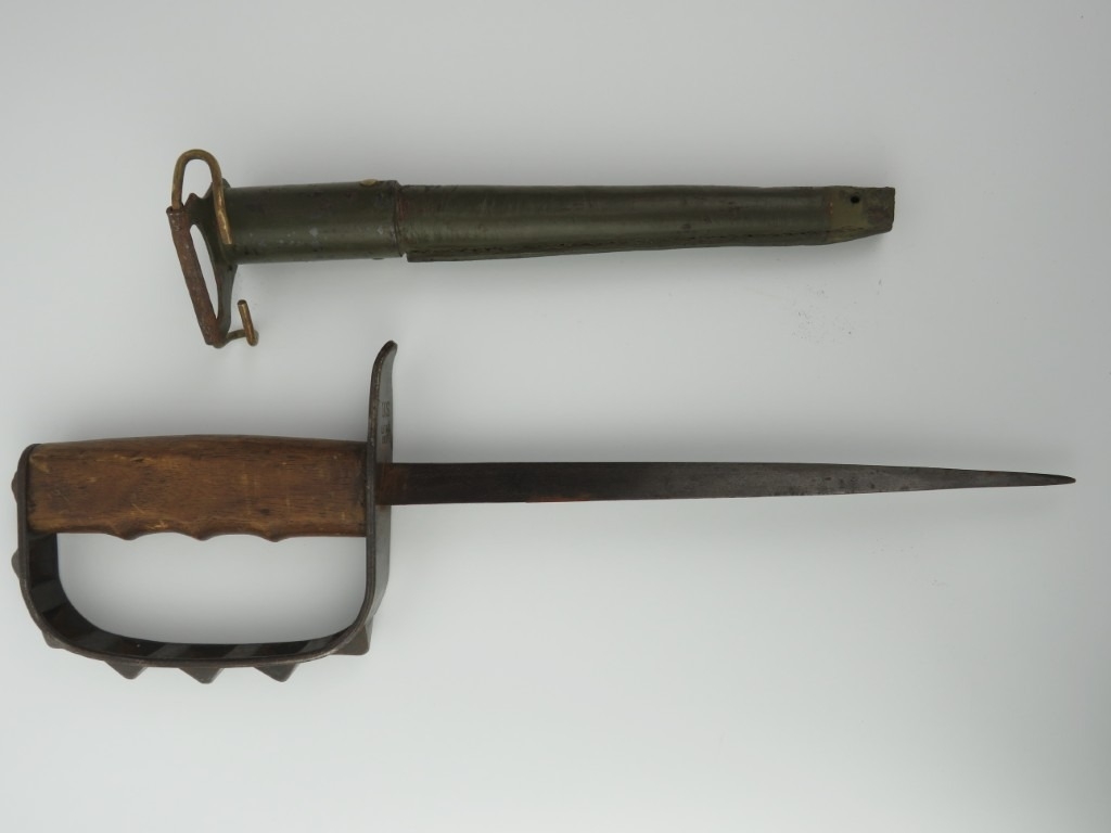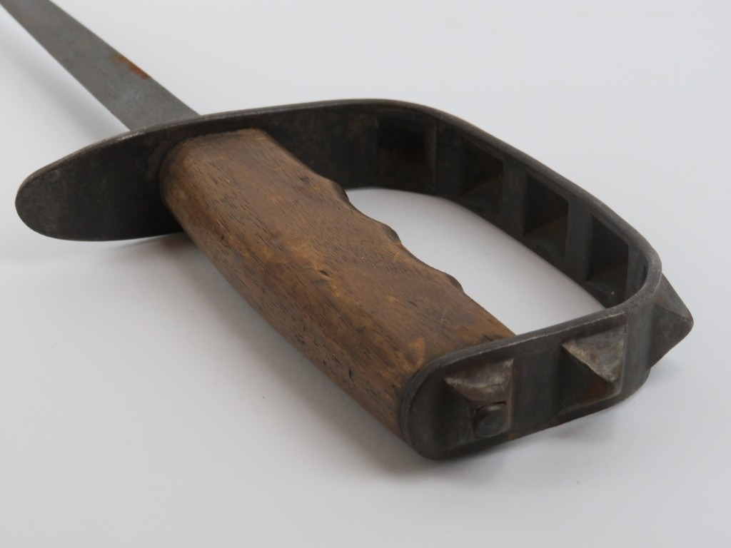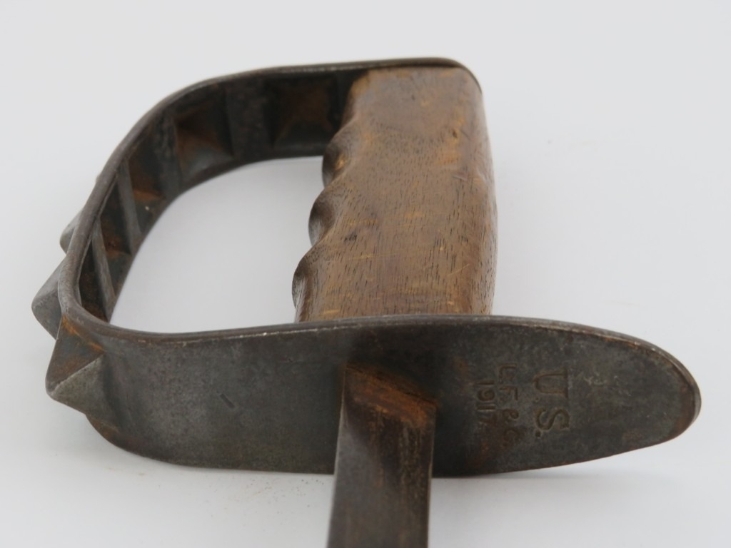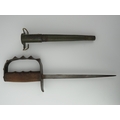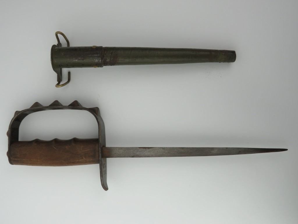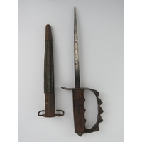 A WW1 American 1917 trench knife and scabbard by Landers, Frary, and Clark. With tapering triangular section stiletto blade and studded knuckle guard. Guard stamped 'US L.F.& C. 1917’. 35.3 cm total length.