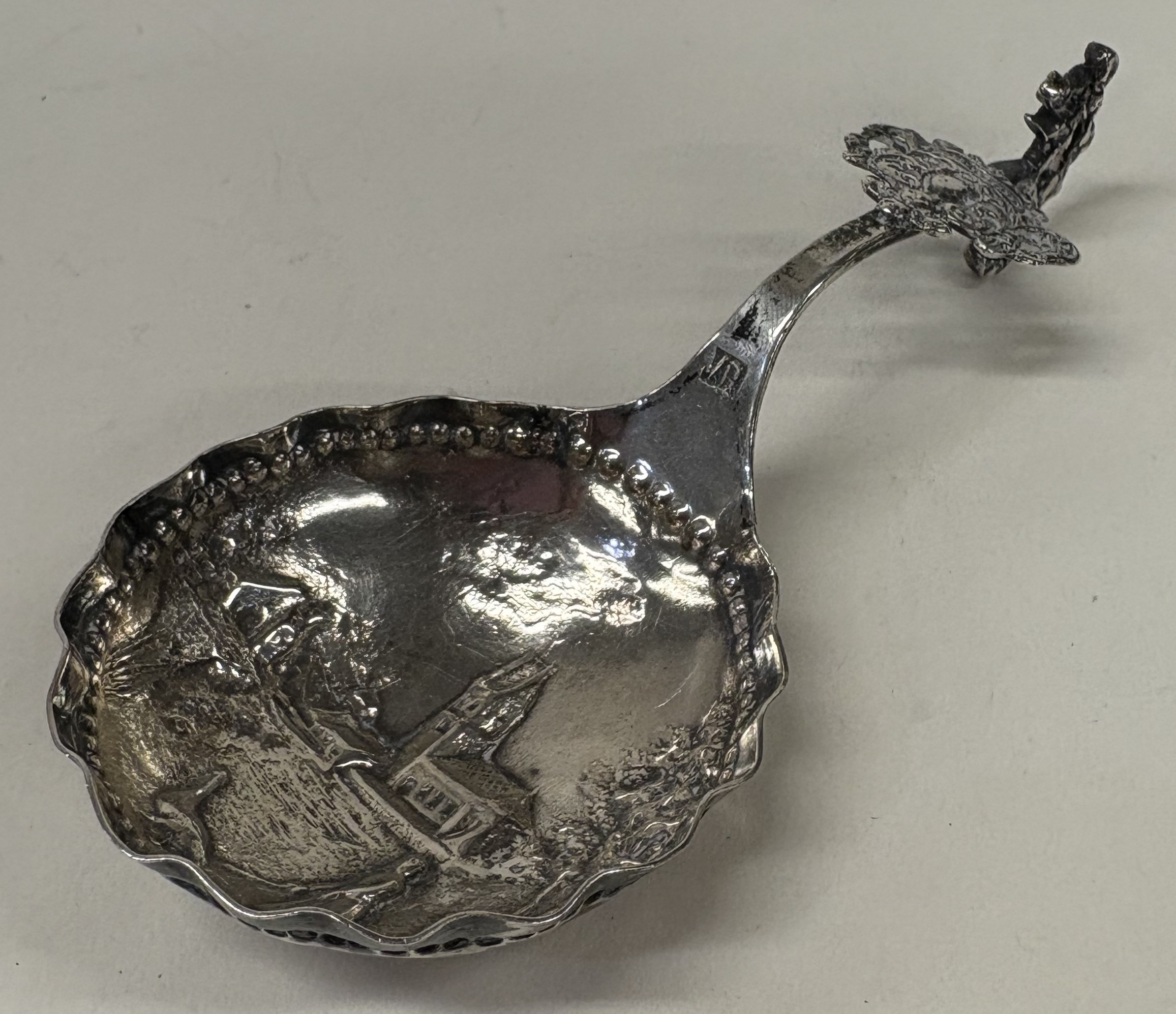 A silver caddy spoon with figural handle. Bearing import marks. By Berthold Muller. Approx. 29 grams. Est. £50 - £80.