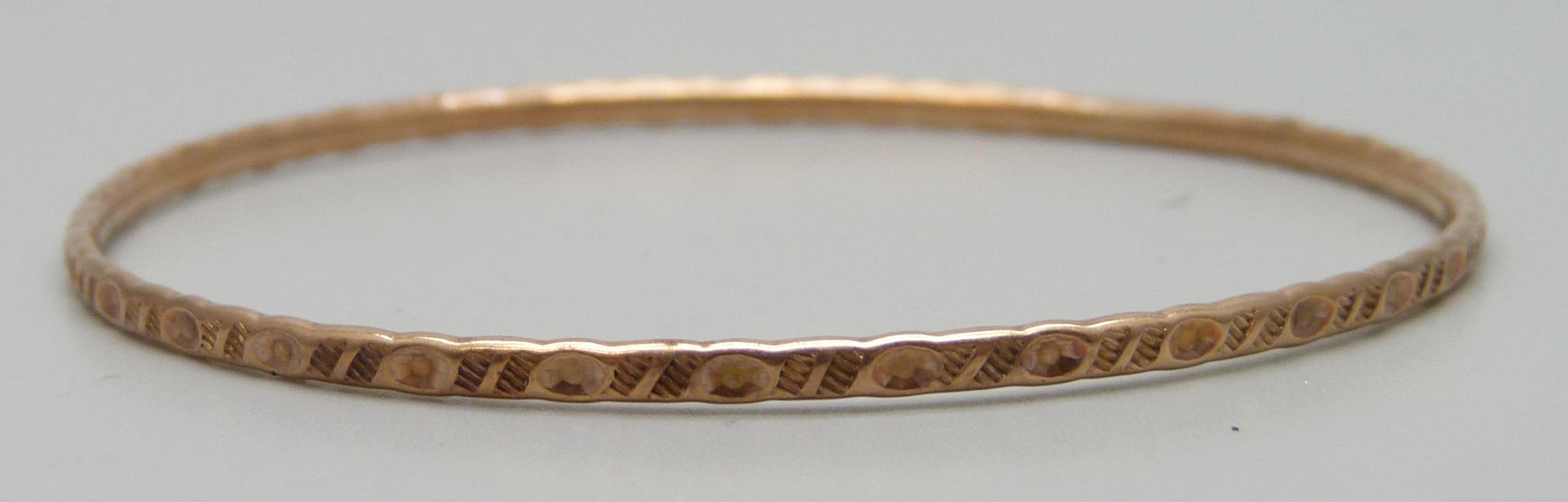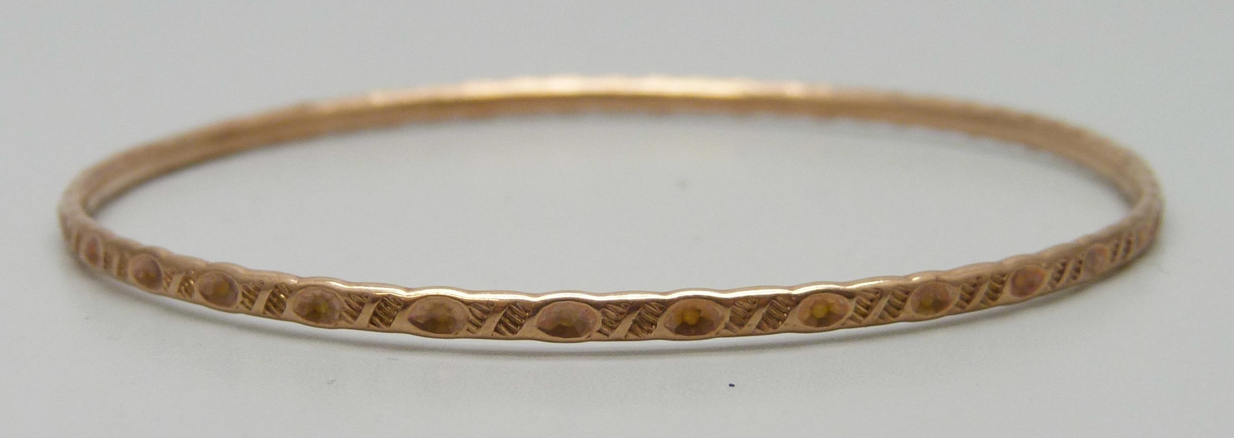 A 9ct rose gold bangle, Chester, 1908, 6.9g, 6.2cm