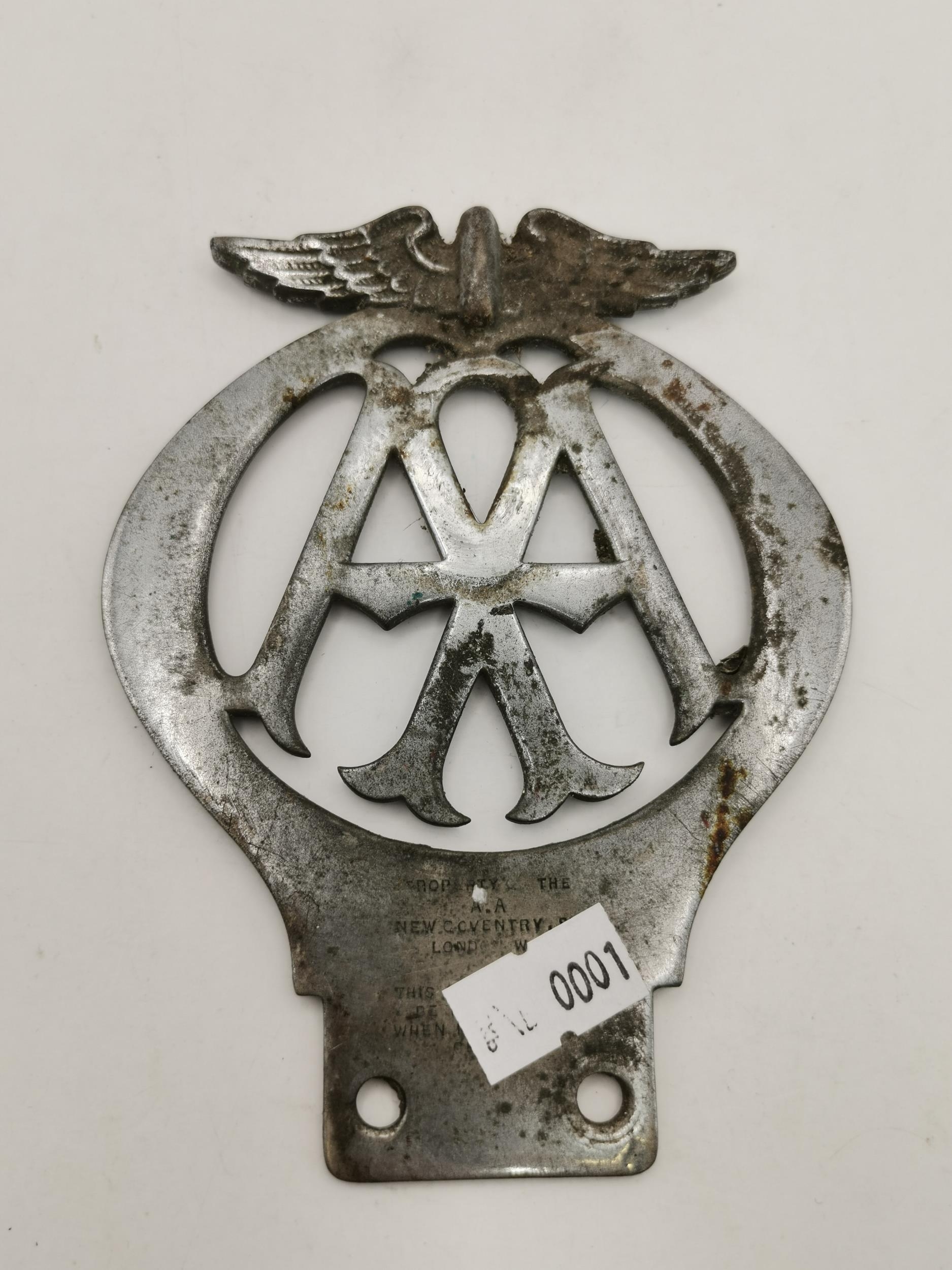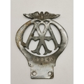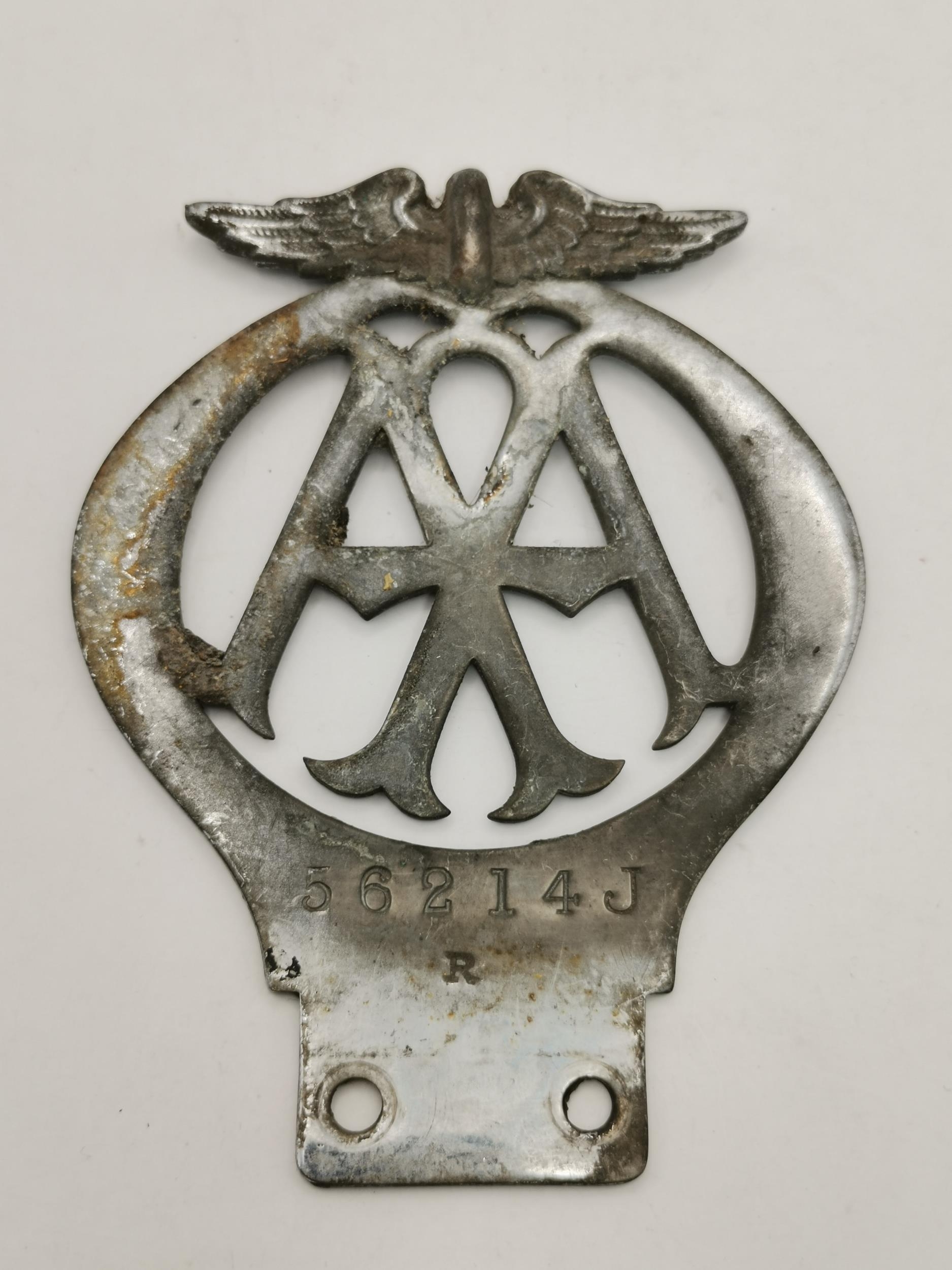A vintage AA chrome car badge, late 1930s (1939), issuing number 56214J. 12.4cm high overall