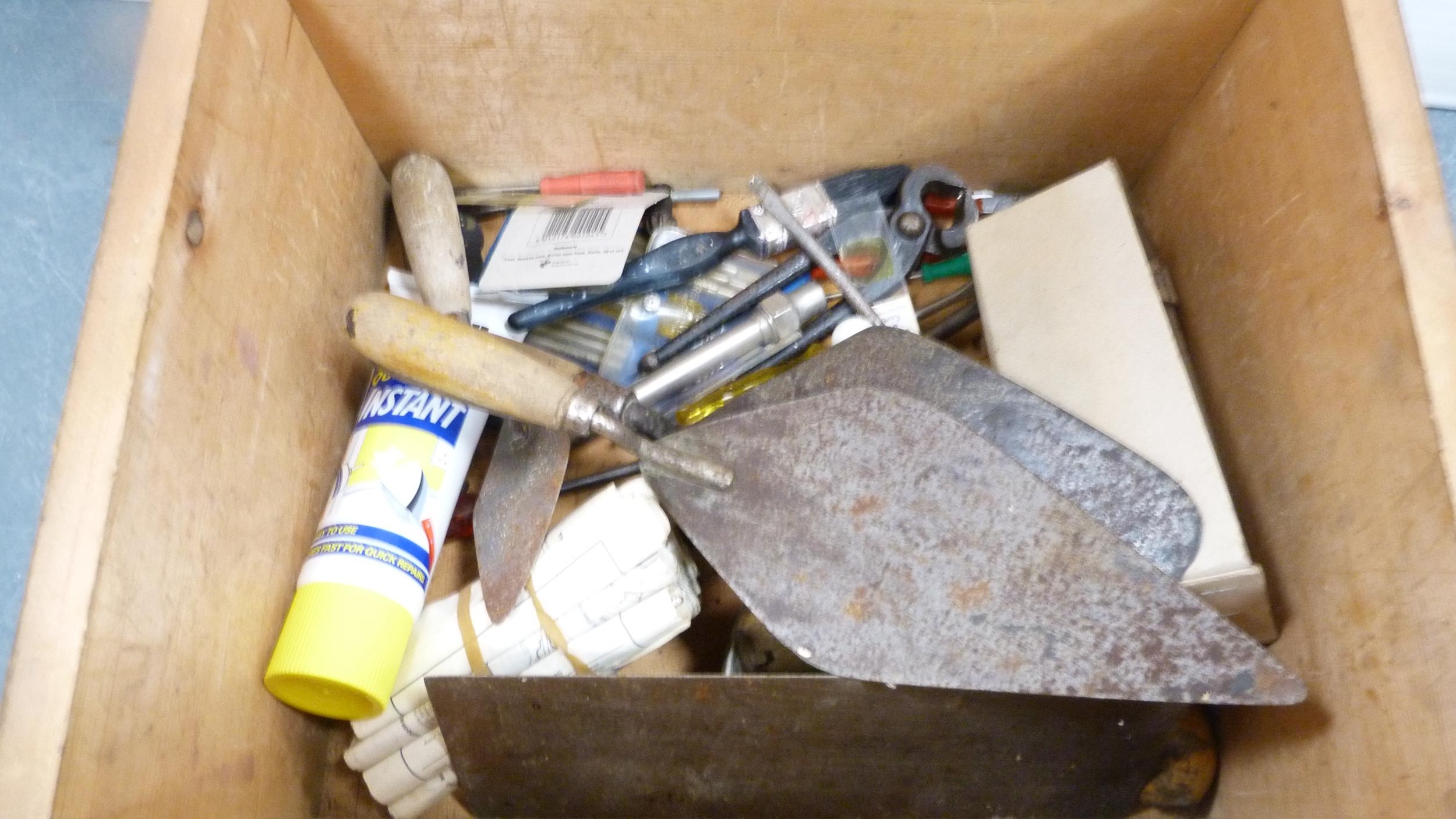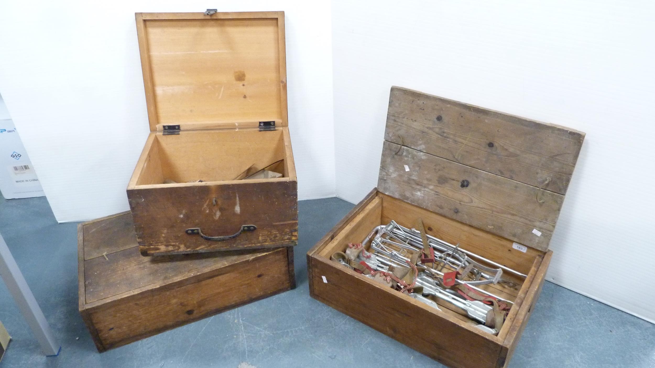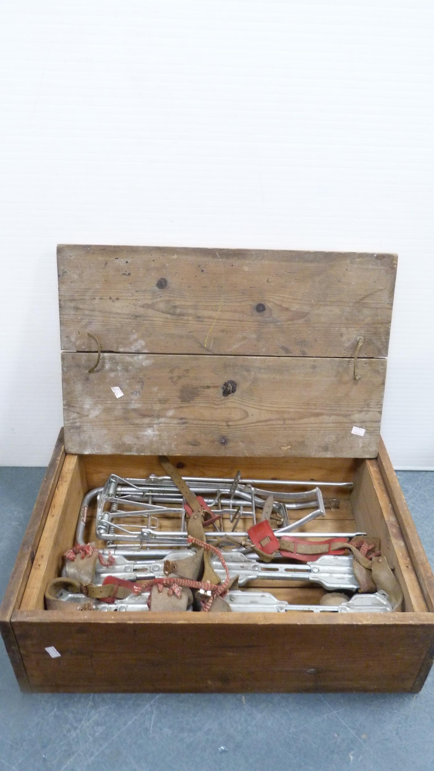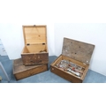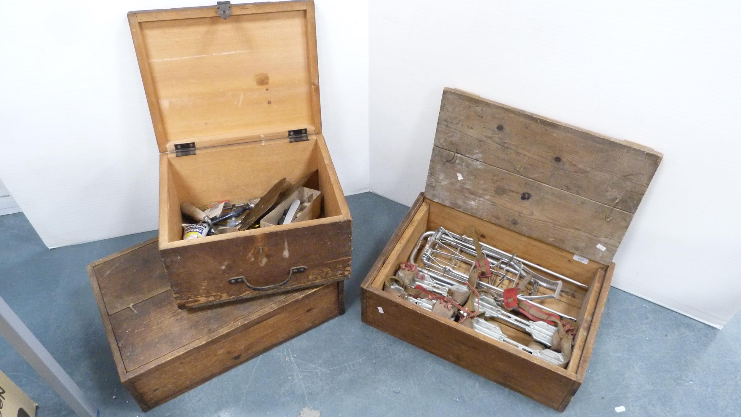 Two wooden crates containing Gipron roller skates, also tools, chisels etc., and another empty crate.
