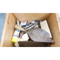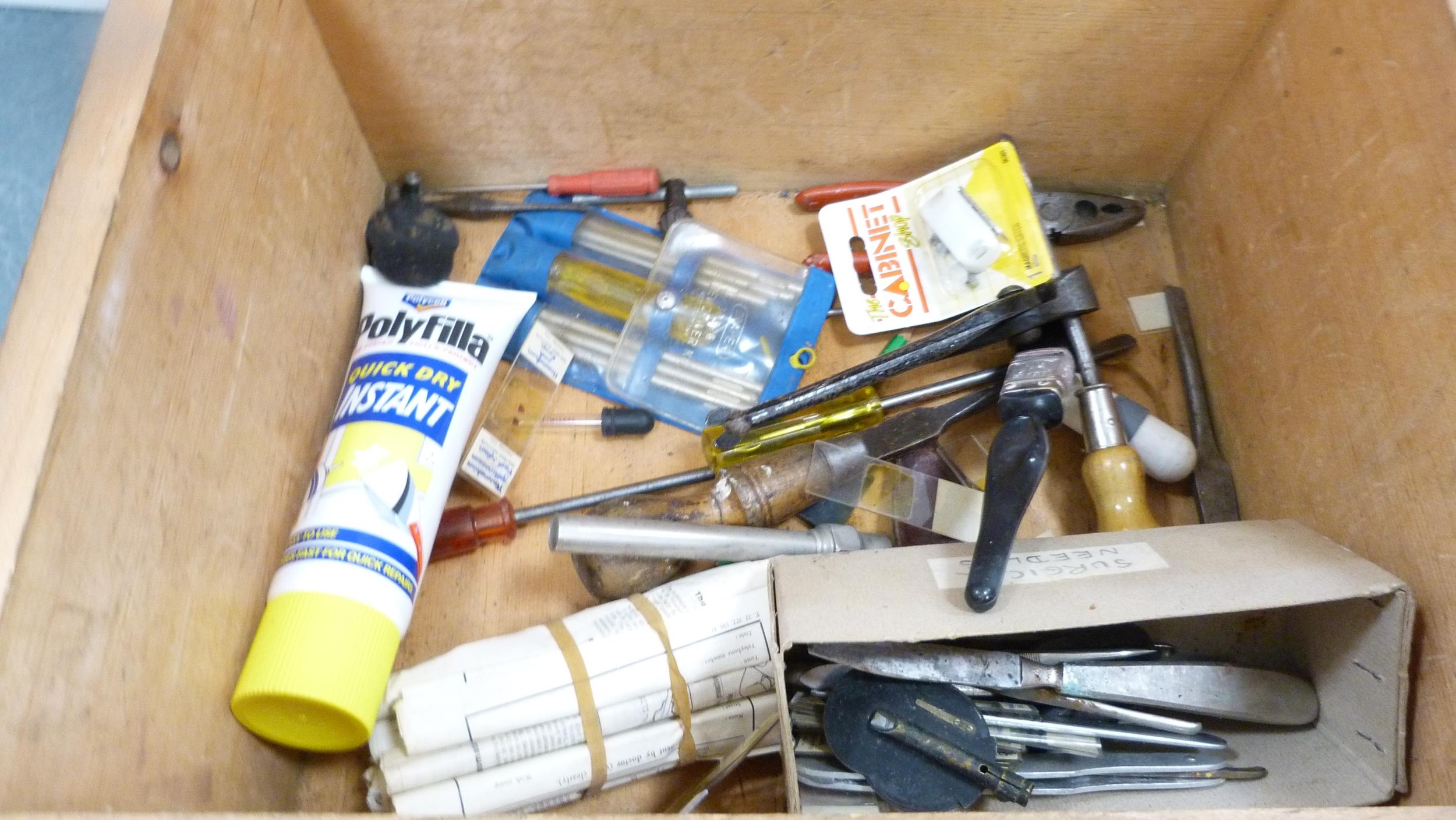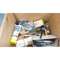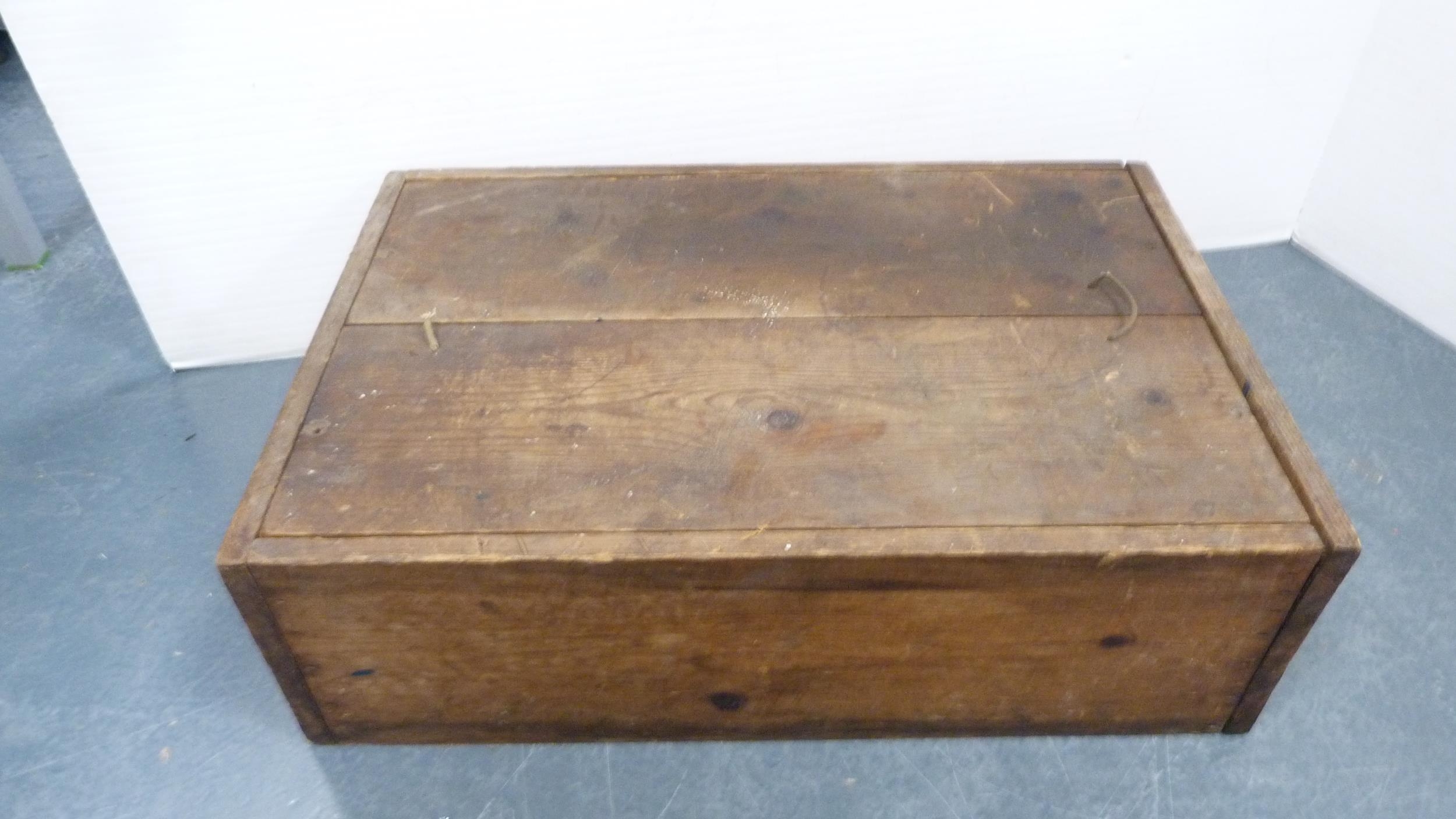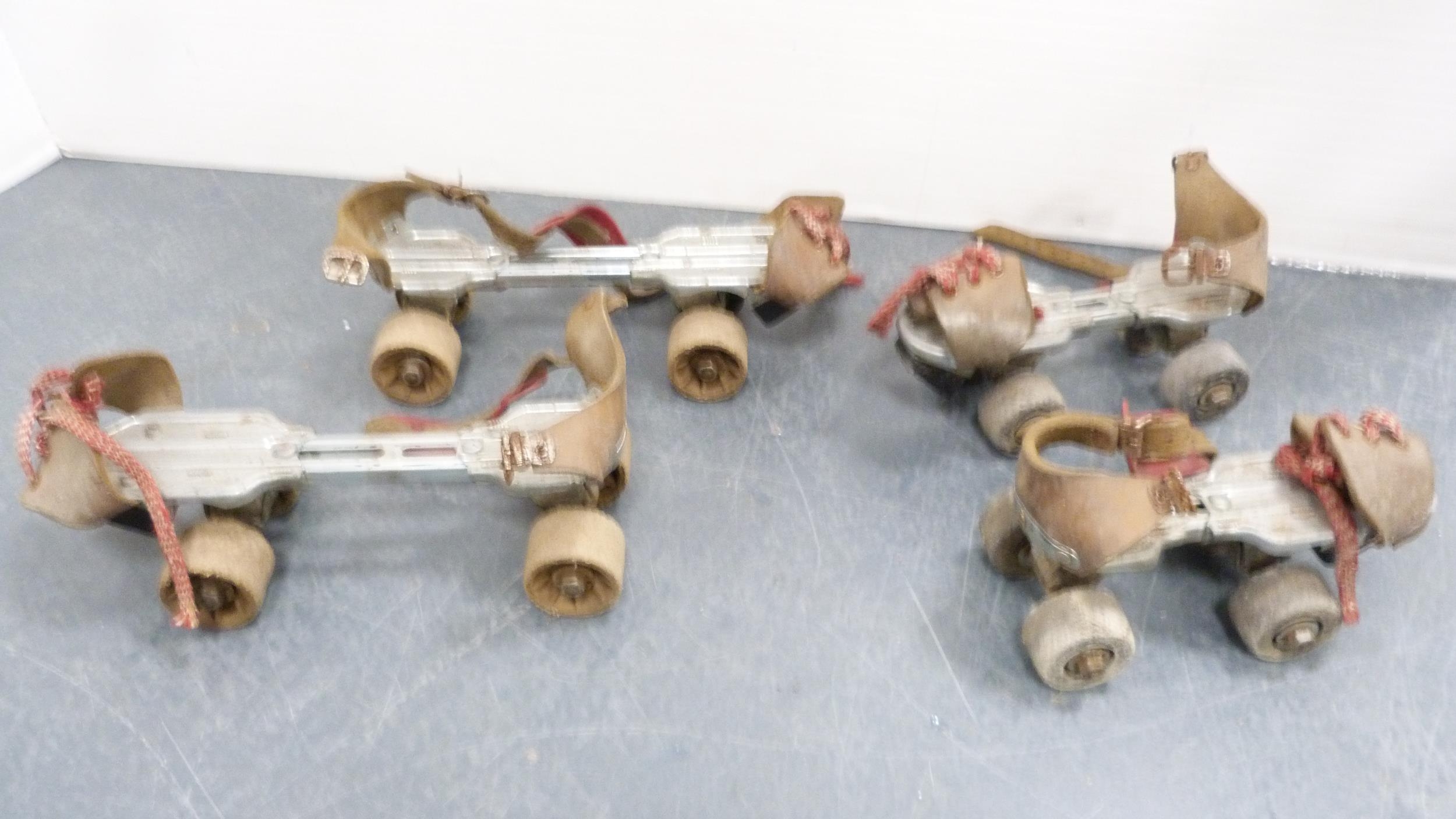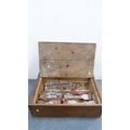 Two wooden crates containing Gipron roller skates, also tools, chisels etc., and another empty crate.