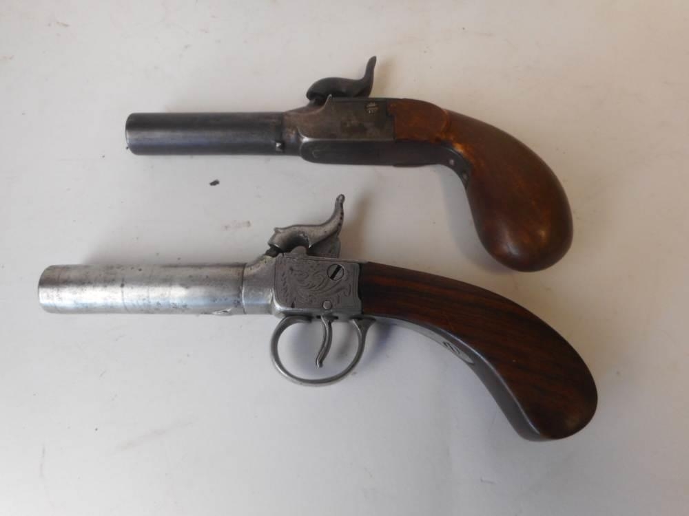 A 19th century percussion pocket pistol: with 7.25cm turn-off barrel, scroll engraved plates and walnut grip, 18.5cm long together with a similar percussion pocket pistol with 6cm turn-off barrel and folding trigger, 16.5cm long.