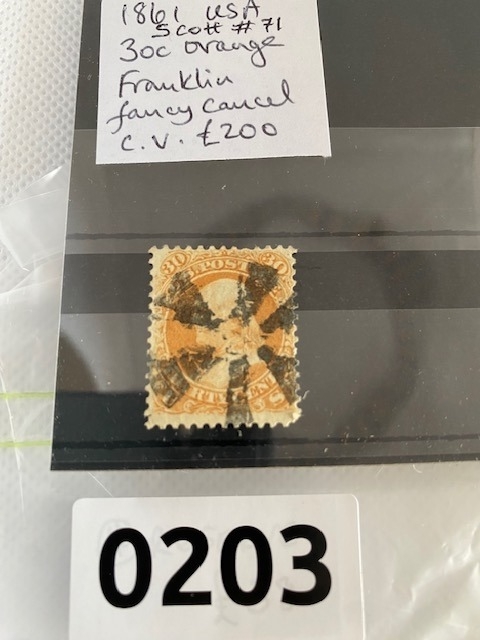 American Franklin 30c orange stamp with fancy sunburst cancel, high cat value £ 200, USA 1861
