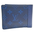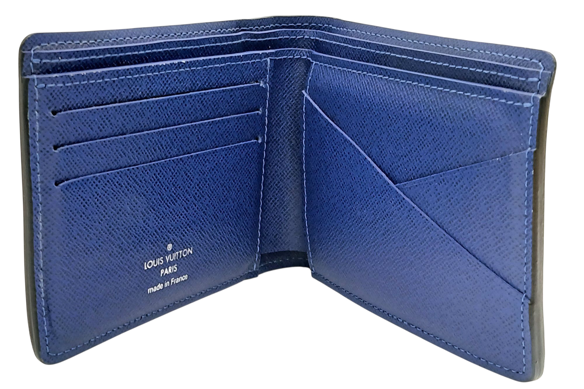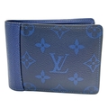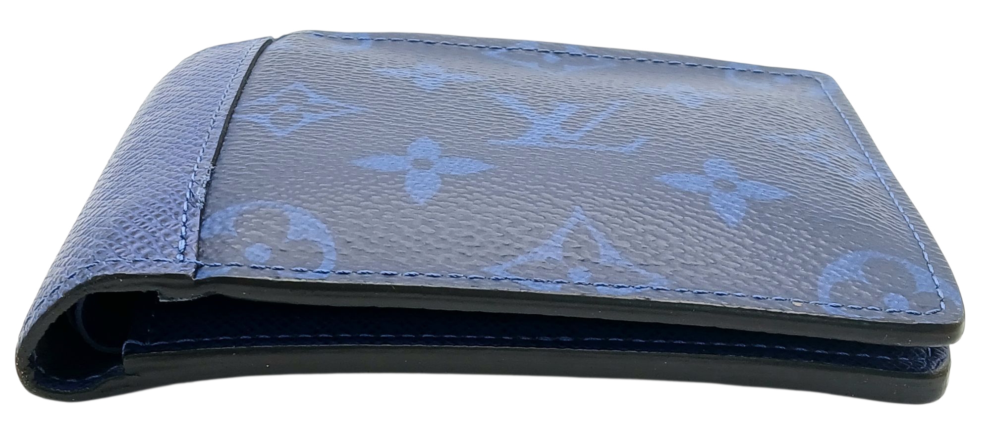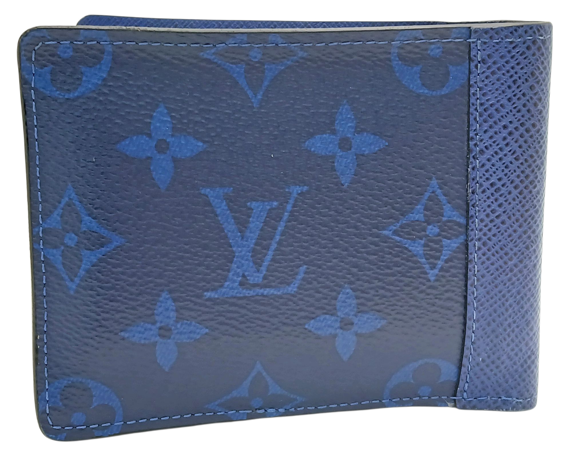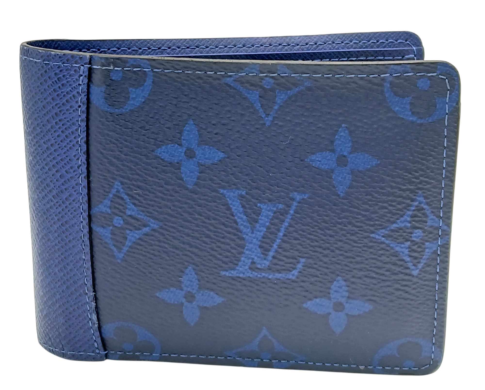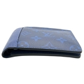 A Louis Vuitton Blue Monogram Eclipse Canvas Bifold Wallet. Blue monogram-printed coated canvas exterior with tonal blue LV logos and floral motifs. Blue leather interior and includes eight card slots, two slip pockets, and two full-length compartments for notes. Some minor signs of wear exterior but in good condition overall. Approx 12cm width x 9cm height when folded. Please see photos or request a condition report. Ref: STK022910