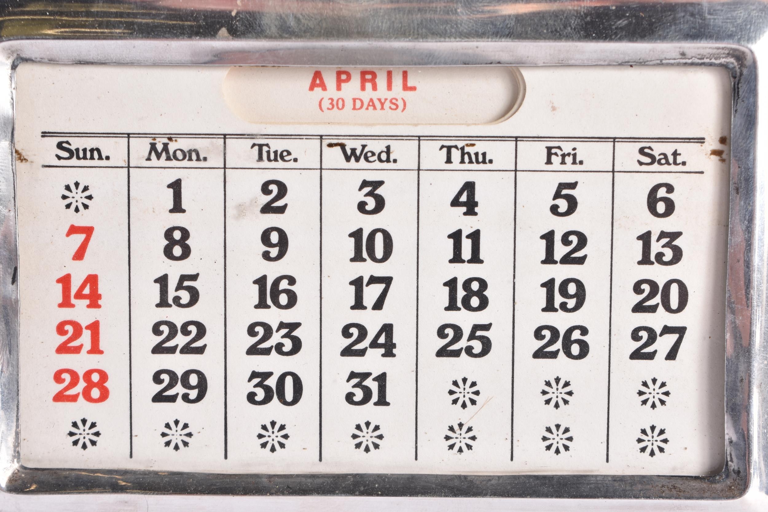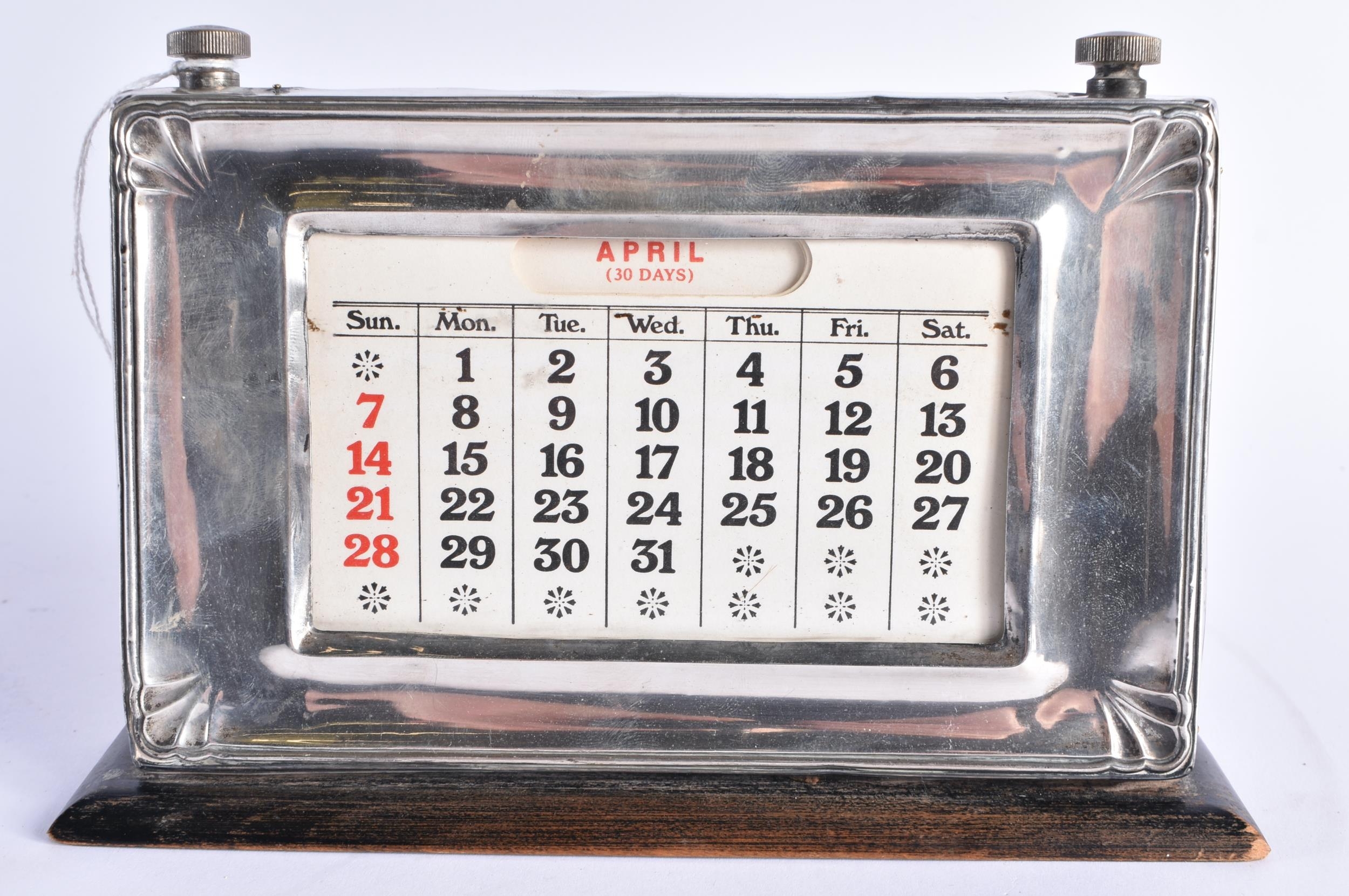 AN ART DECO SILVER MOUNTED WOOD DESK STAND CALENDER. Birmingham 1930. 19 cm x 15 cm.