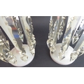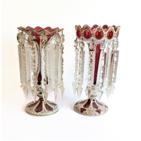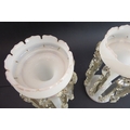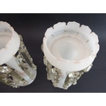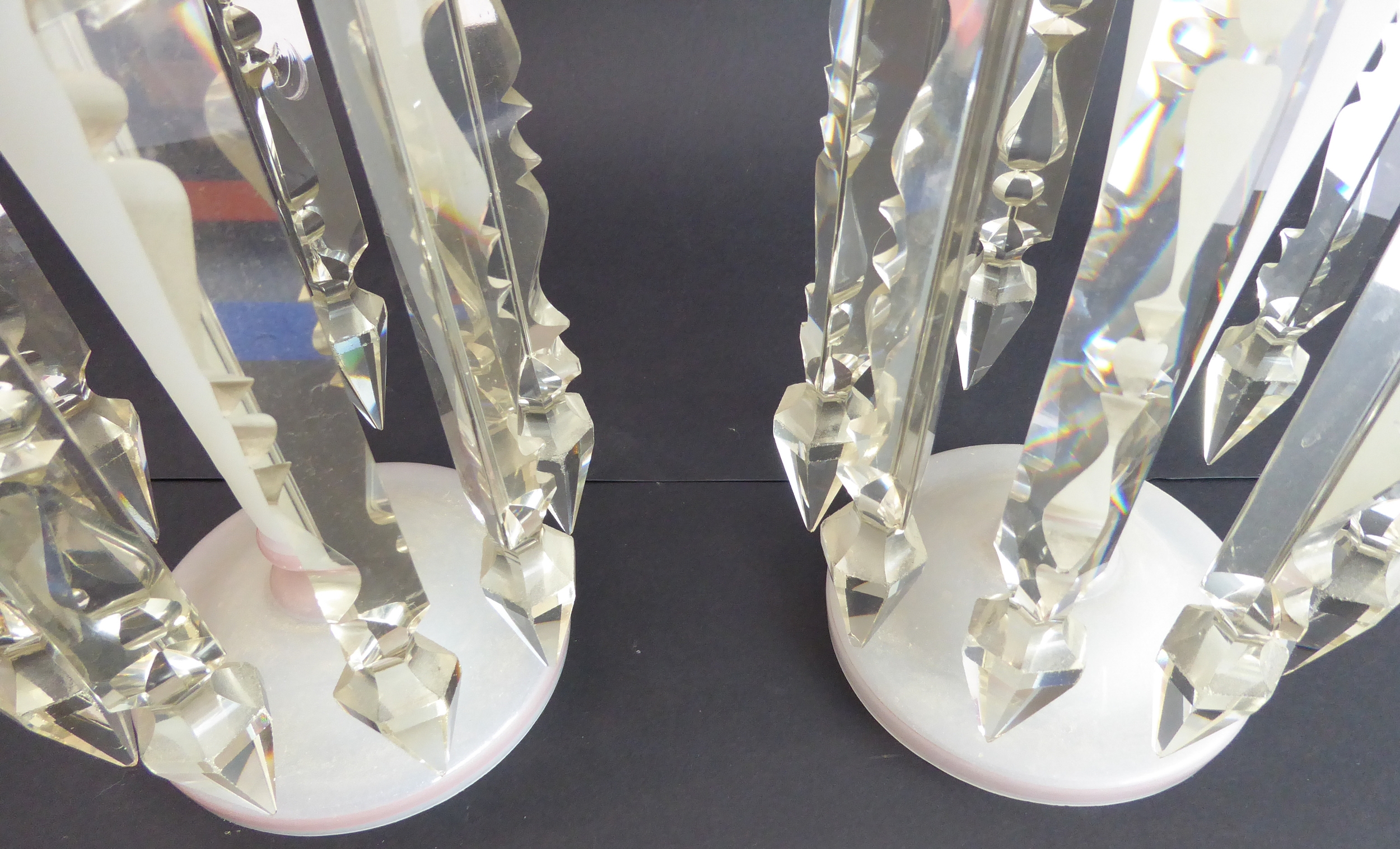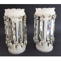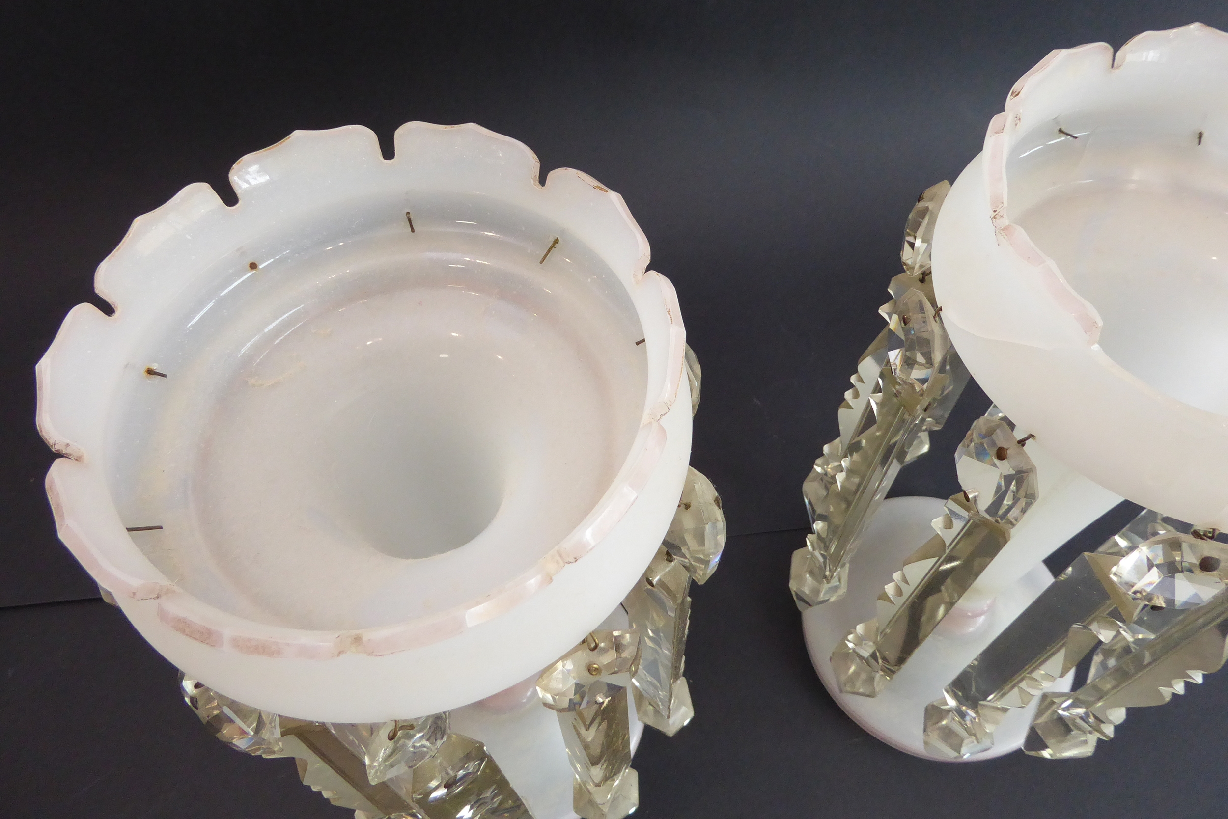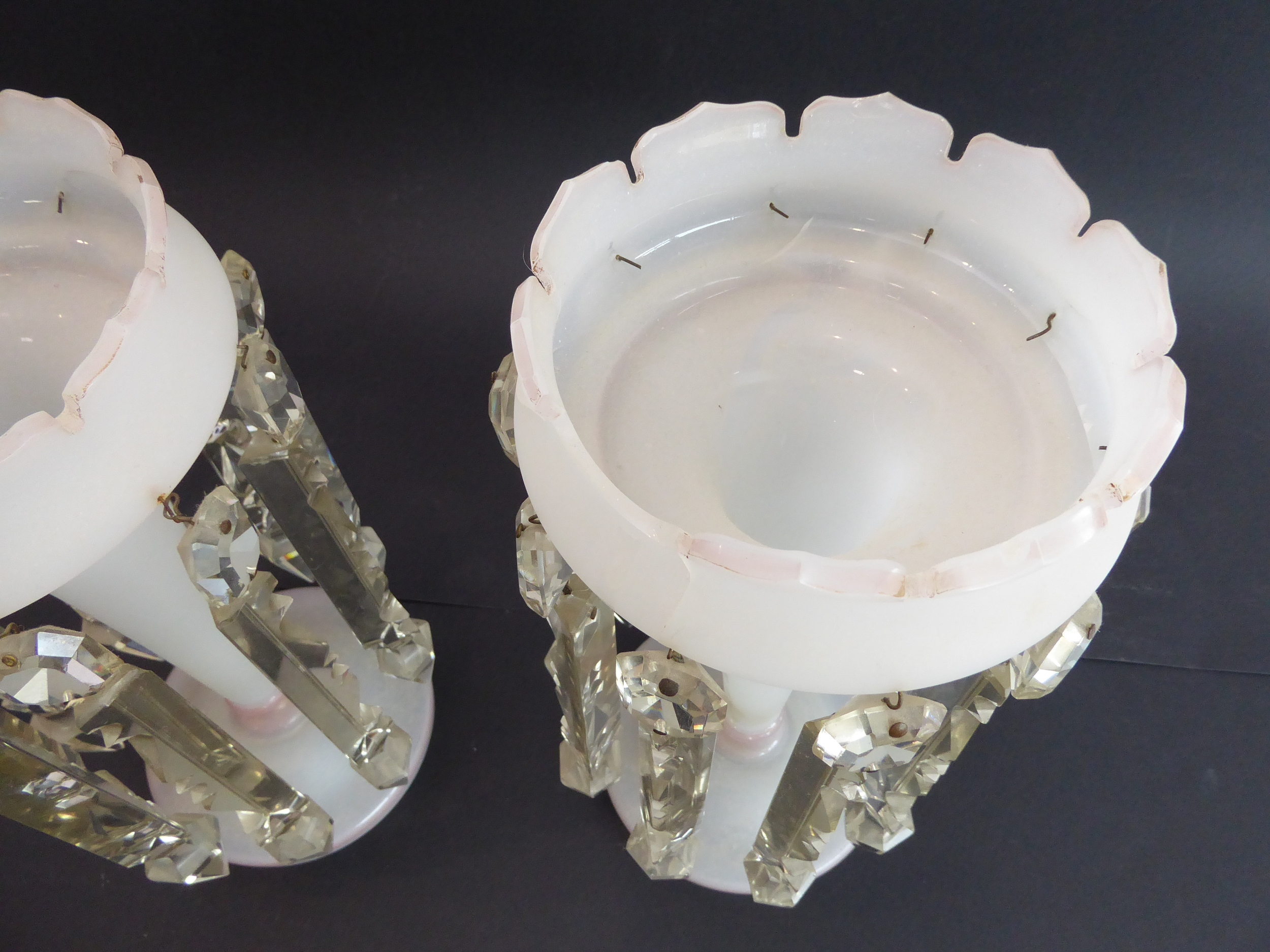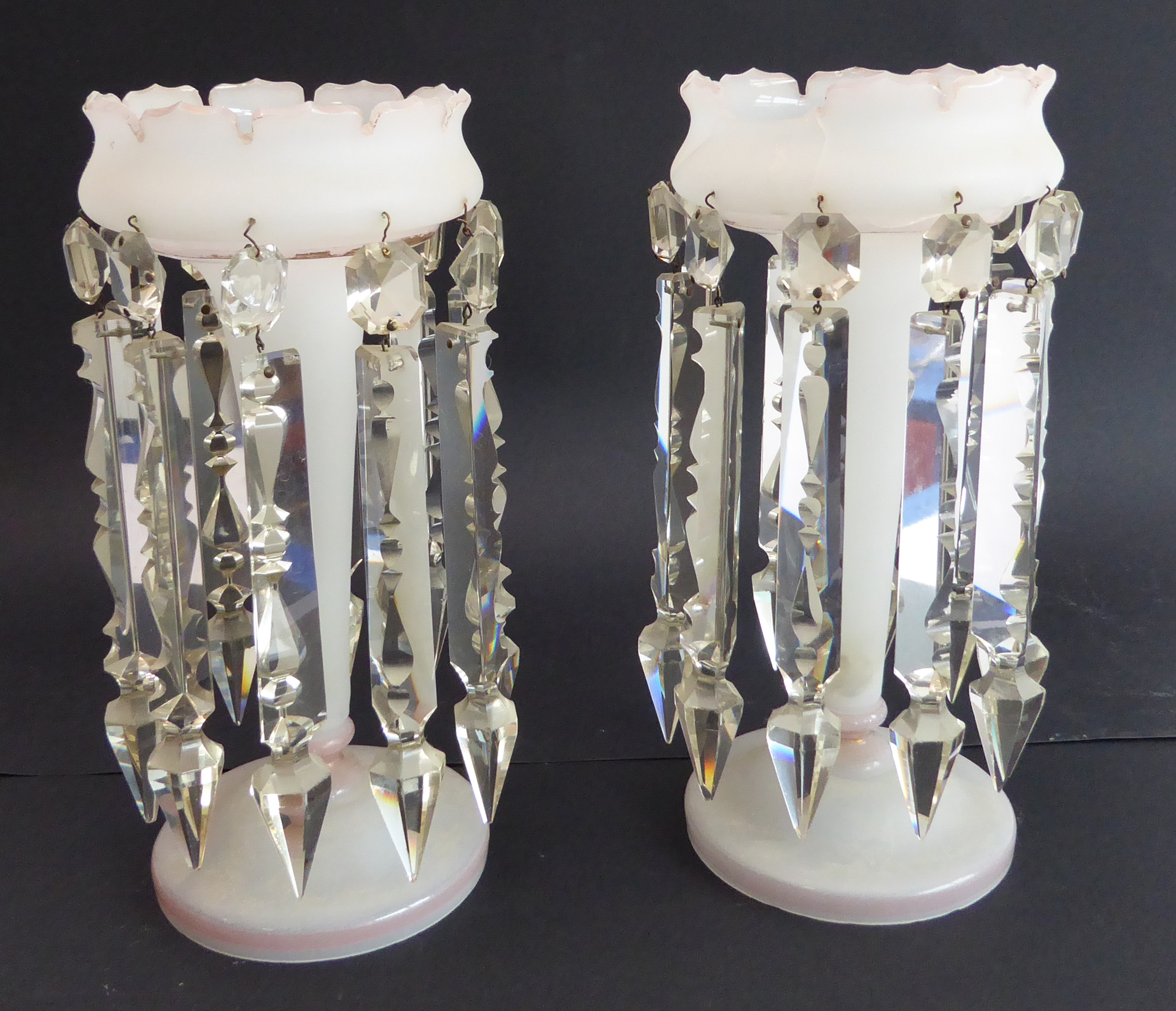 A pair of 19th century opaline glass table lustres on cream and pink tinged circular bases (29.5 cm high)