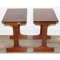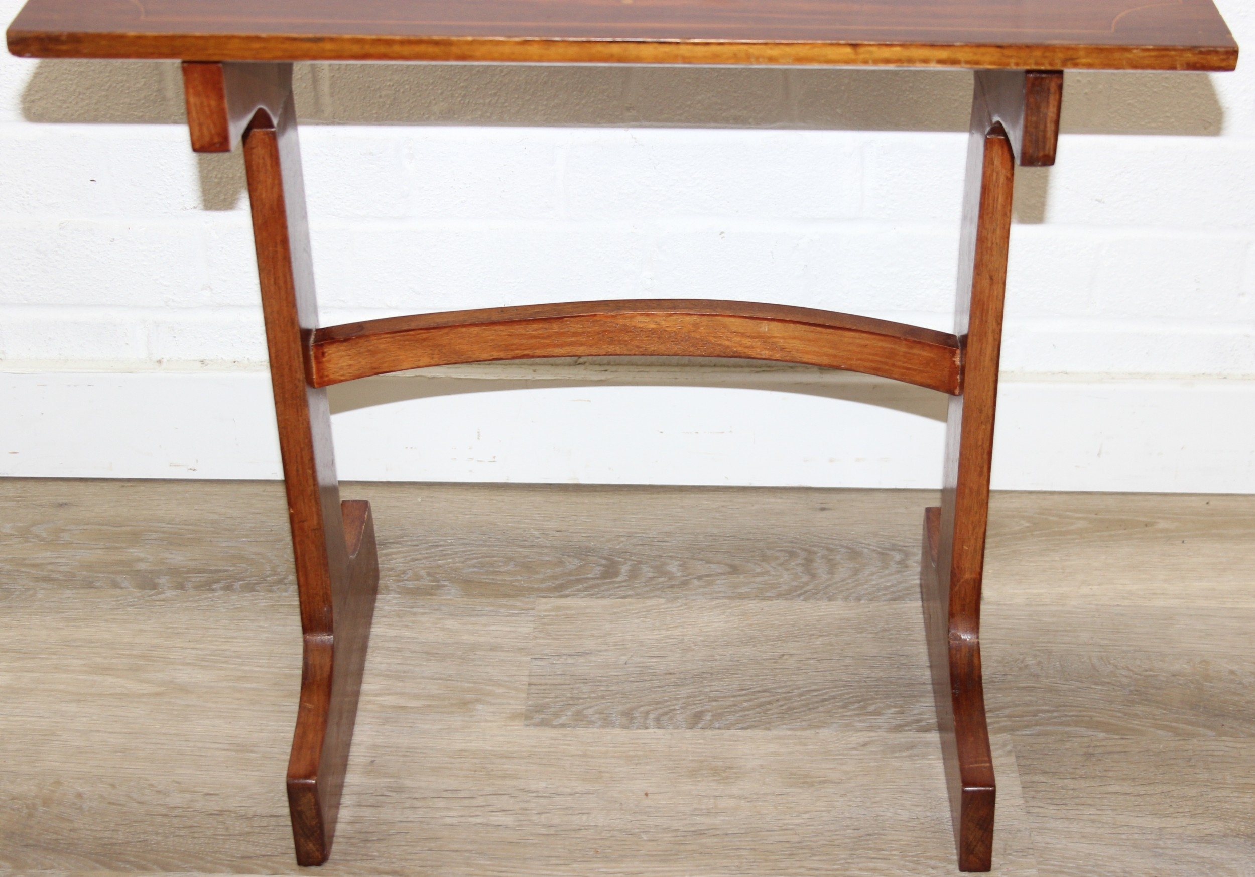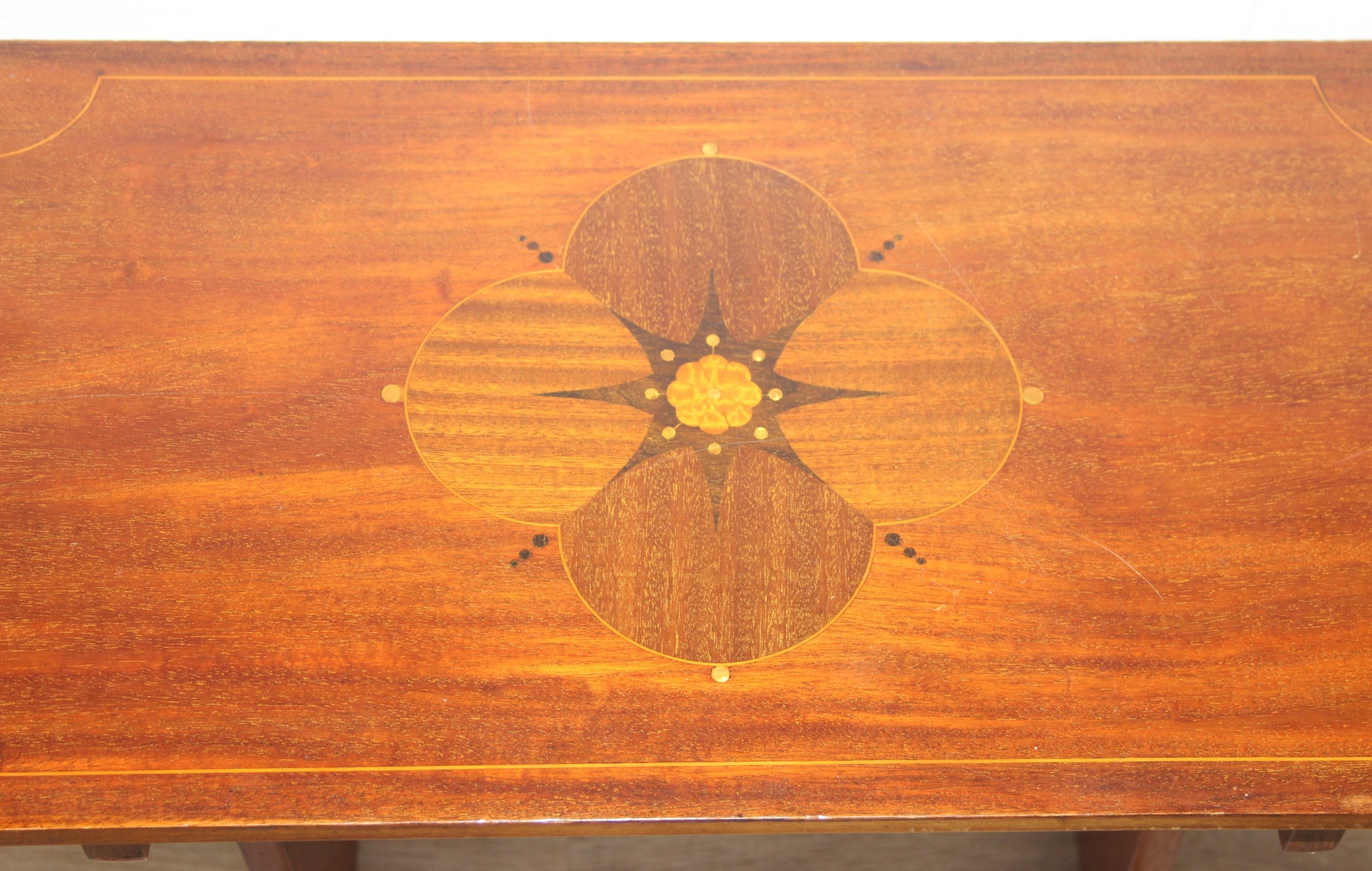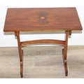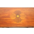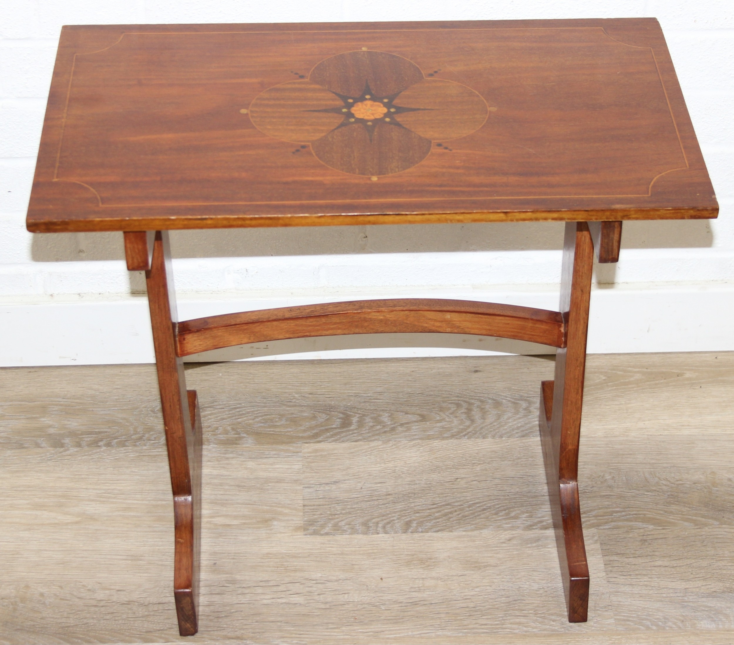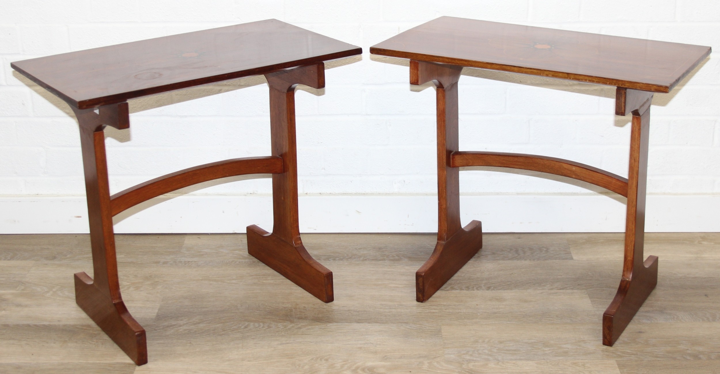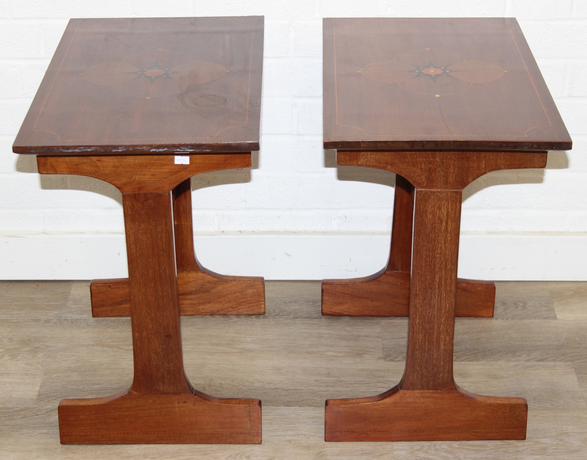 Two mahogany side tables with decorative marquetry inlay, 20th century, each 60cm x 34cm x 55cm