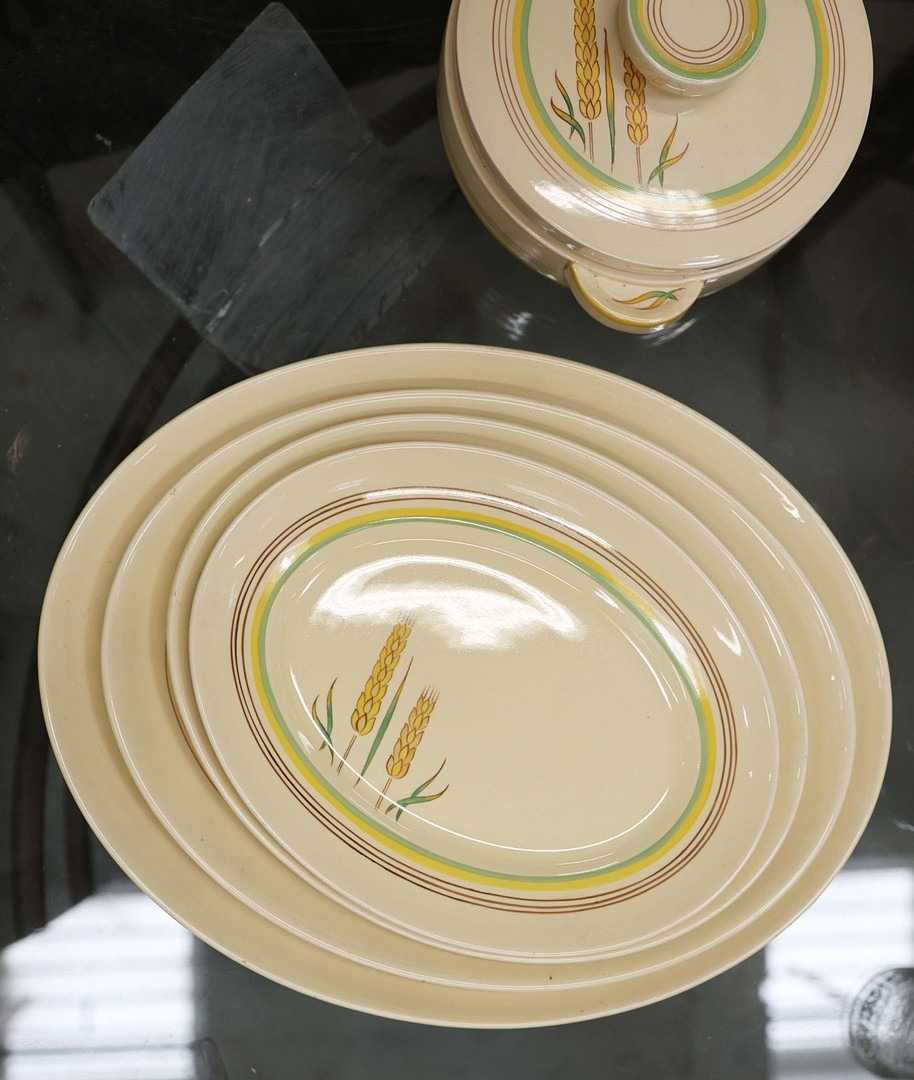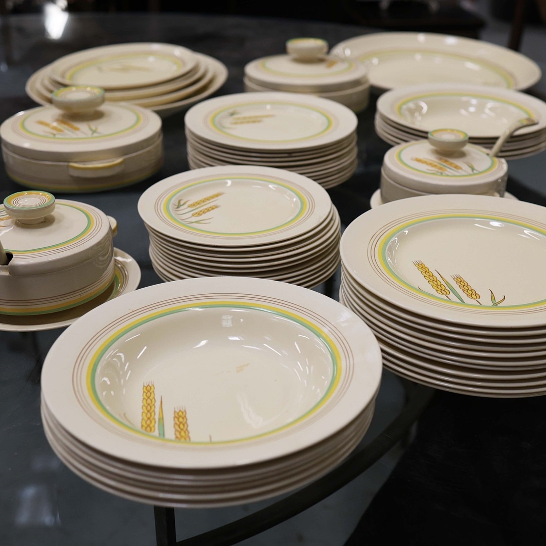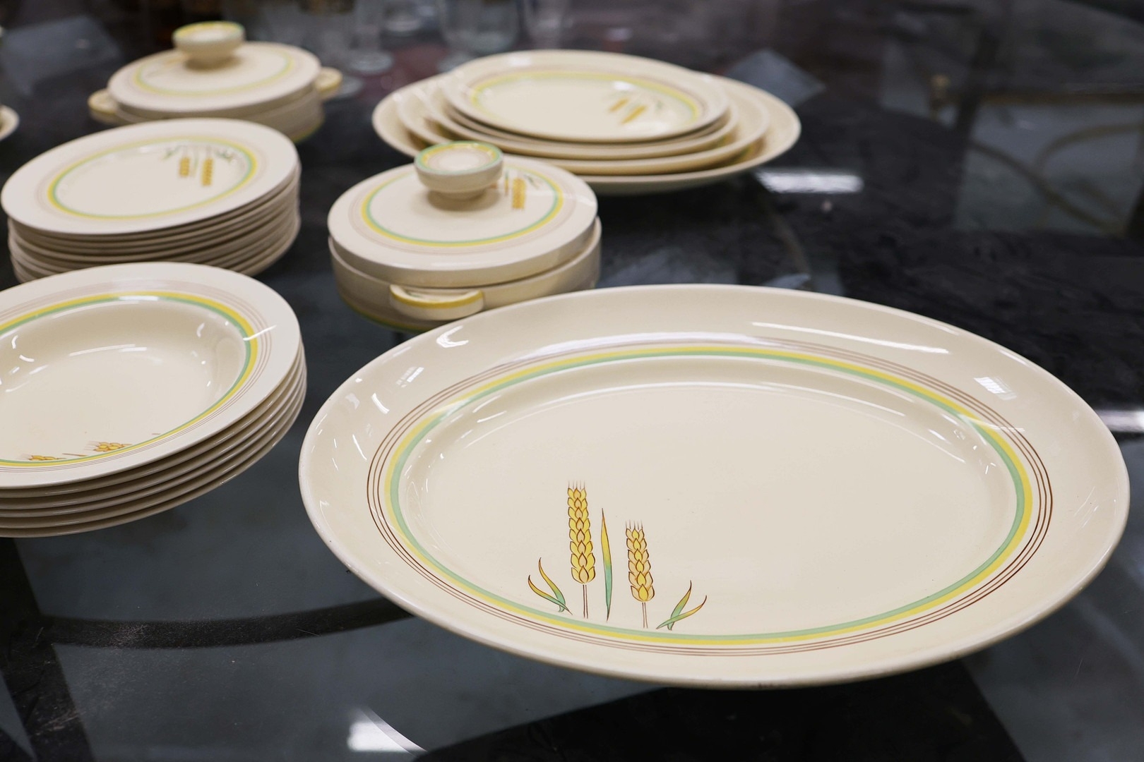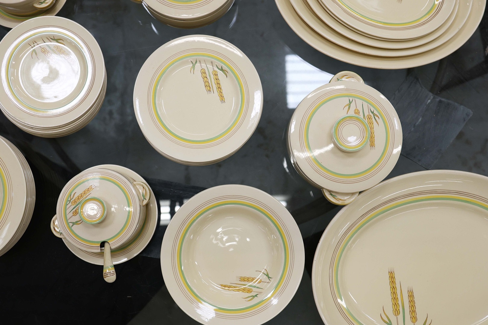 A CLARICE CLIFF 'WHEAT' PART DINNER SERVICE. 1930s, comprising eleven dinner plates, twelve breakfast plates, twelve side plates, twelve soup dishes, two soup tureens and stands, with ladles, two vegetable tureens, graduated meat plates, some stamped to bases with registration numbers '748856', (Q).